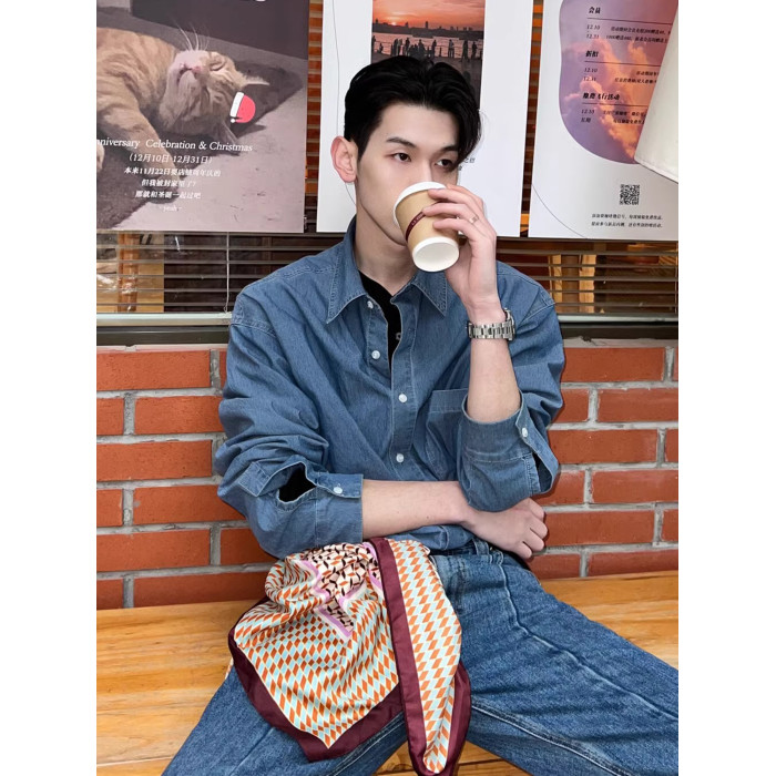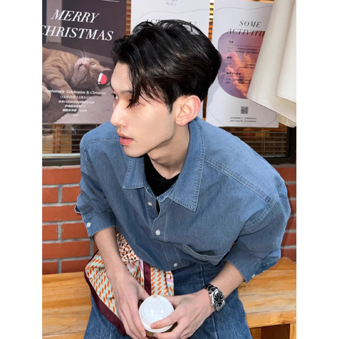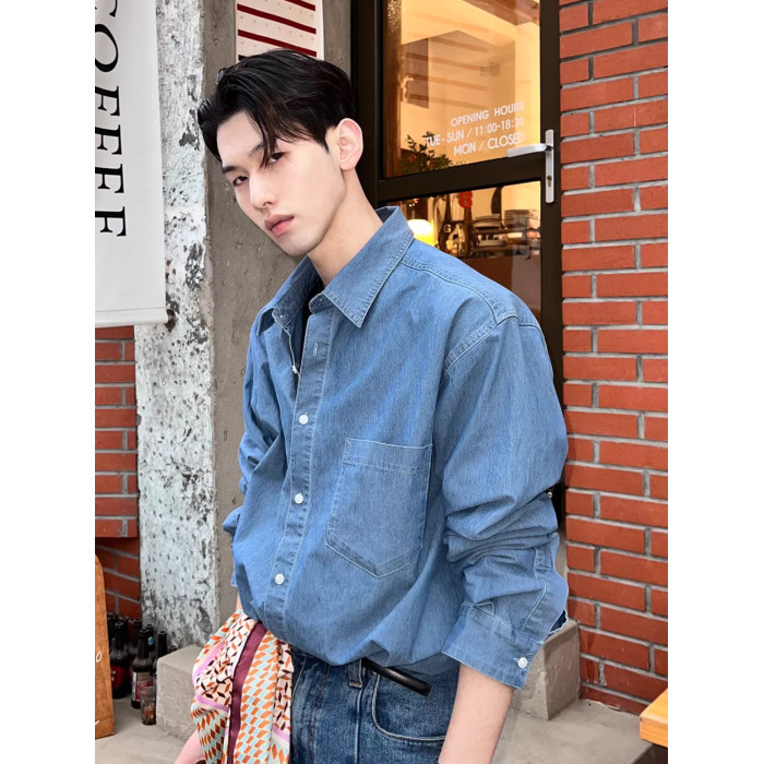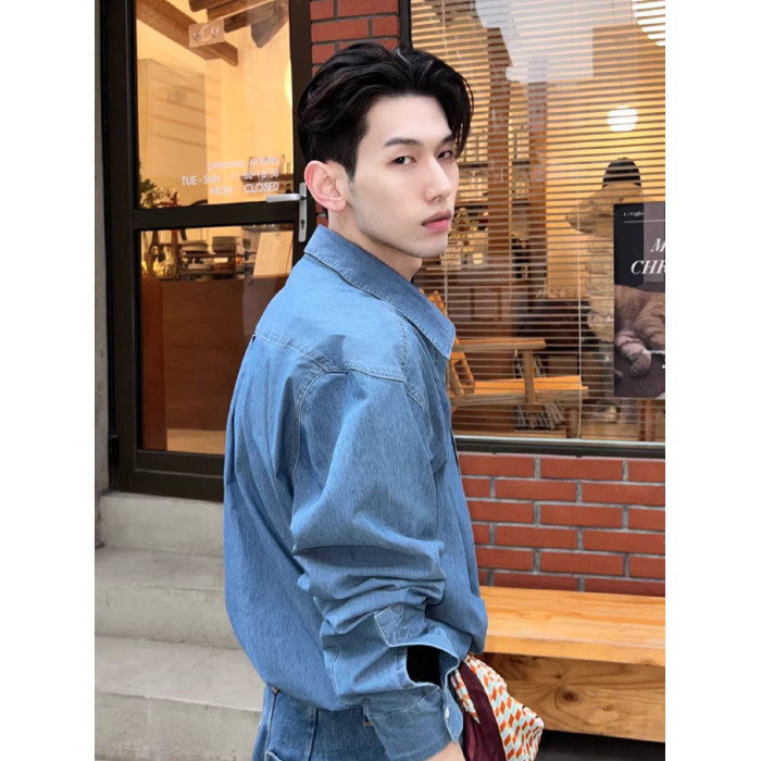 高級感水洗牛仔襯衫男士長袖韓版chic早春外套休閒寬松雅痞襯衣潮