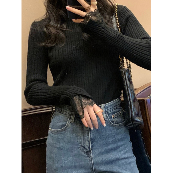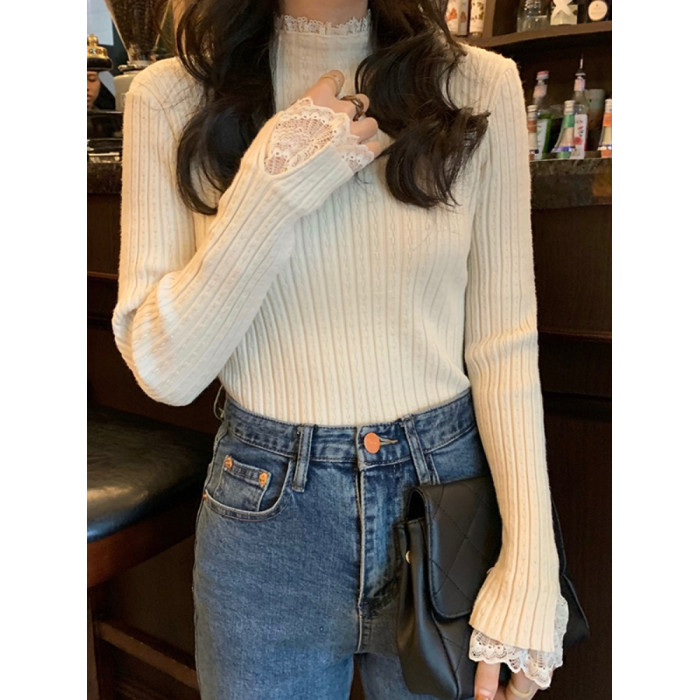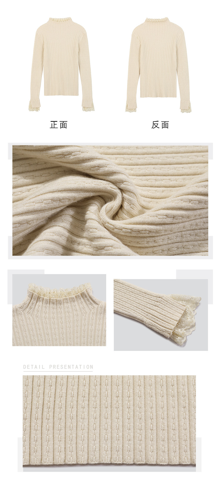 法式白色針織衫拼接蕾絲皮草內搭女秋冬顯瘦半高領毛衣打底衫上衣