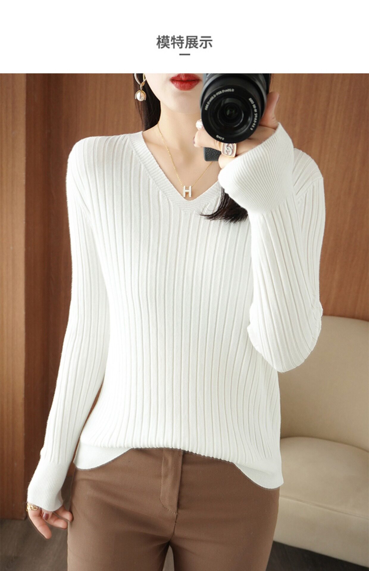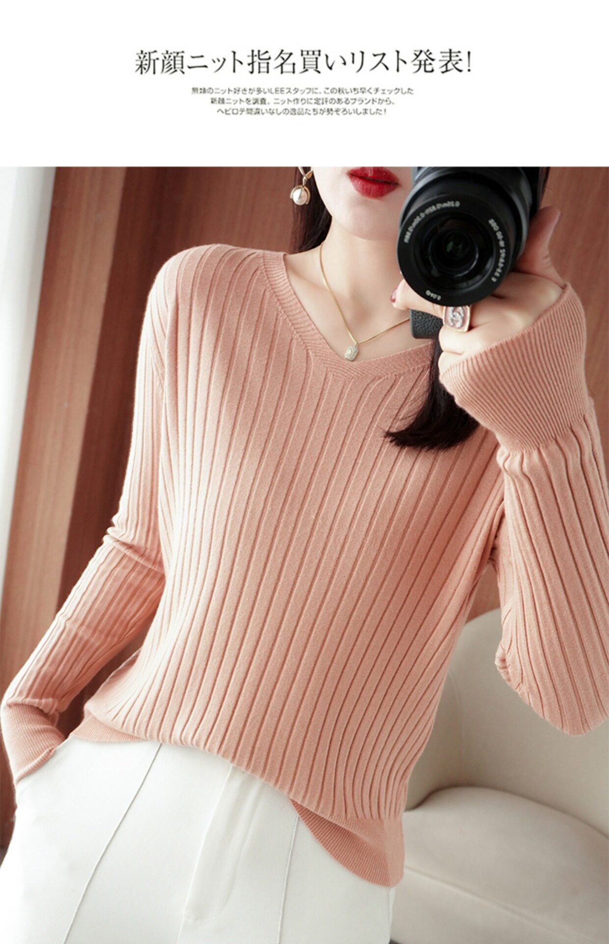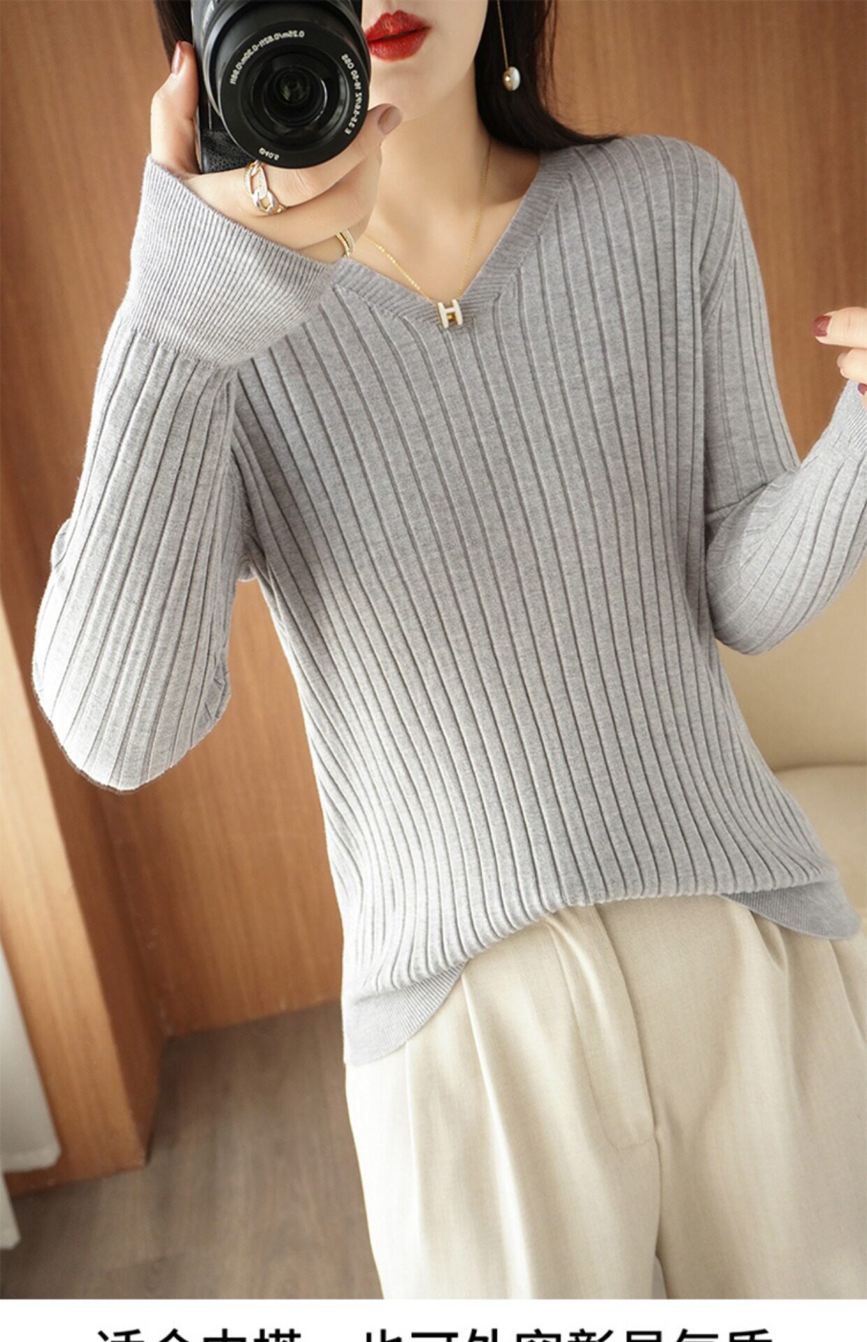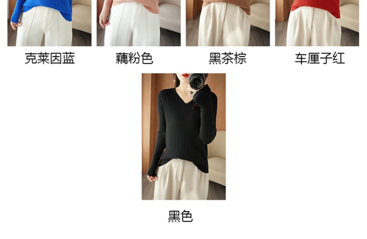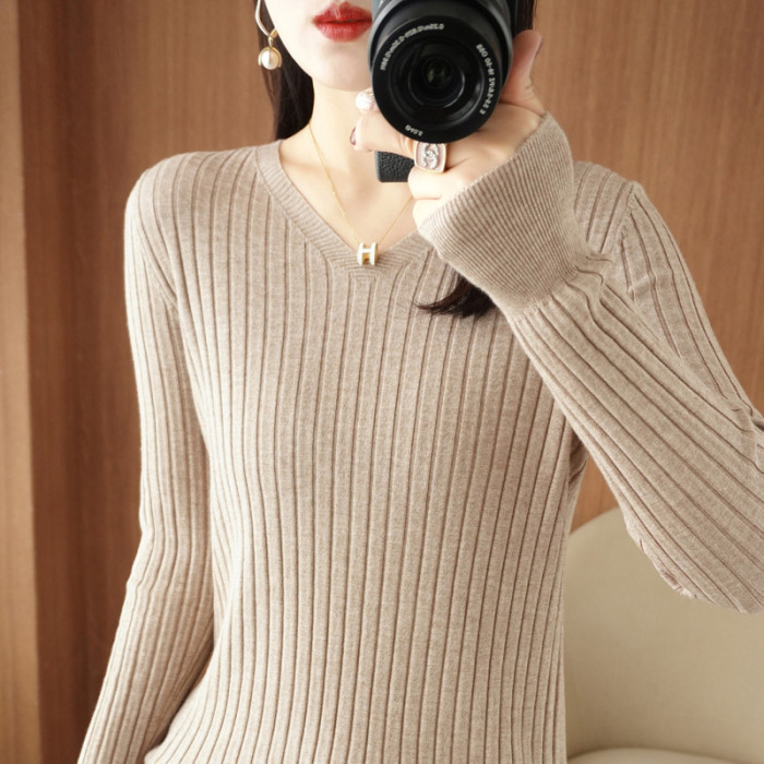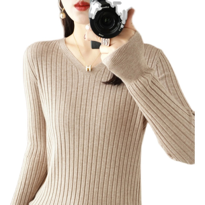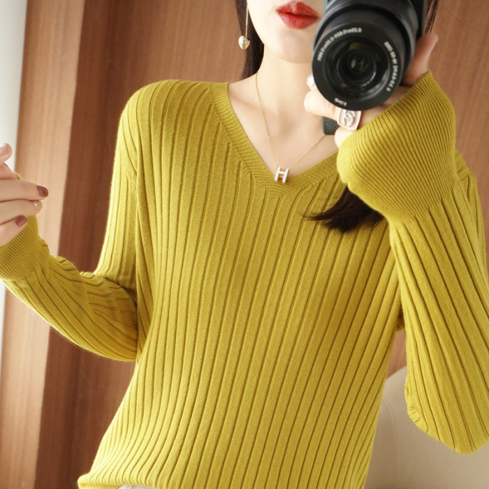新款長袖針織衫女V領坑條套頭打底衫秋冬寬松顯瘦休閒百搭羊毛衫