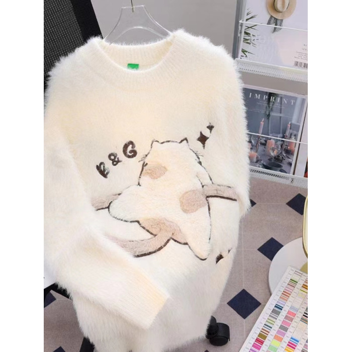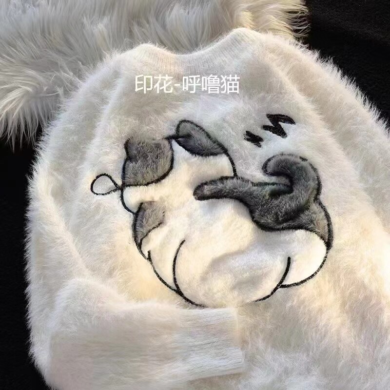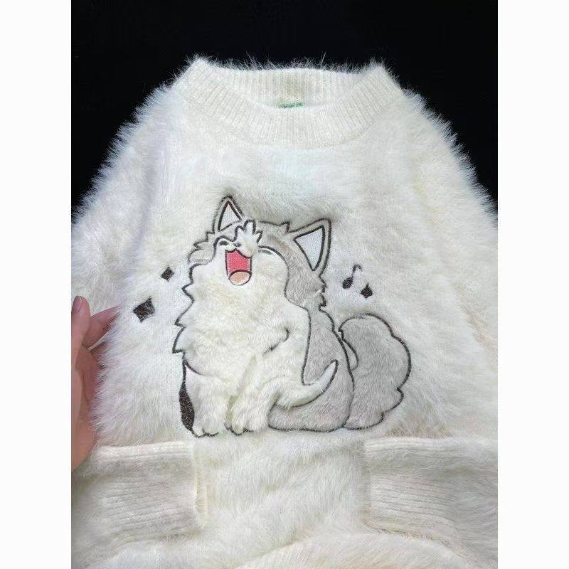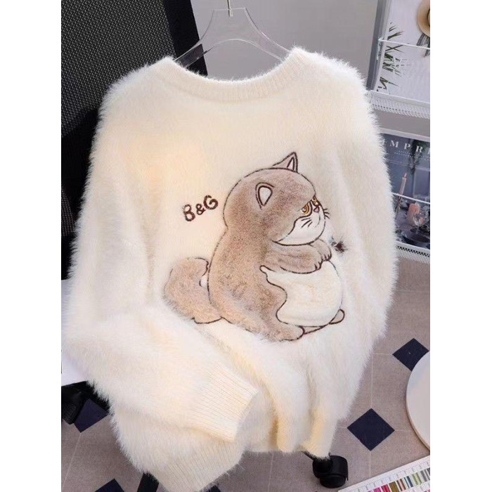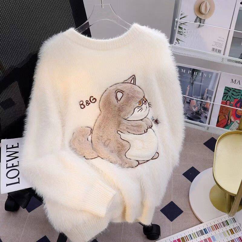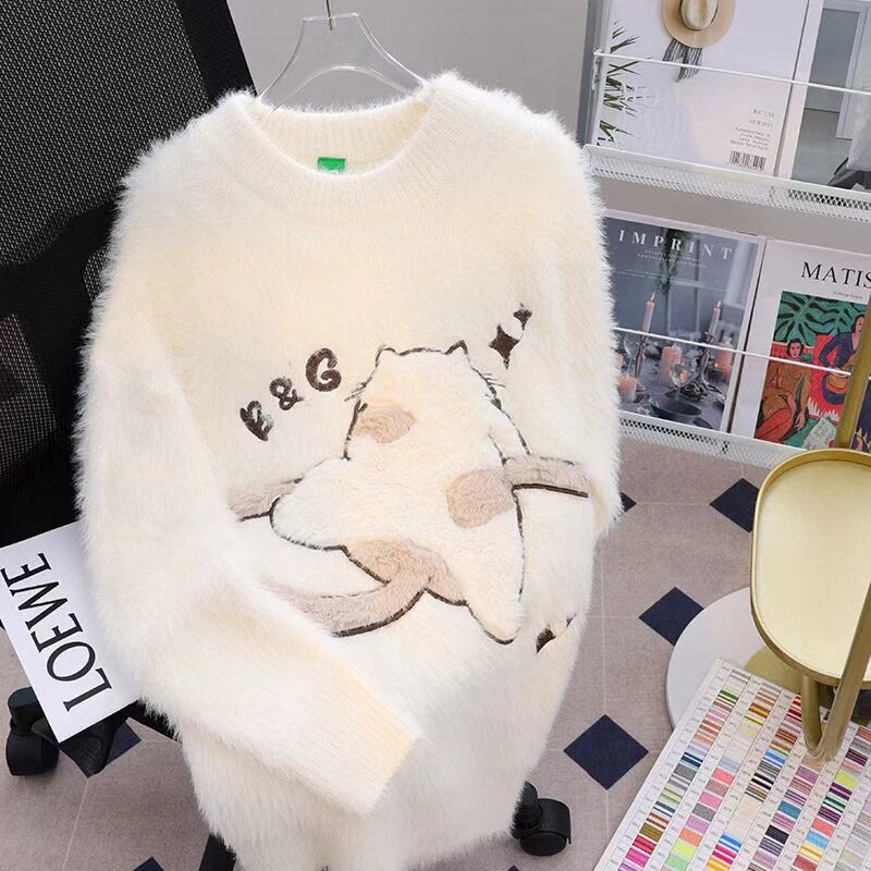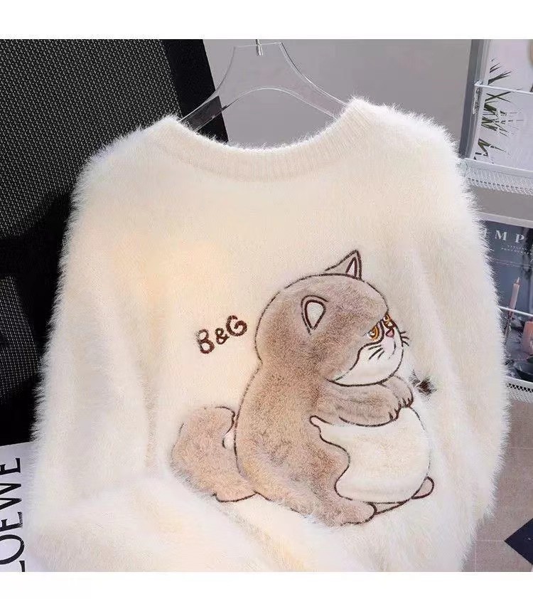 慵懶風仿貂絨卡通綉花毛衣女秋冬新款寬松針織打底衫軟糯植絨上衣