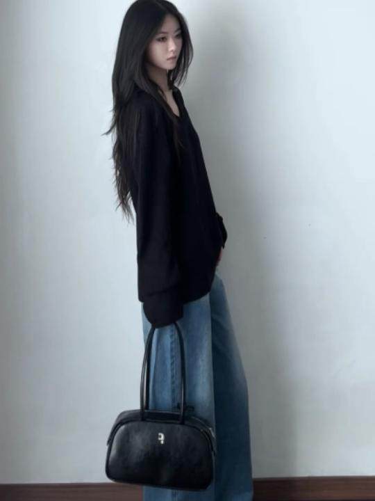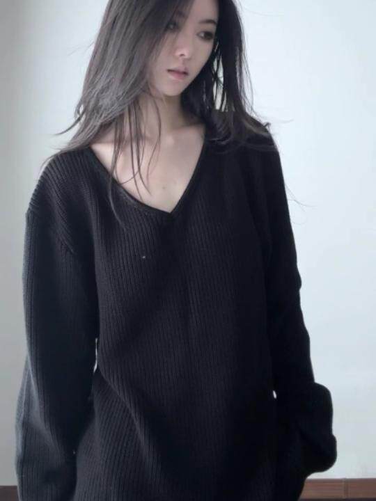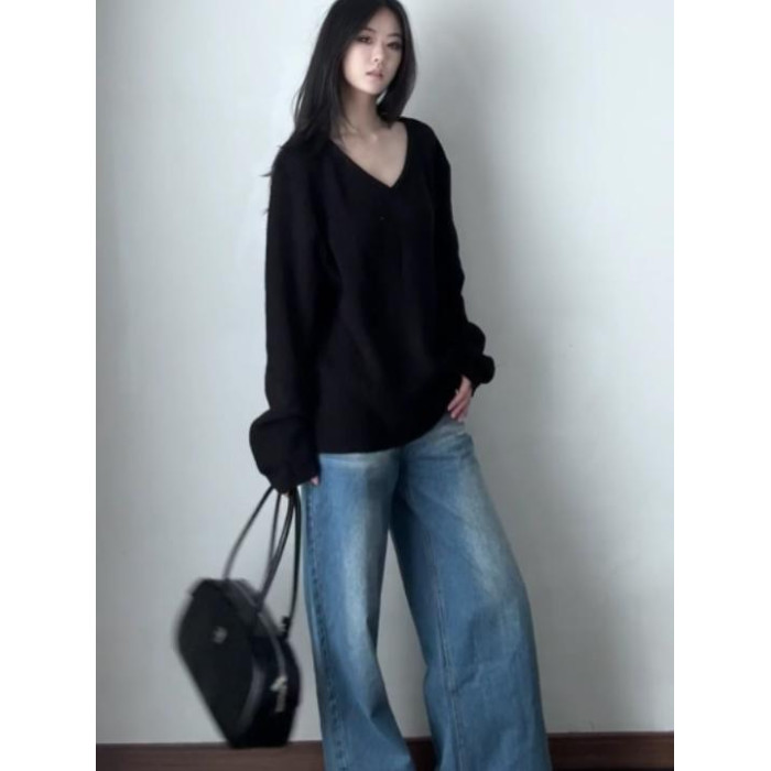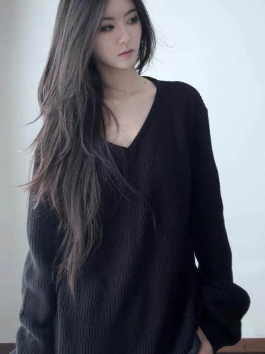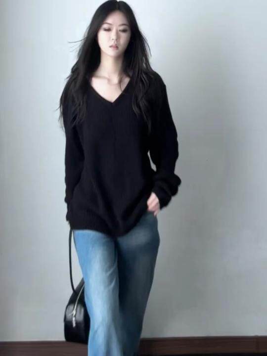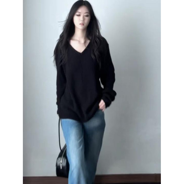 初秋慵懶高級感黑色V領套頭毛衣女寬松顯瘦2025新款針織外搭上衣