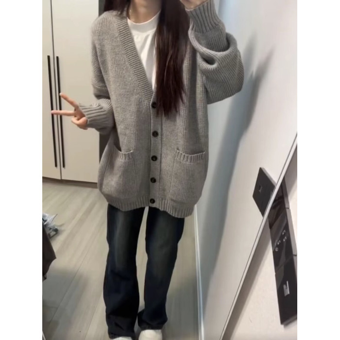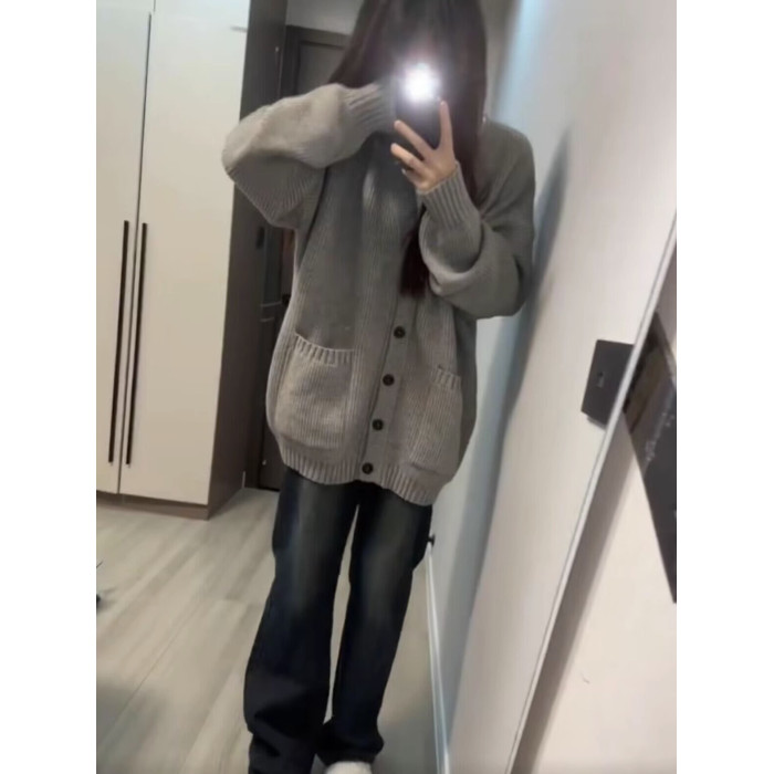 加厚版!慵懶風灰色單排釦毛衣開衫女外套秋裝新款韓版寬松針織衫