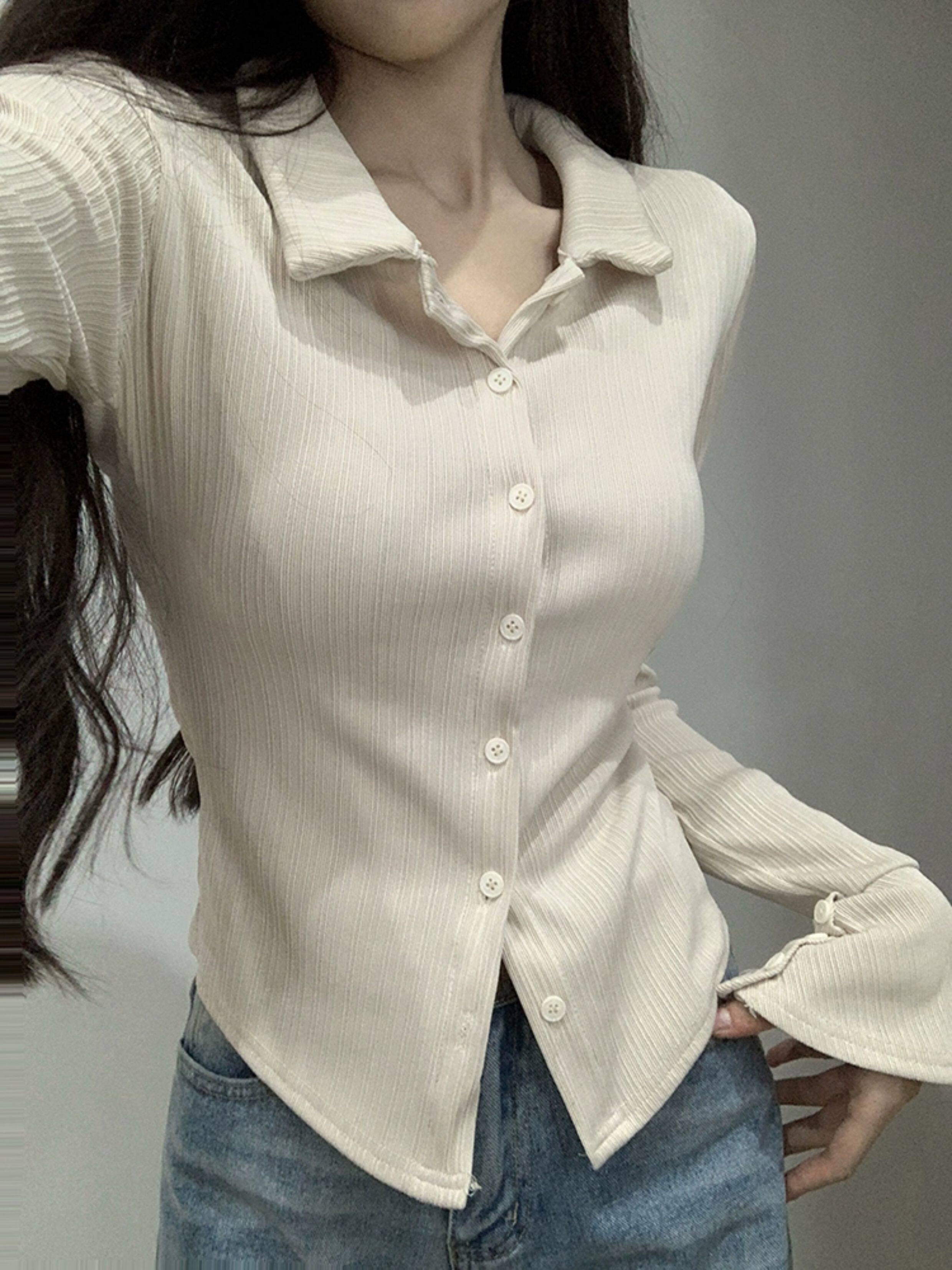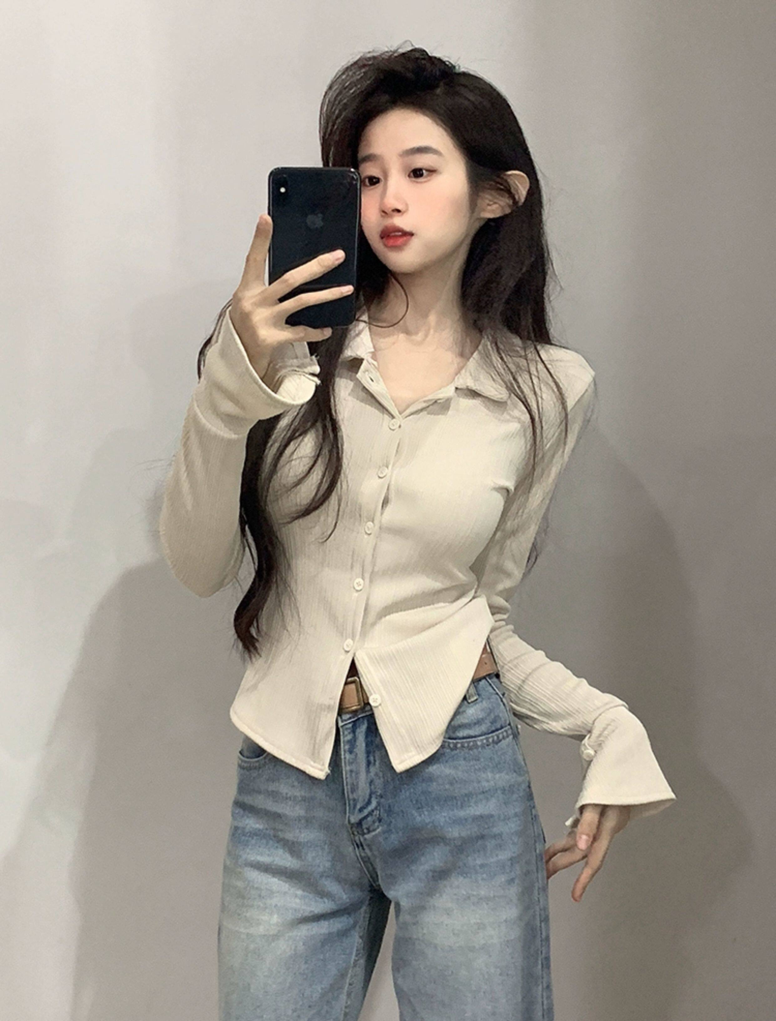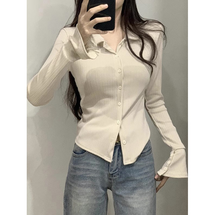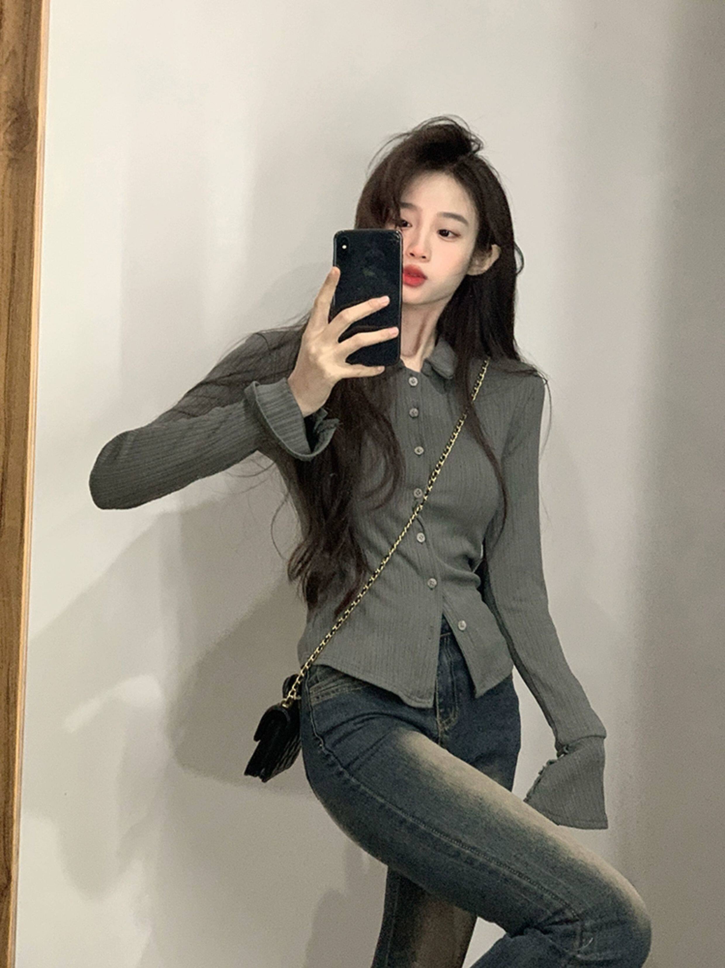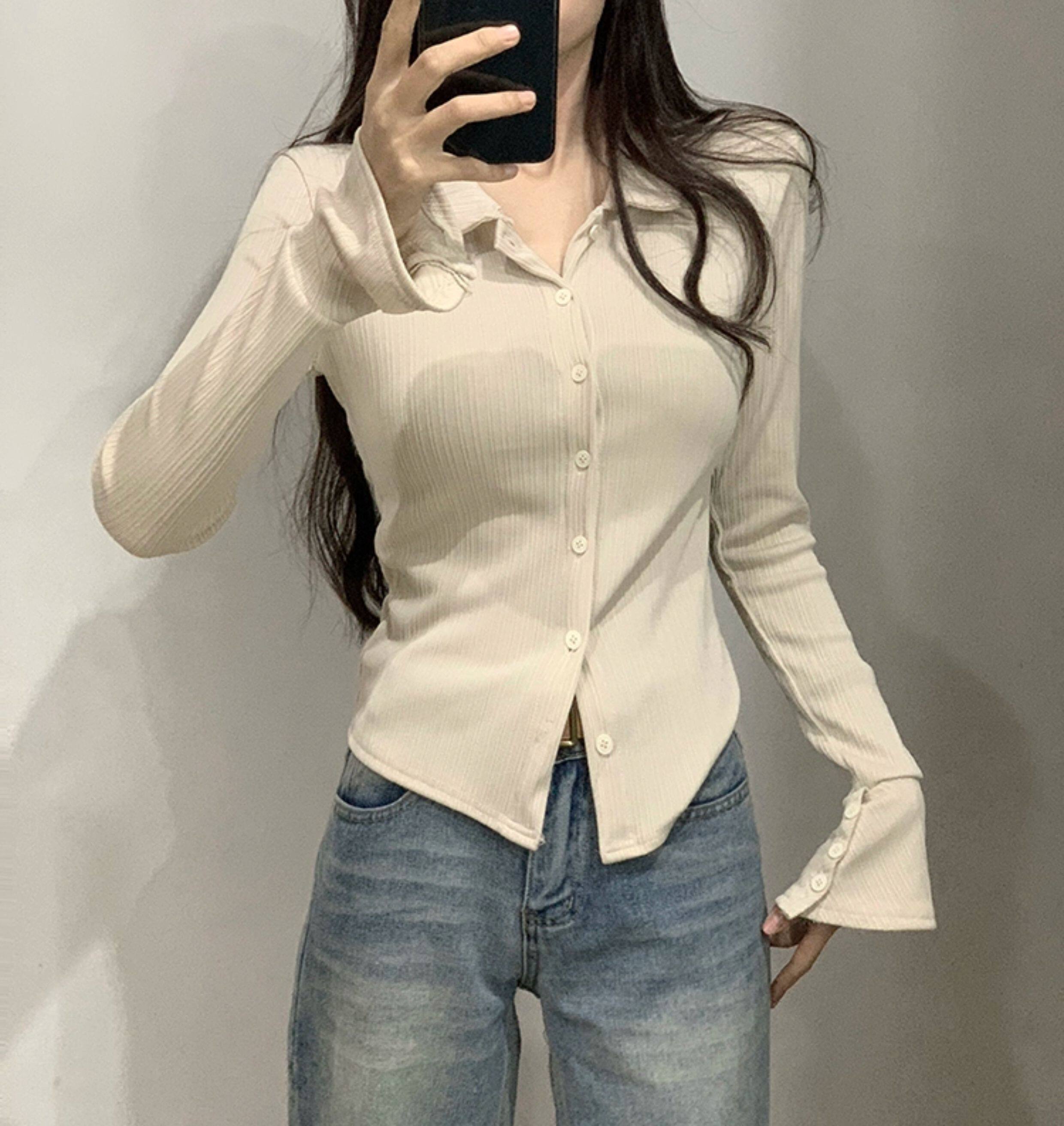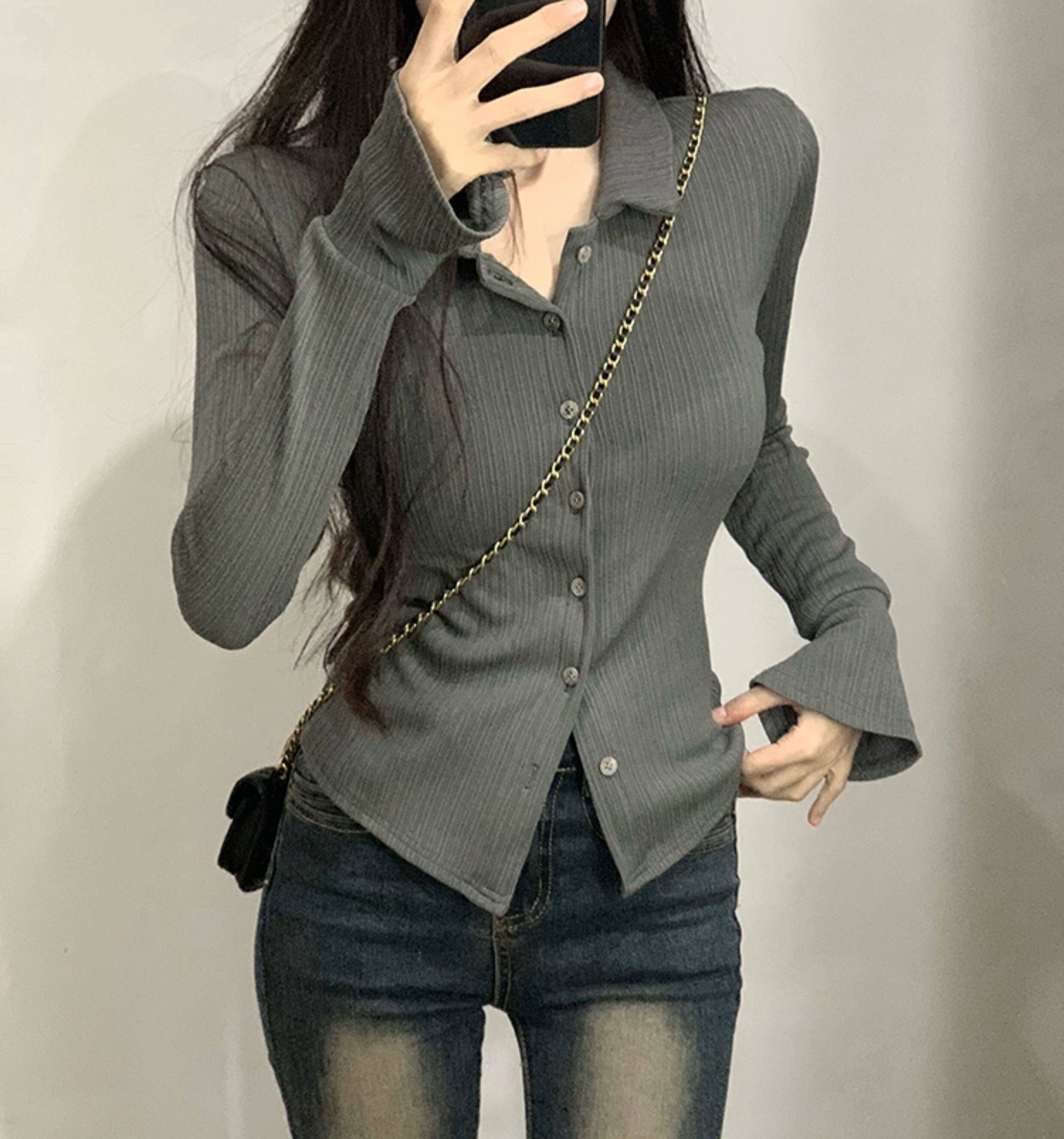 Polo領辣妹正肩長袖T恤女秋季設計感修身內搭打底衫喇叭袖上衣潮