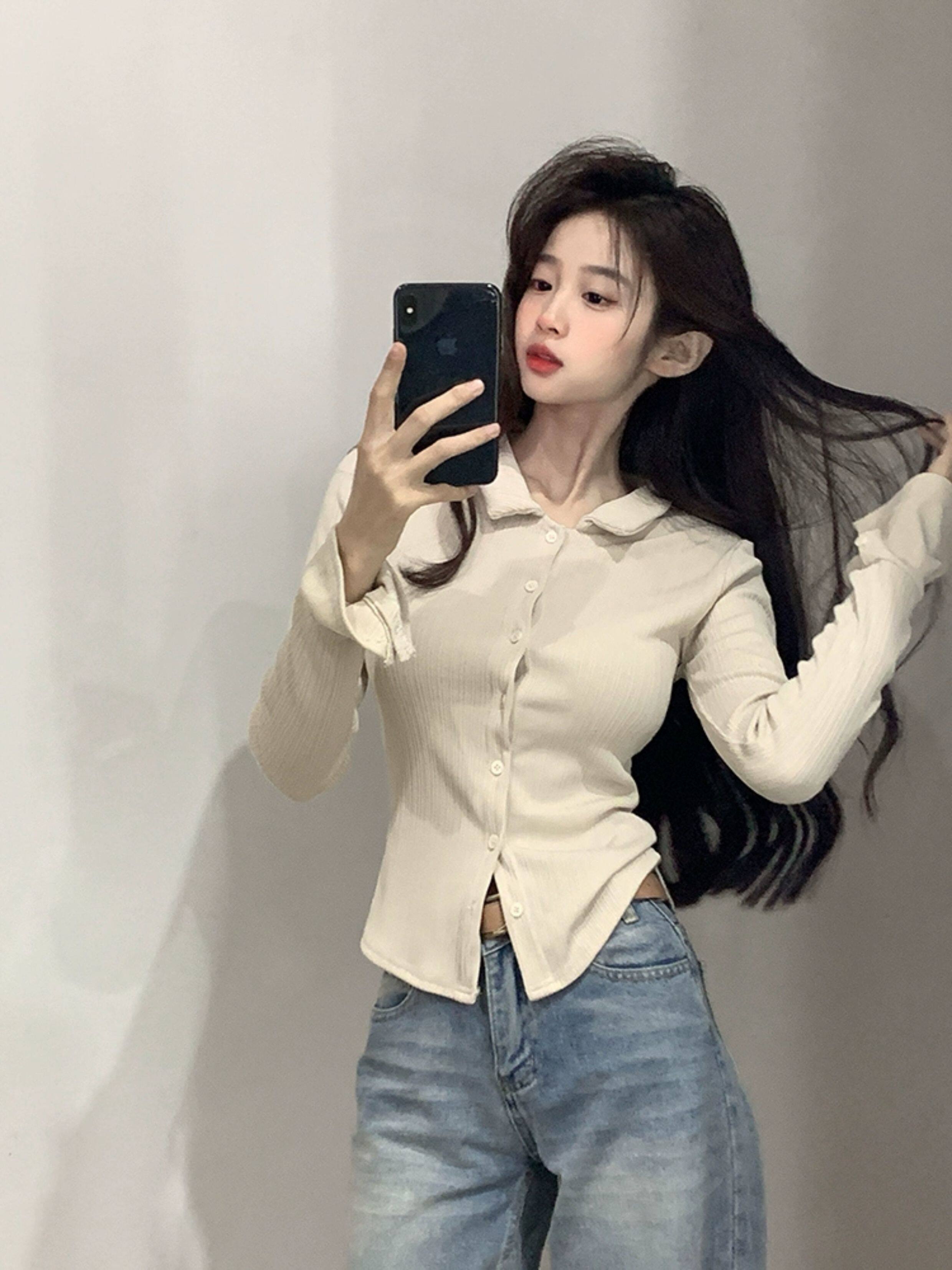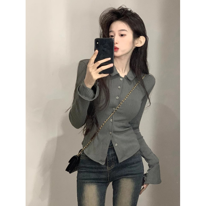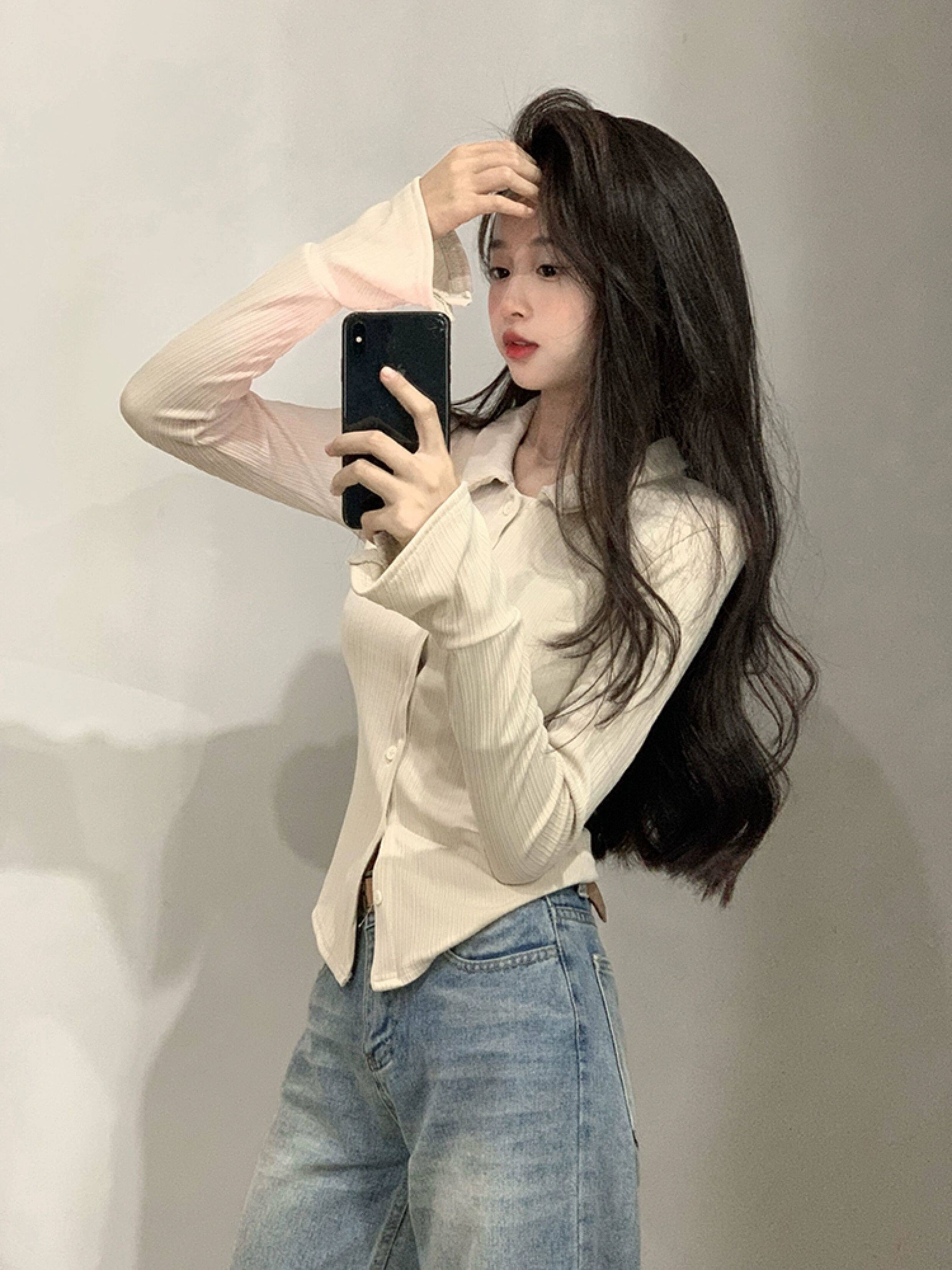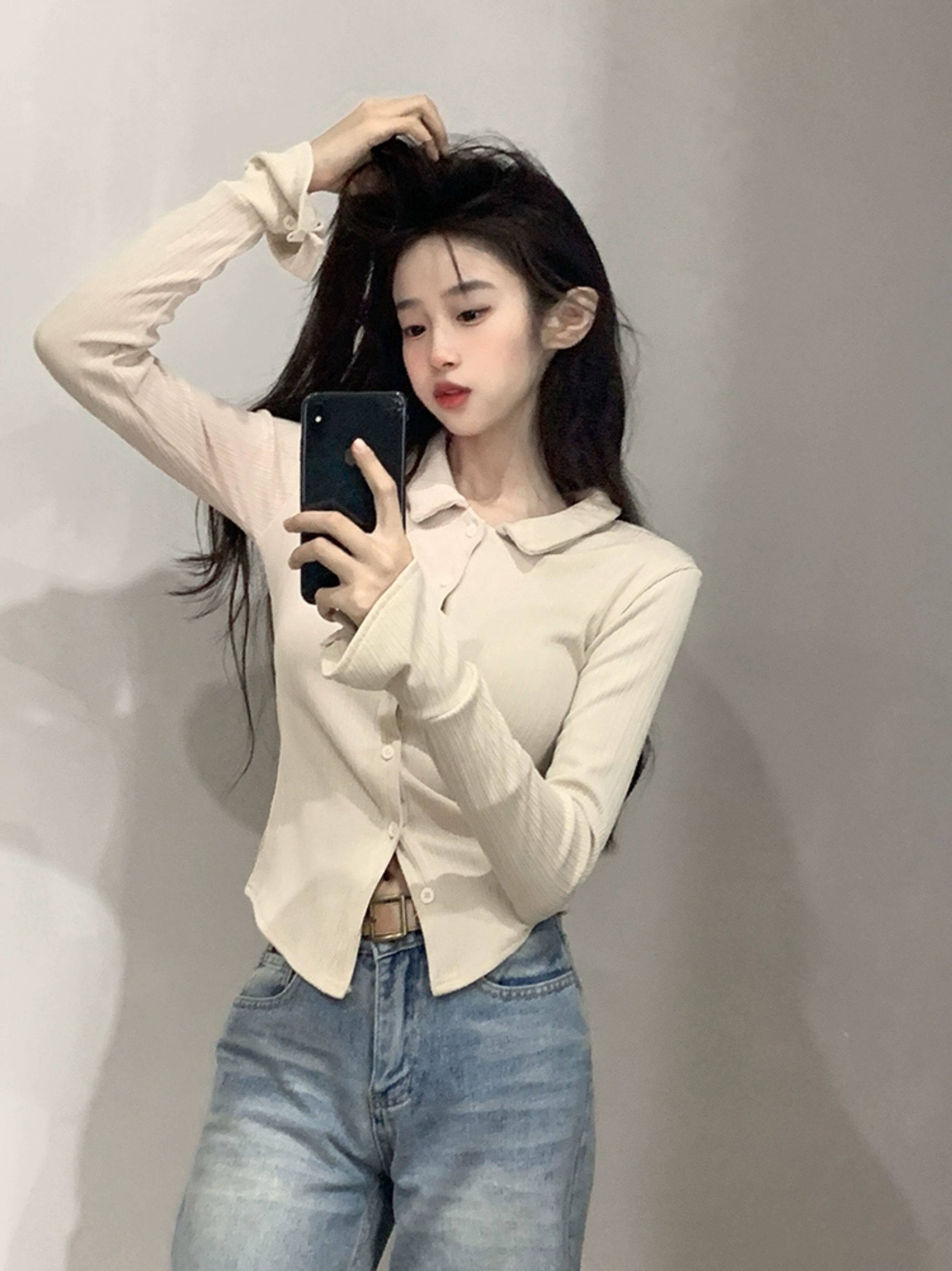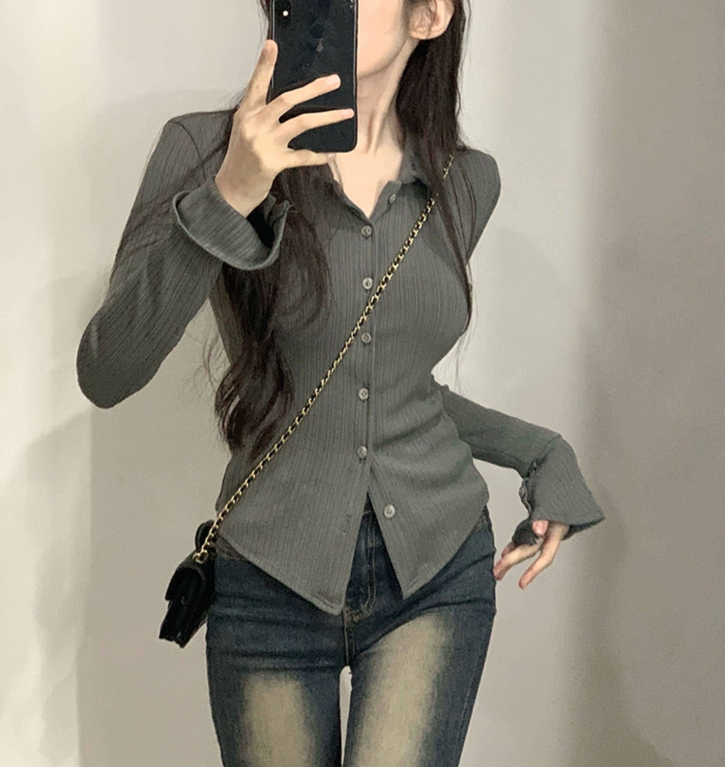 Polo領辣妹正肩長袖T恤女秋季設計感修身內搭打底衫喇叭袖上衣潮