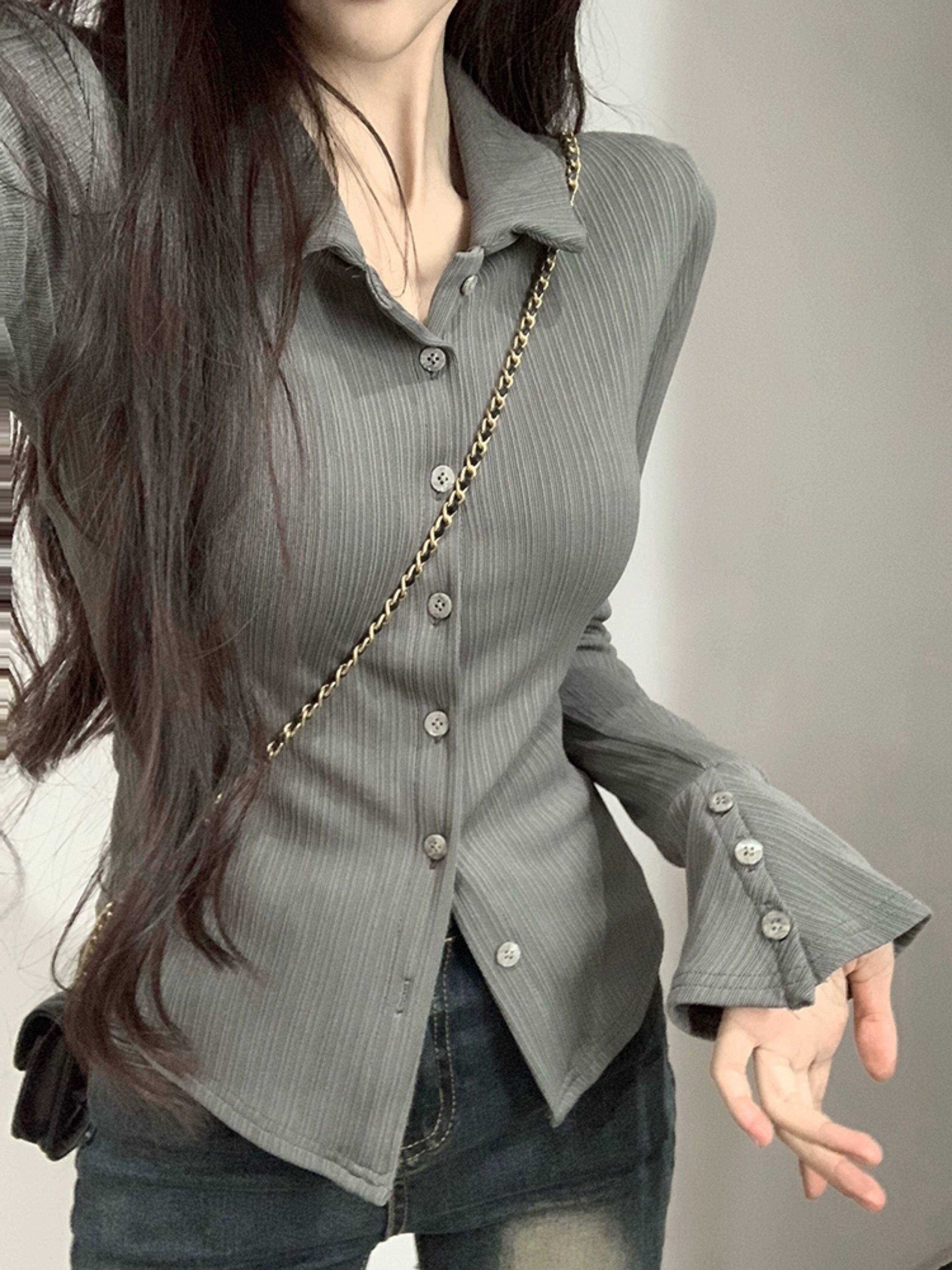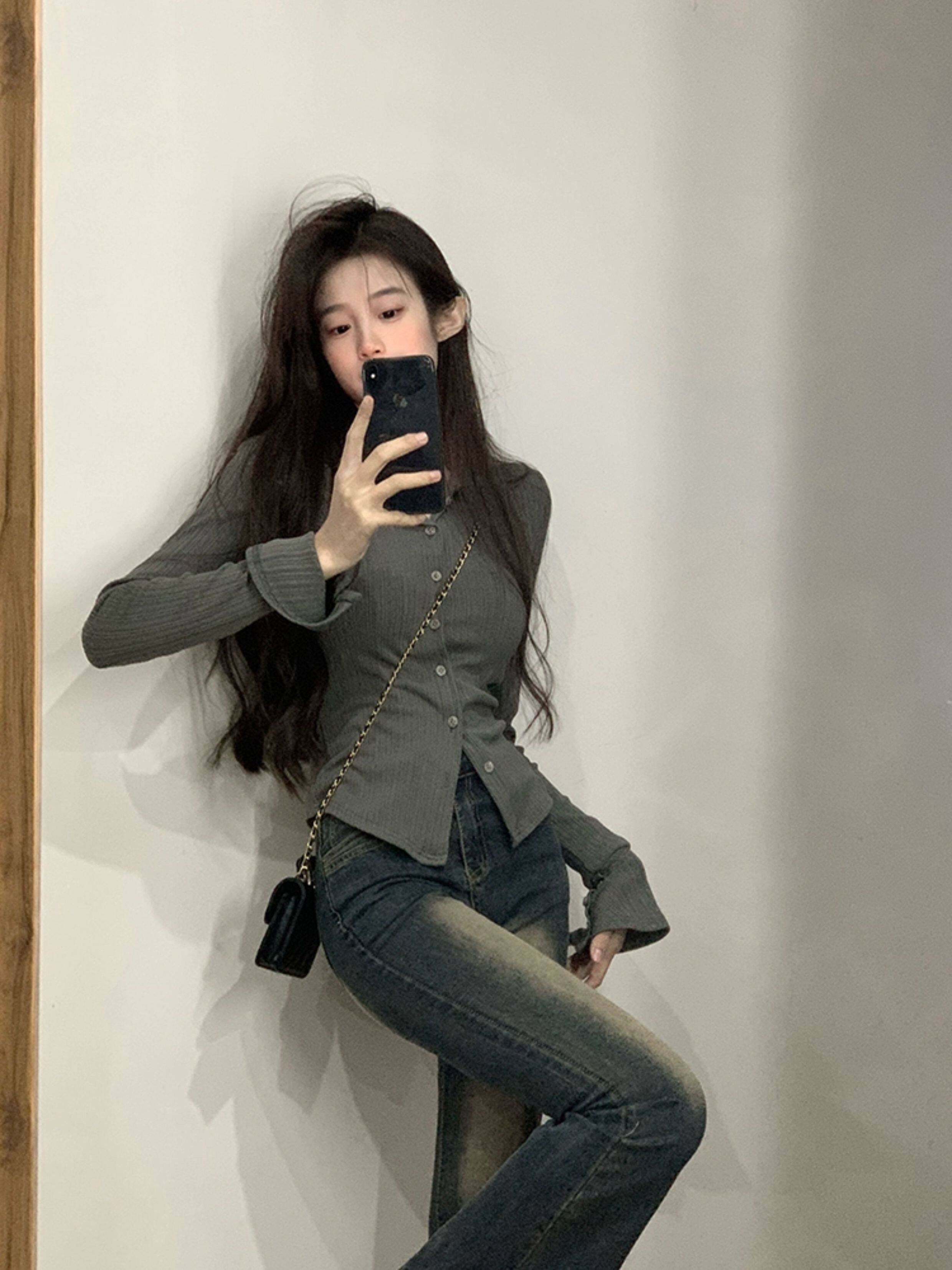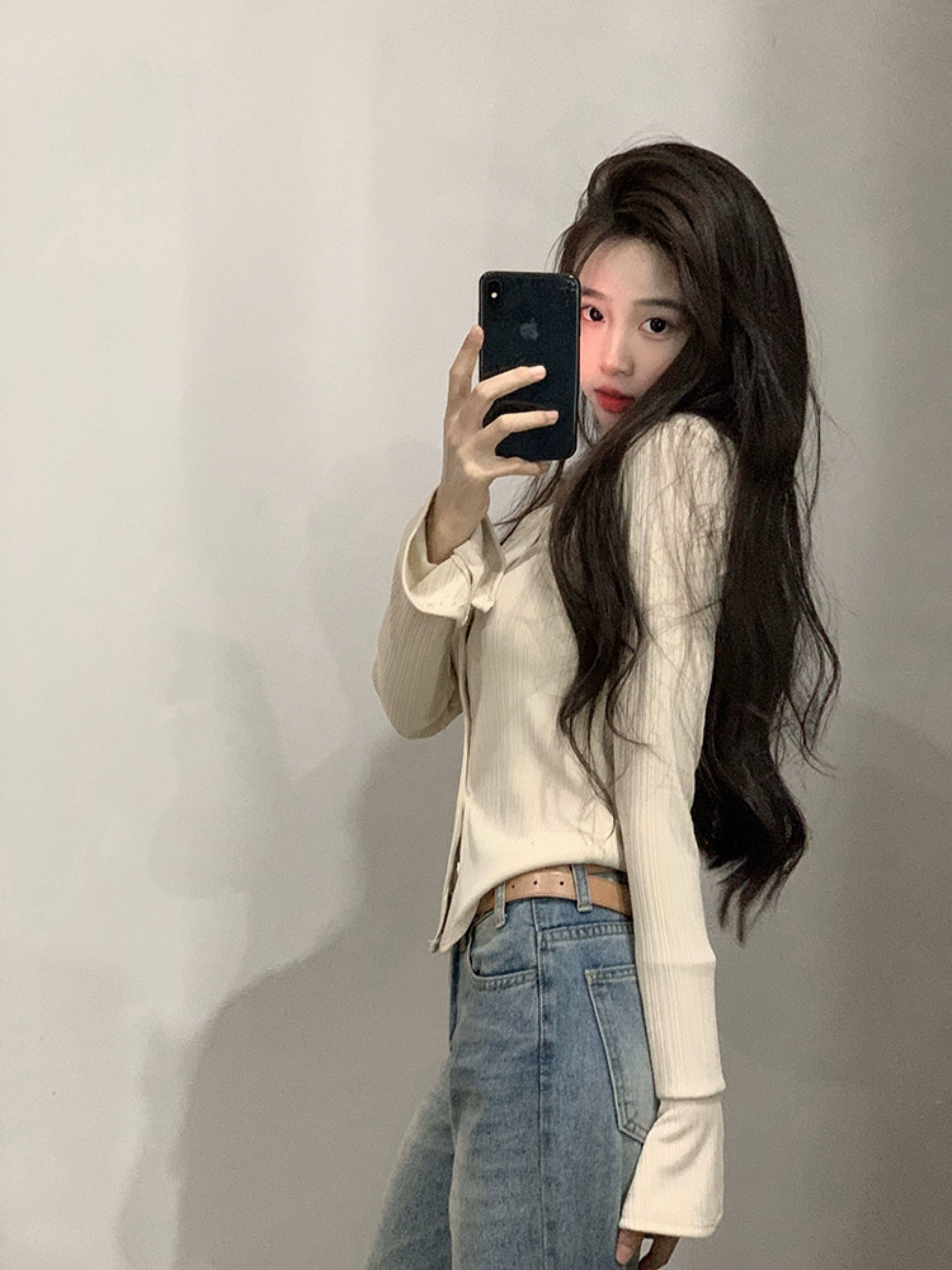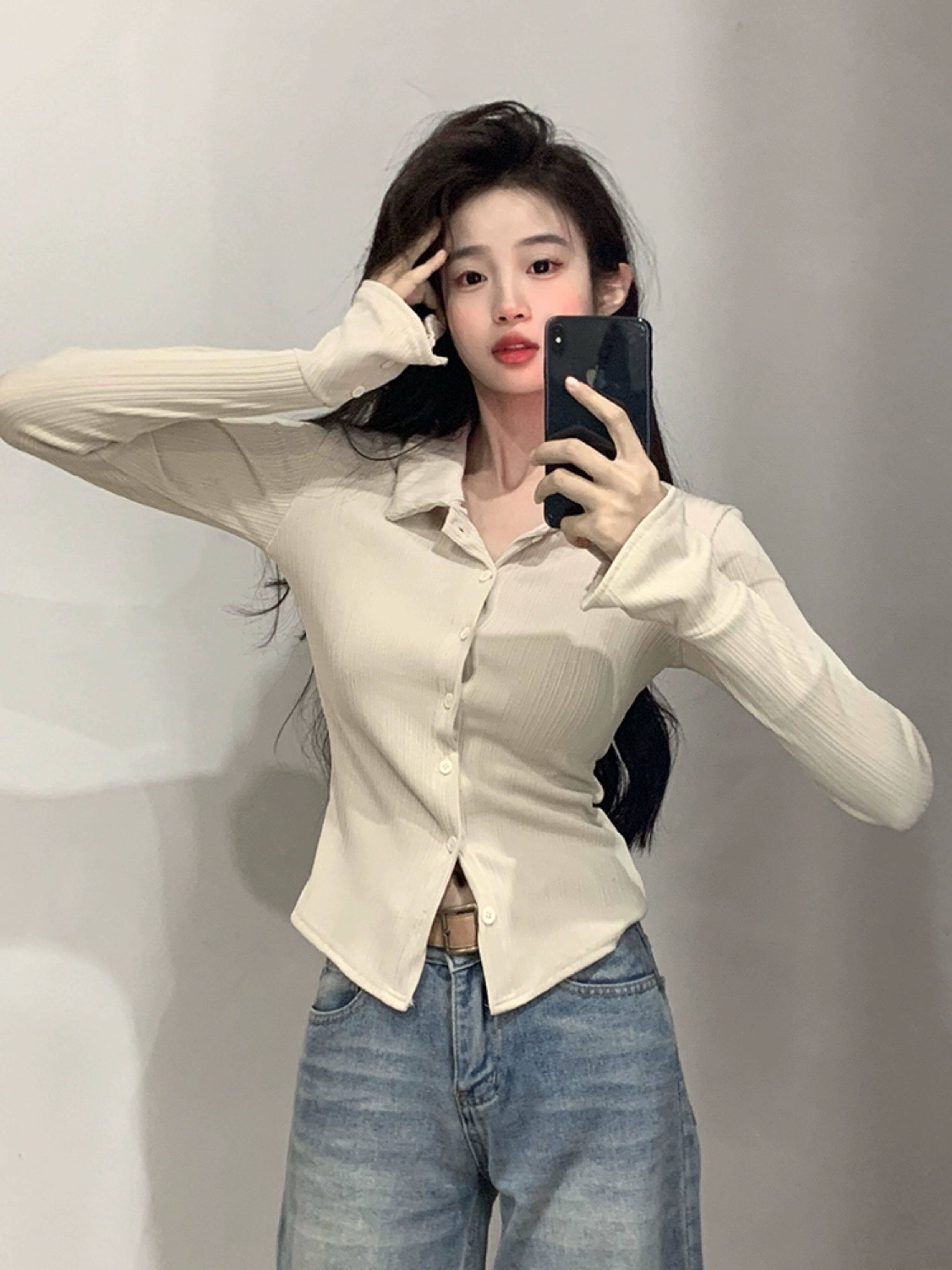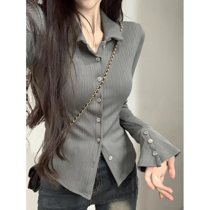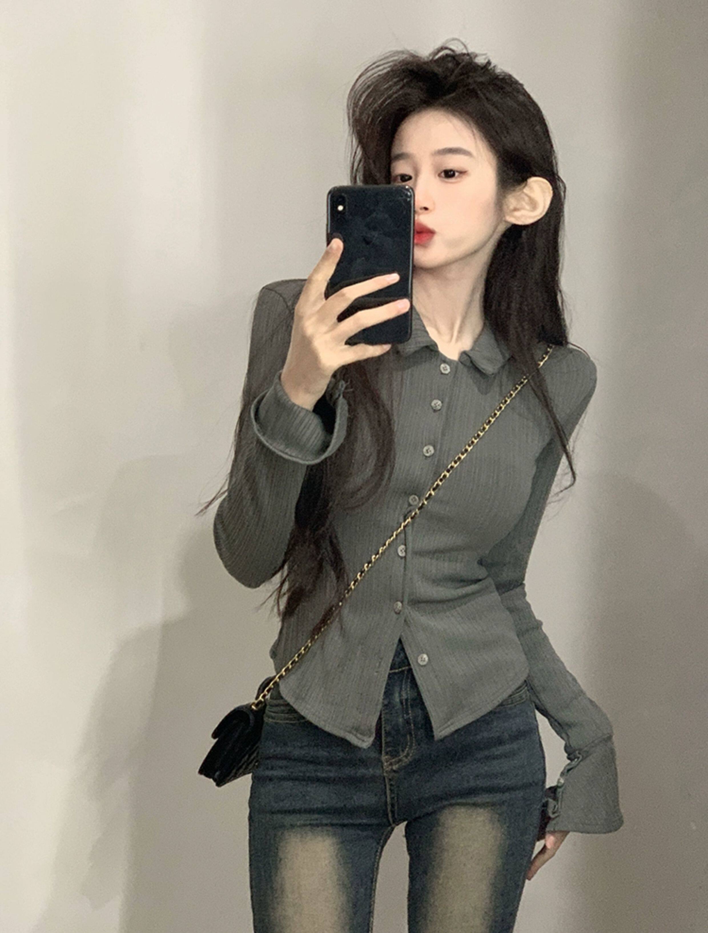 Polo領辣妹正肩長袖T恤女秋季設計感修身內搭打底衫喇叭袖上衣潮