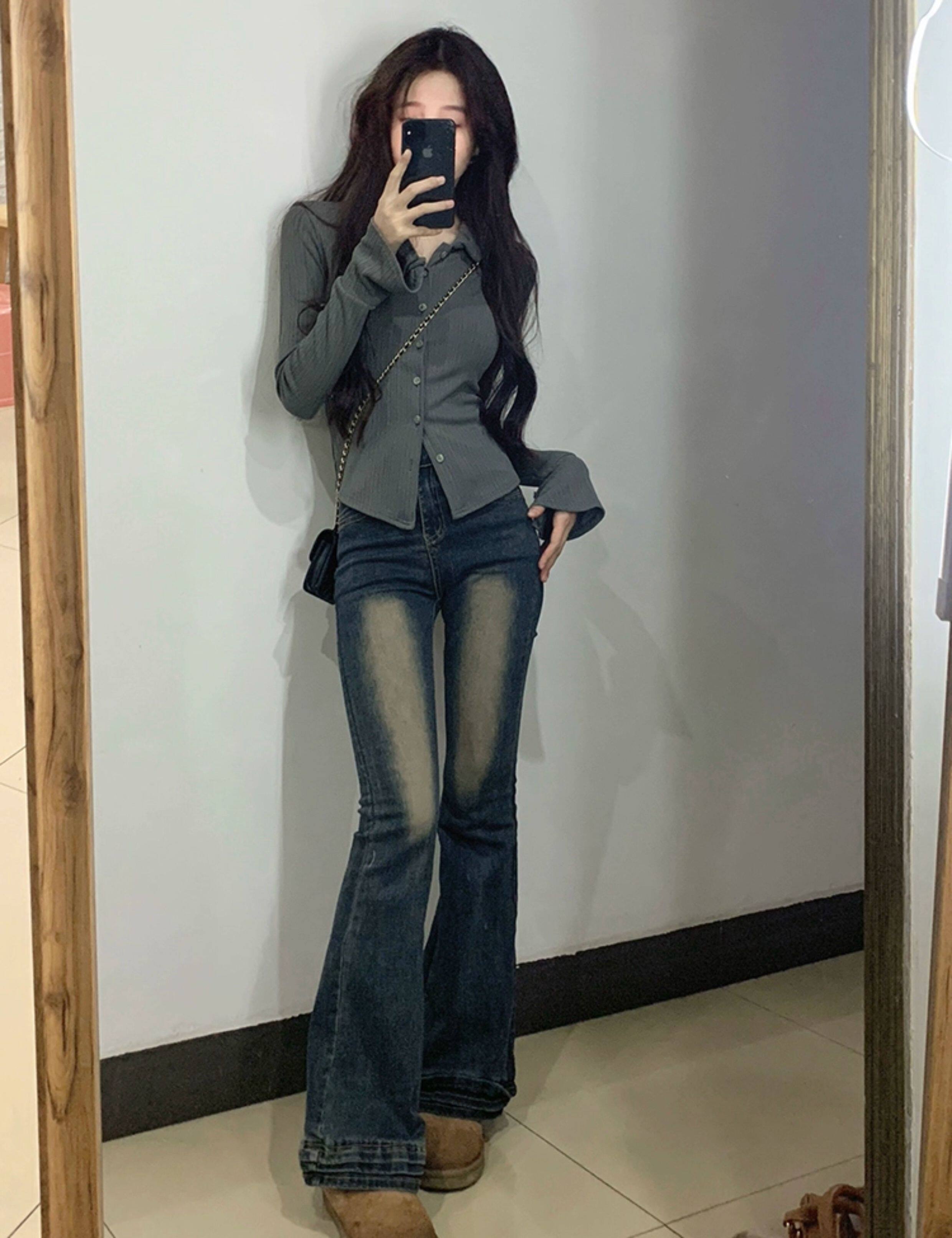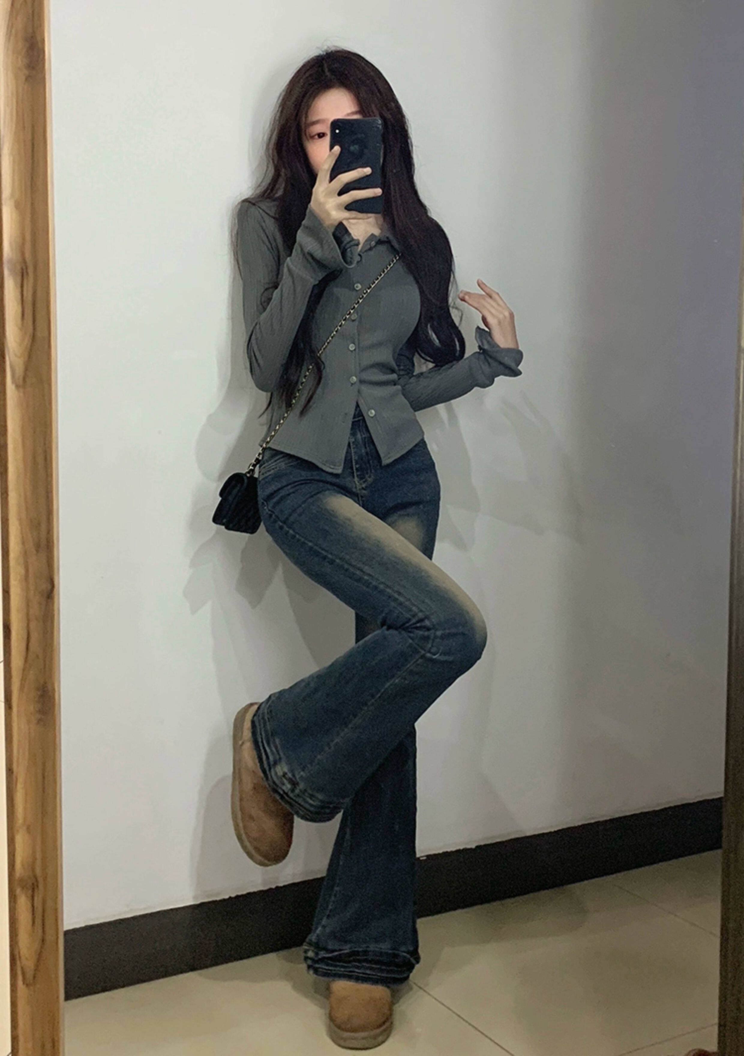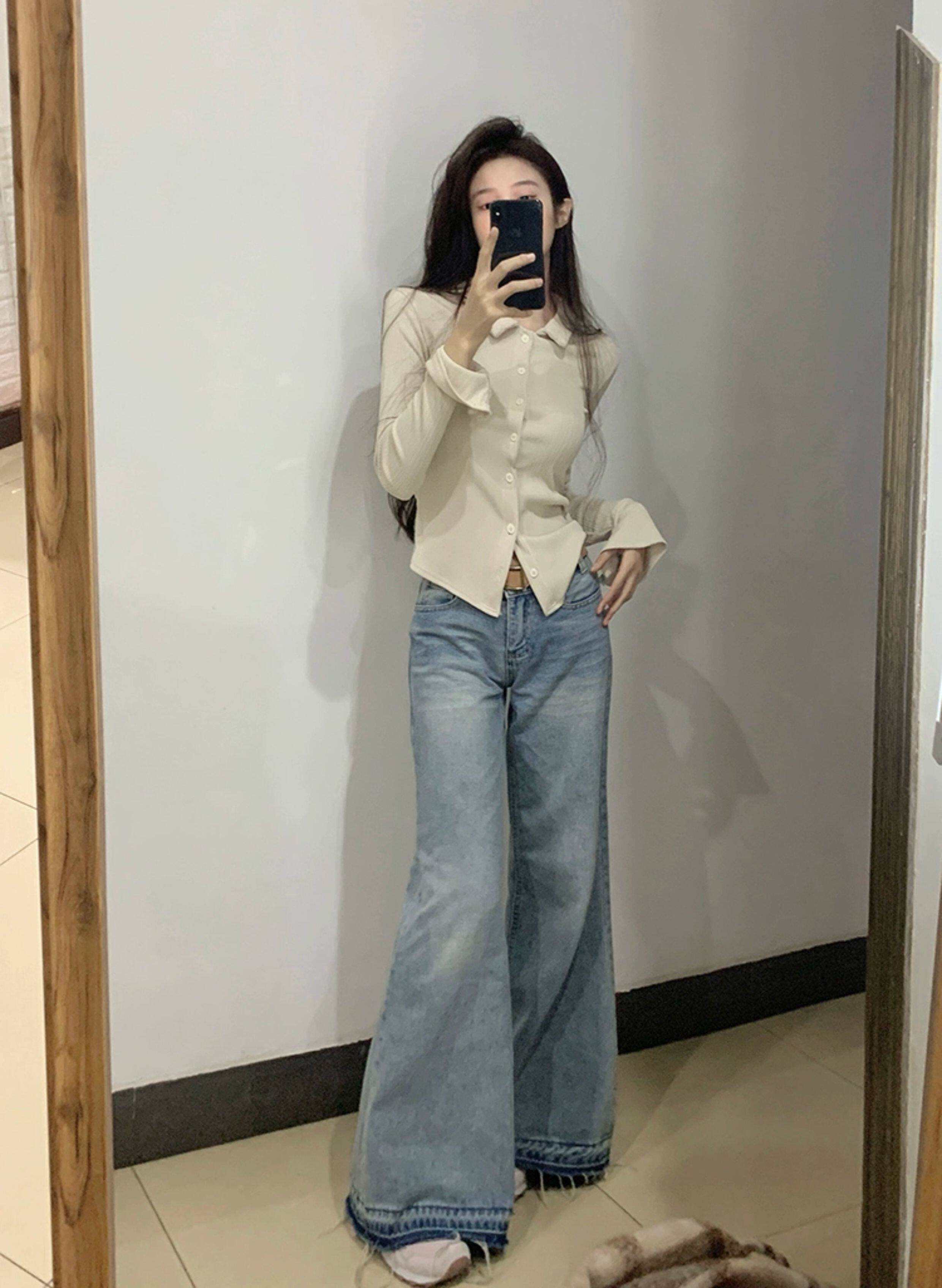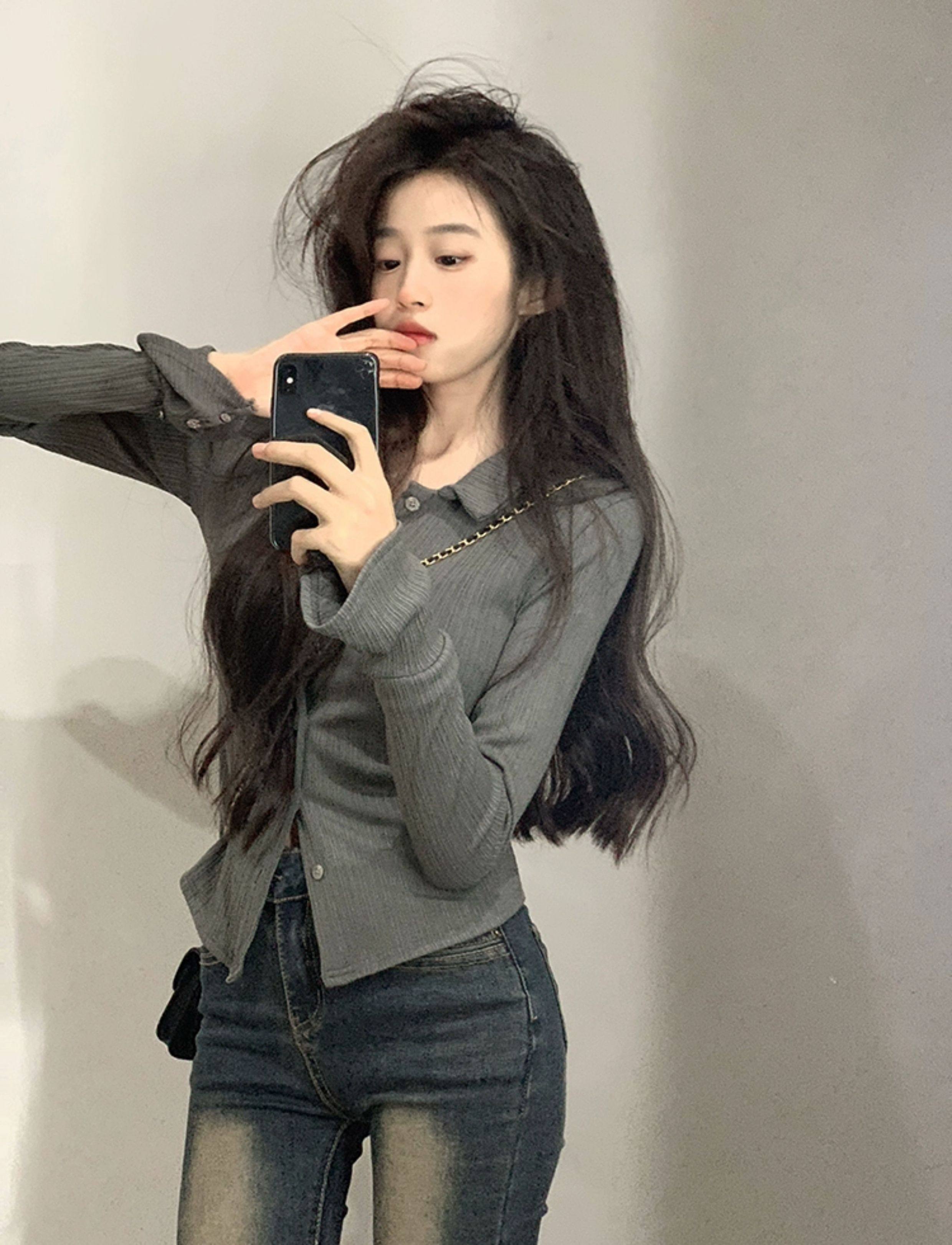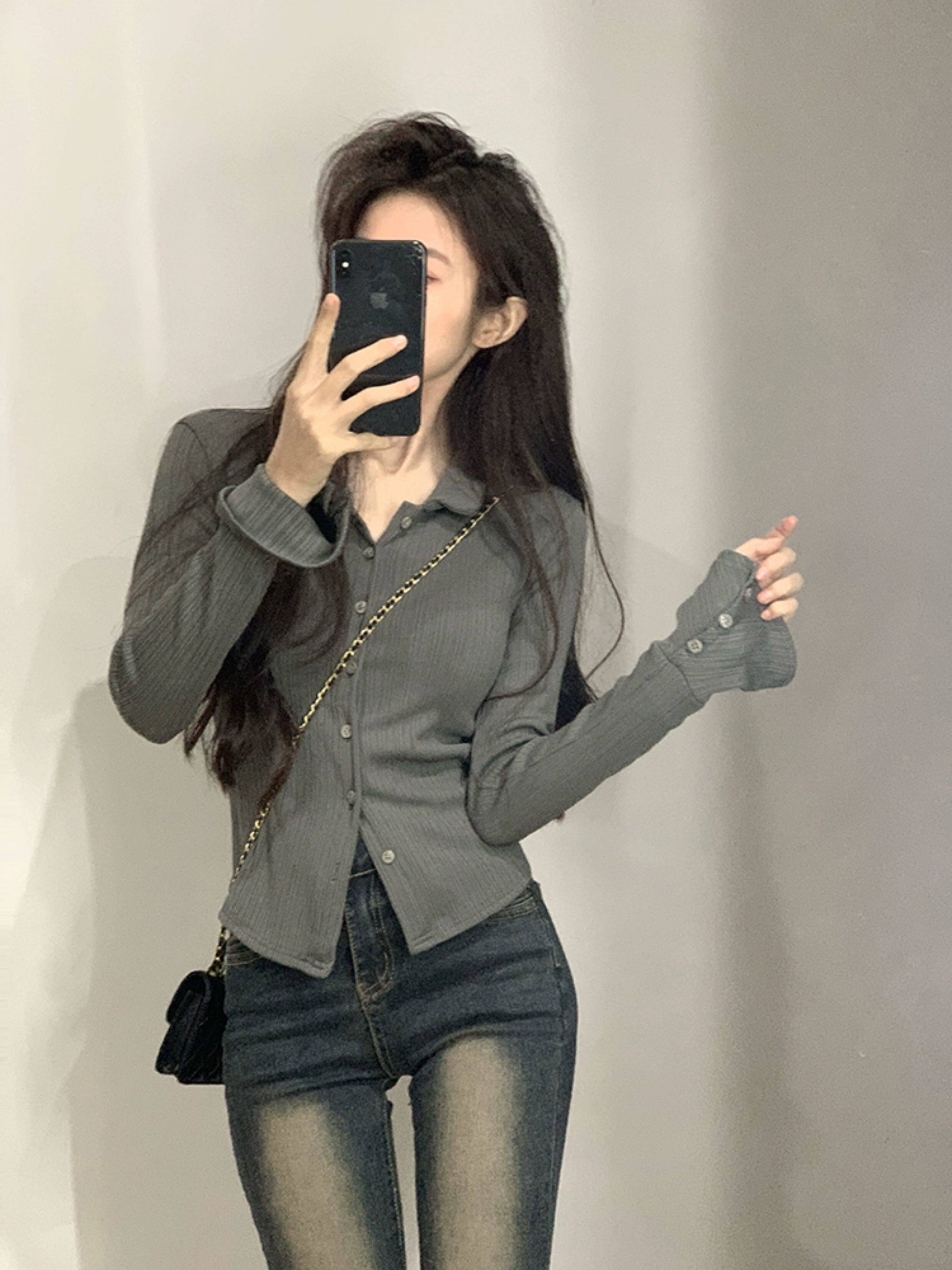 Polo領辣妹正肩長袖T恤女秋季設計感修身內搭打底衫喇叭袖上衣潮