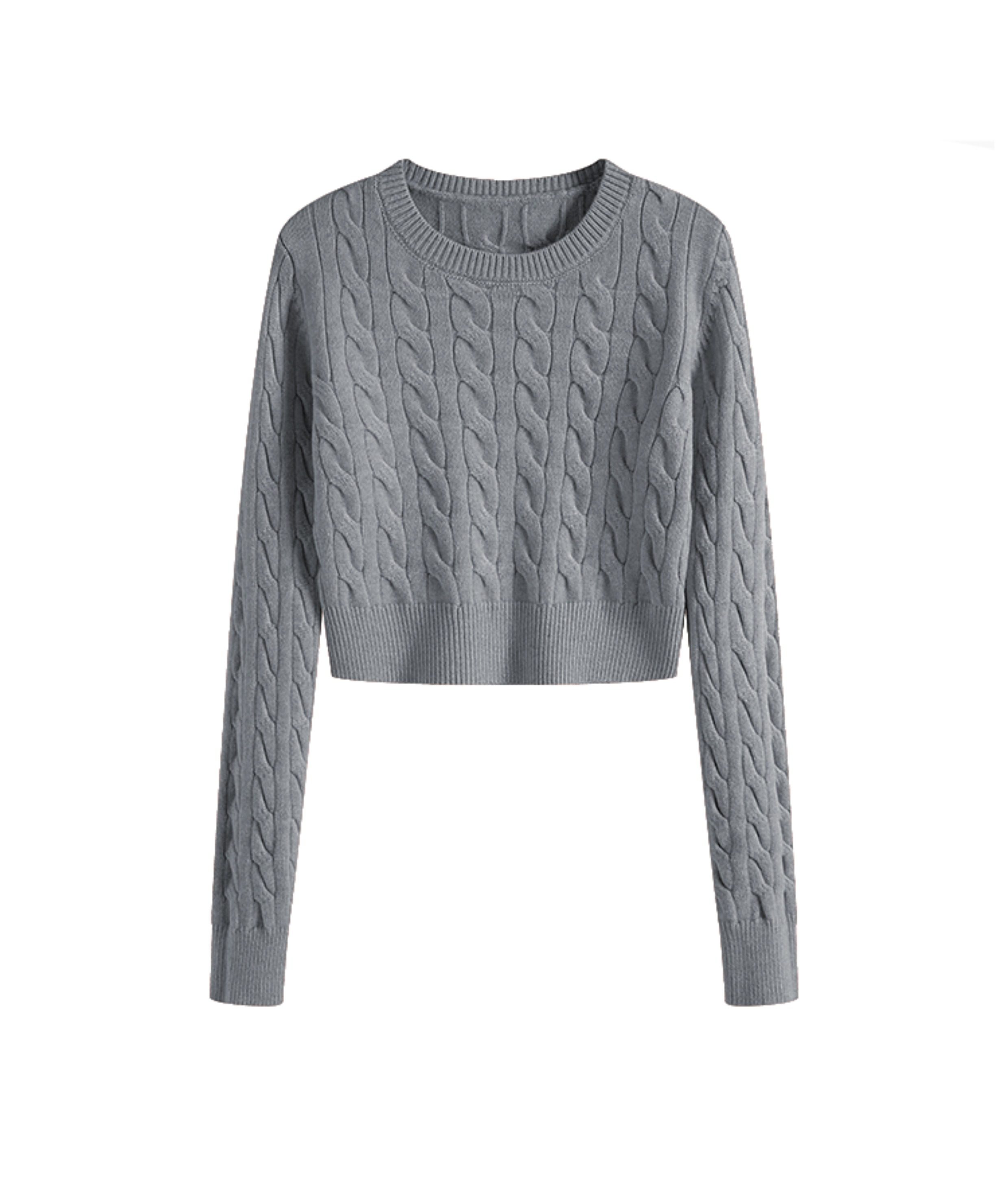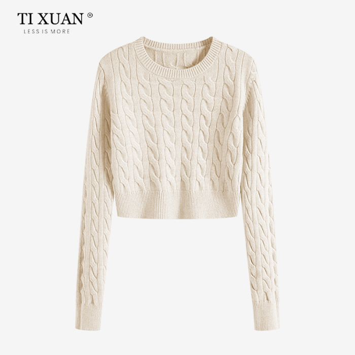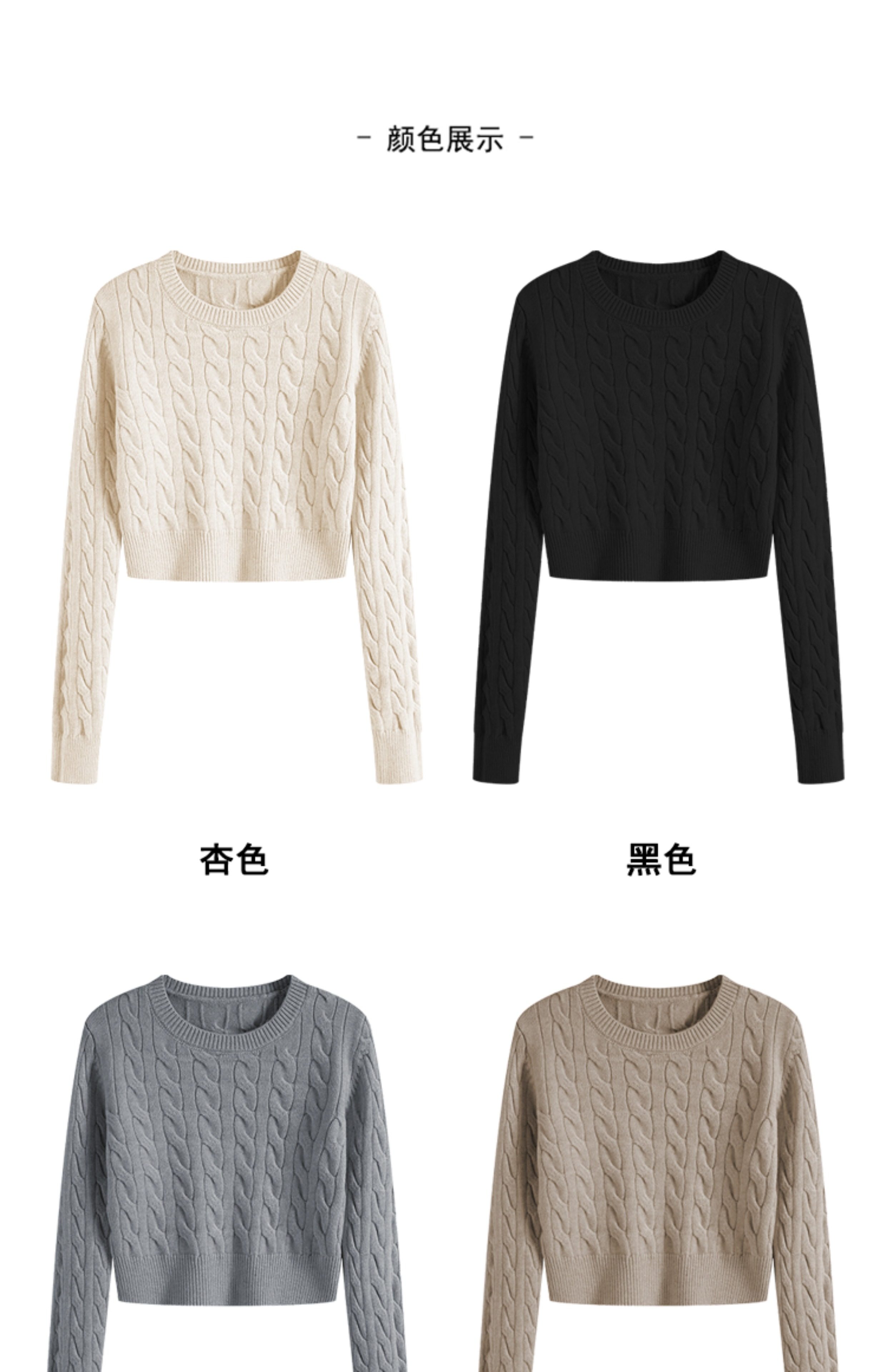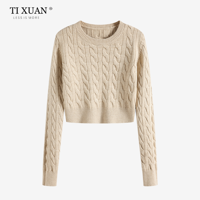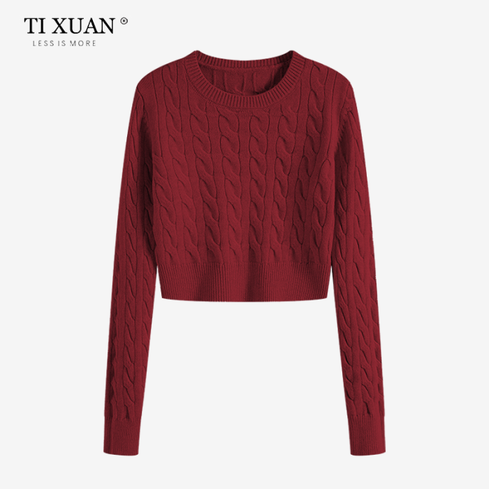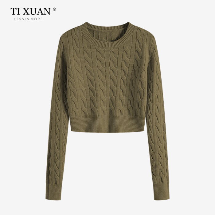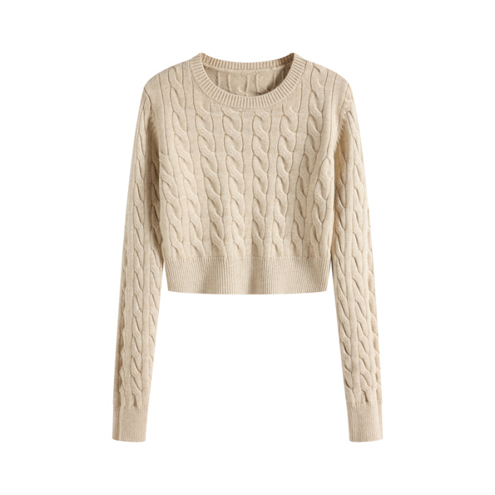 秋冬季圓領厚款毛衣女短款長袖修身高腰小個子內搭麻花針織打底衫