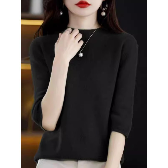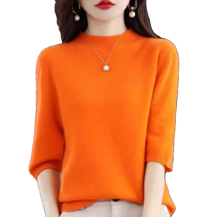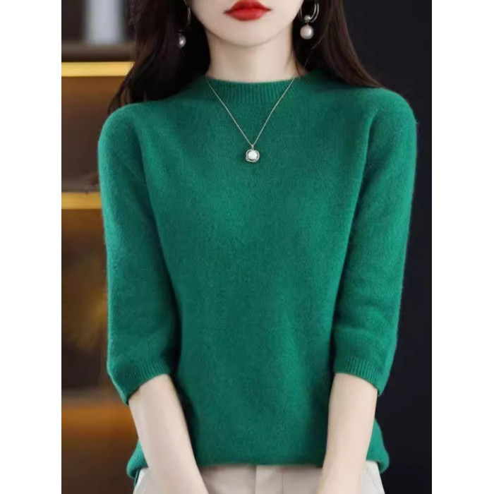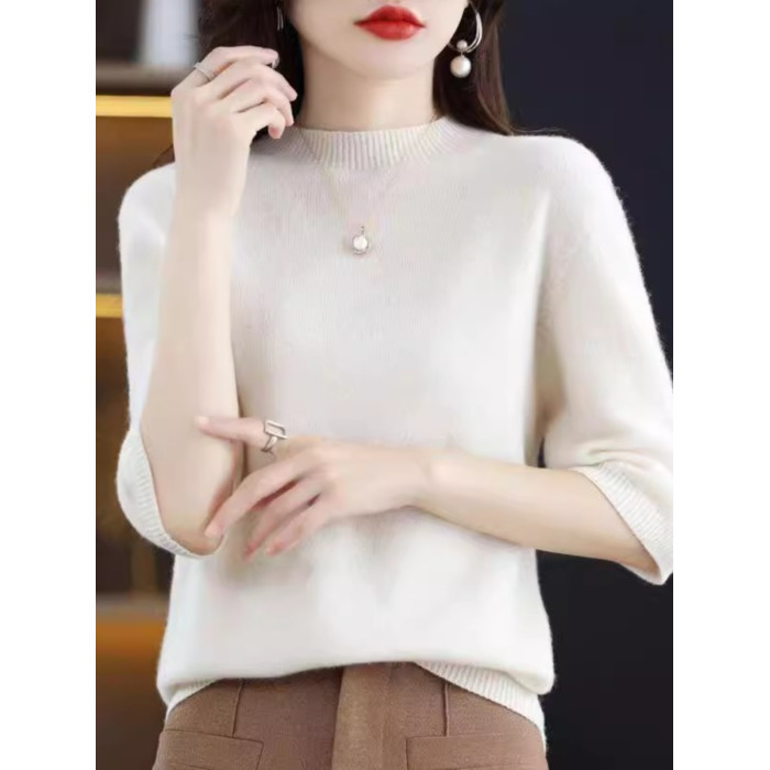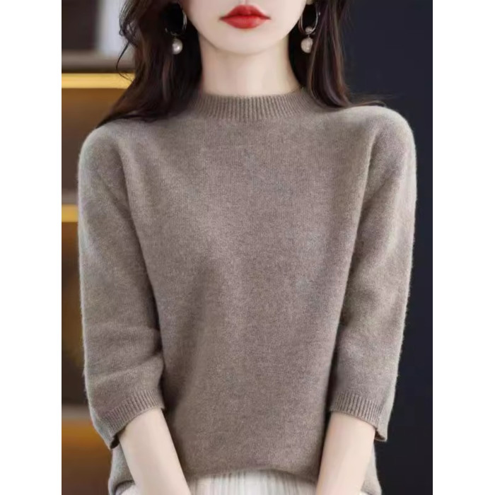 2025秋冬款羊絨衫短袖女半高領羊毛簡約寬松薄款七分袖羊毛衫ins