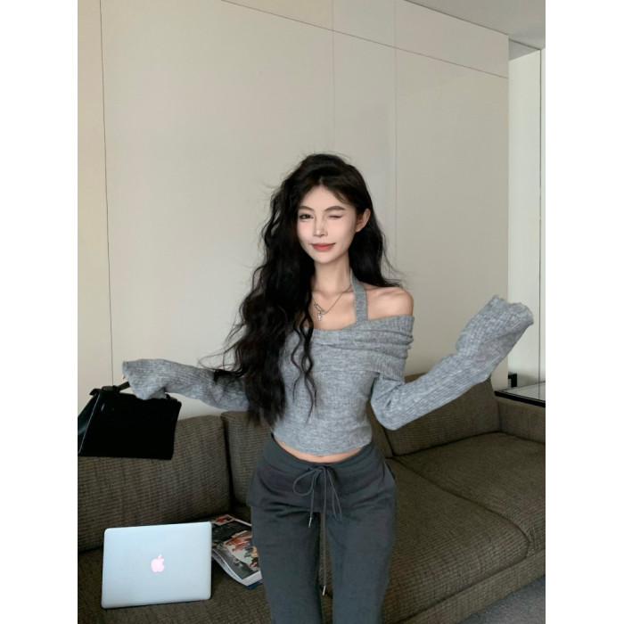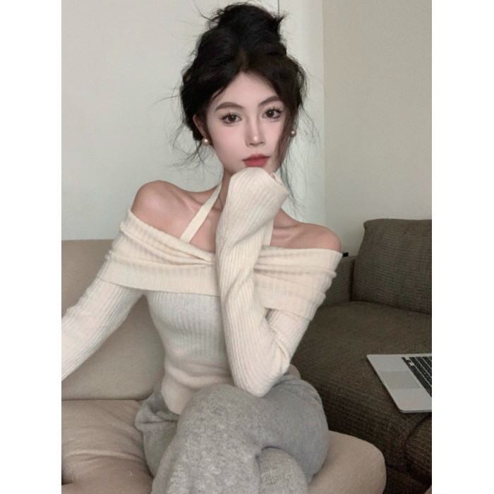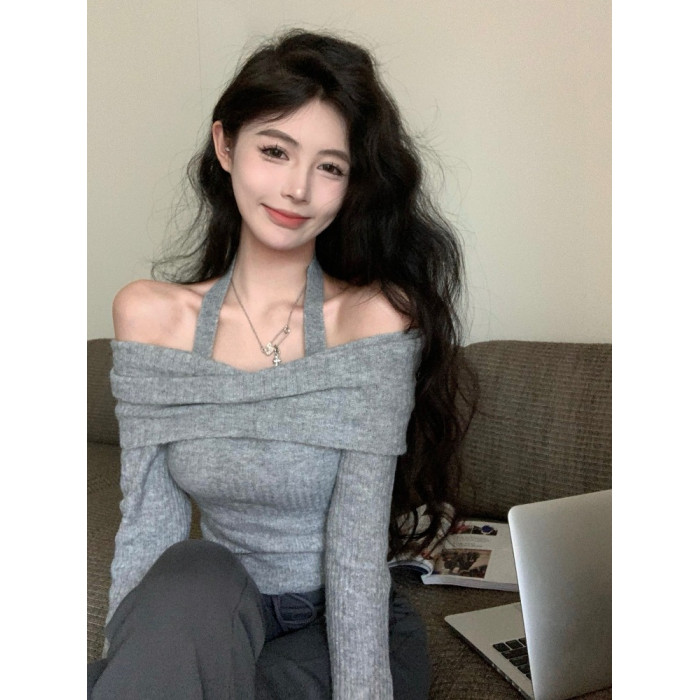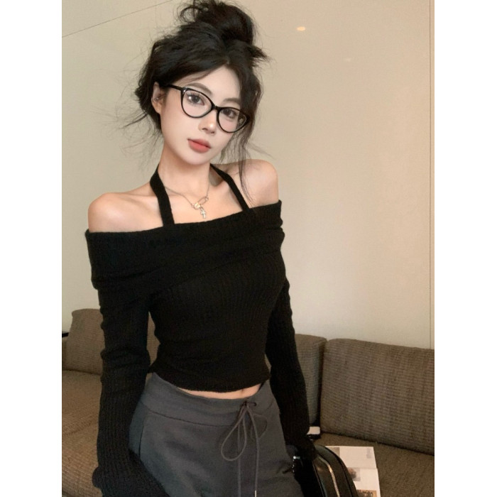 韓版辣妹一字肩掛脖長袖針織衫女2025秋冬季新款修身顯瘦短款上衣