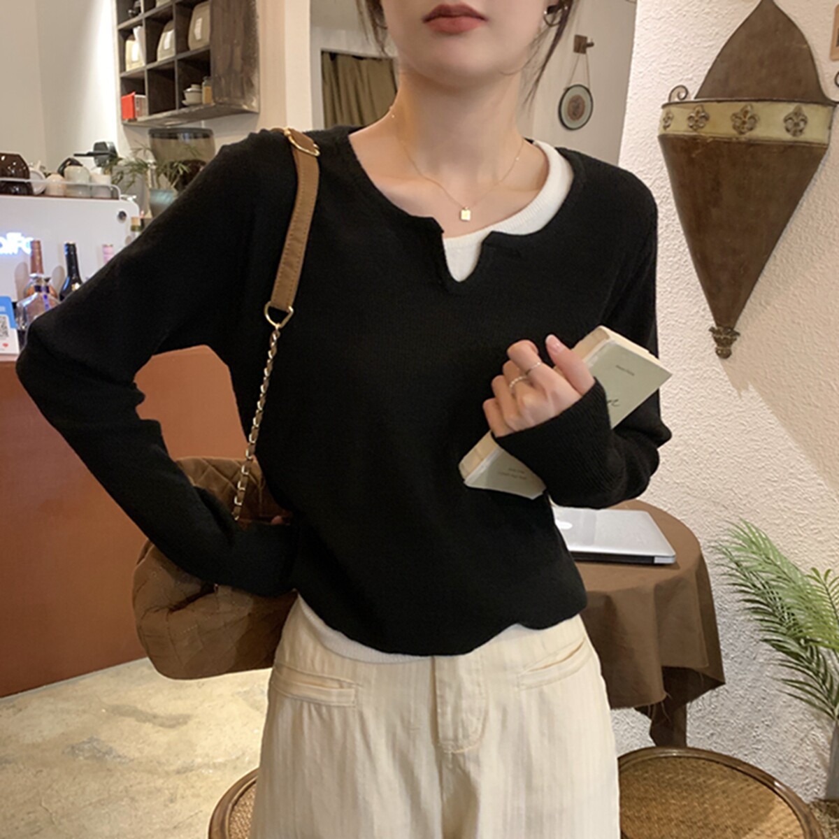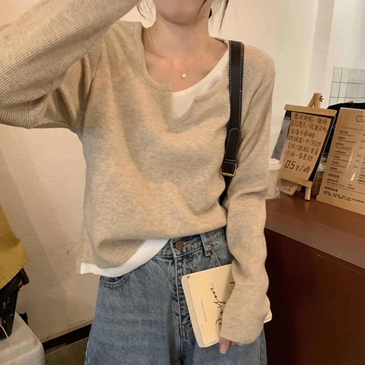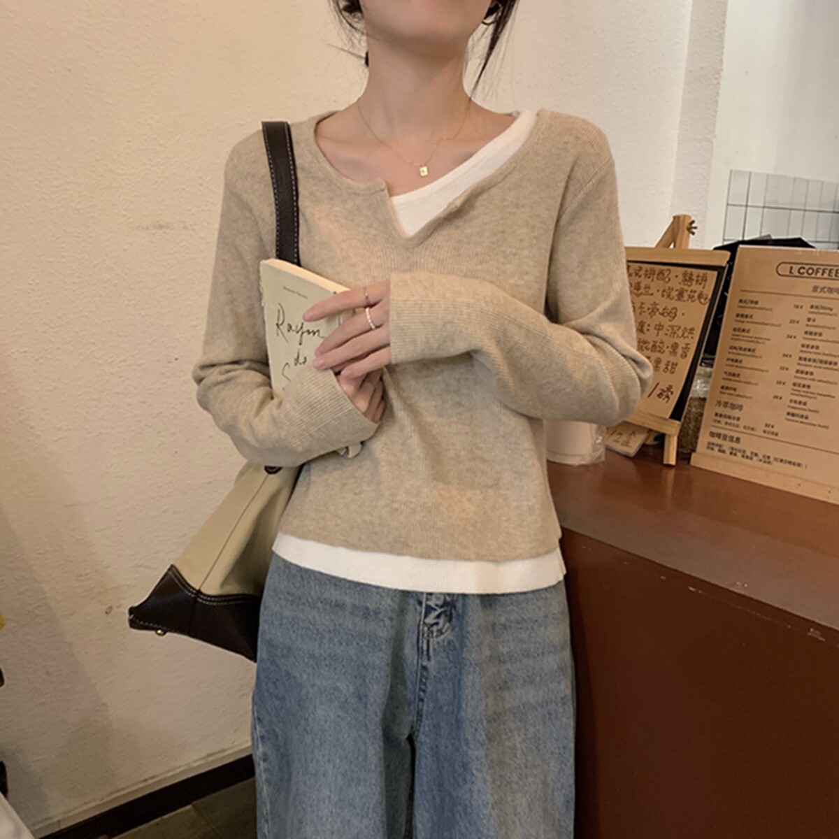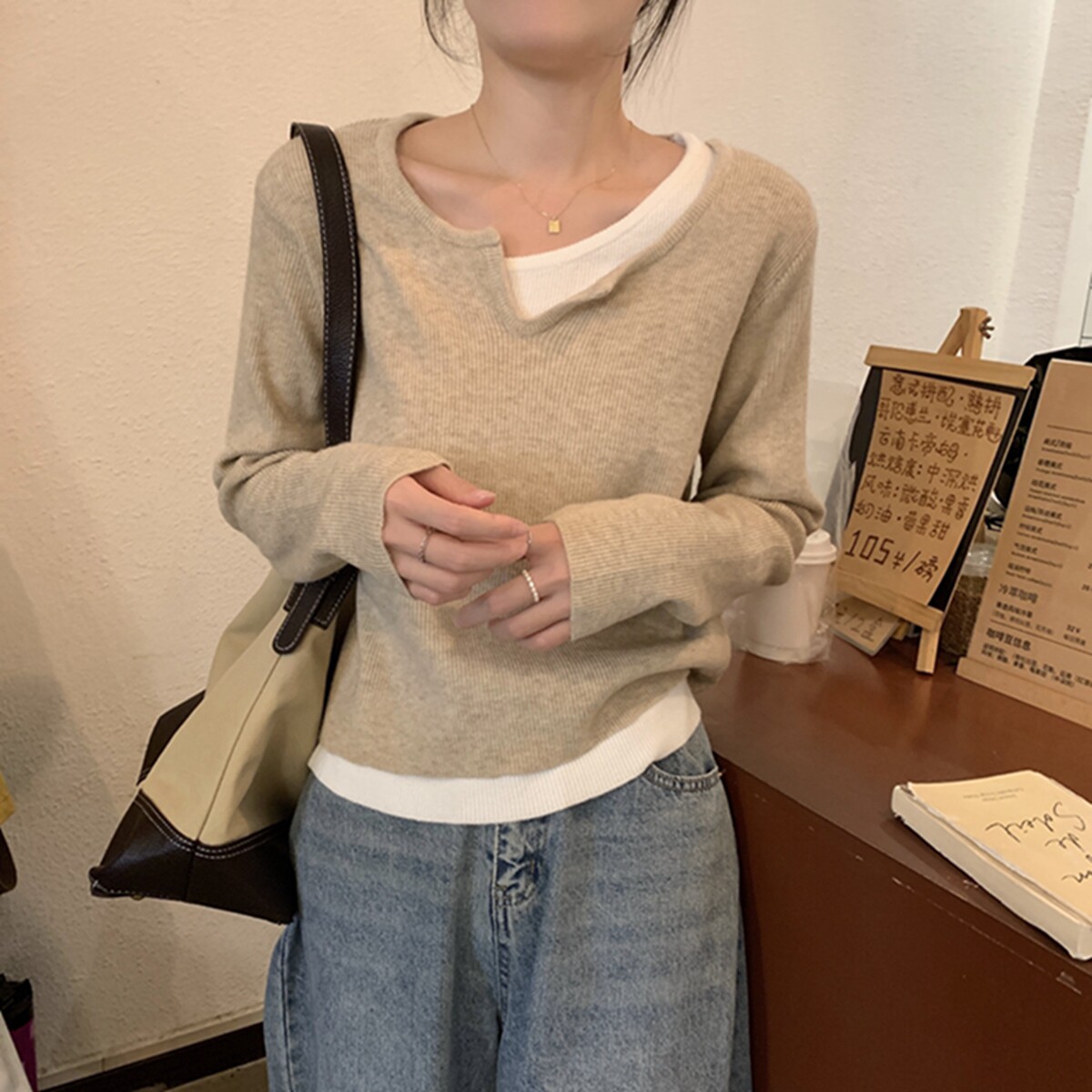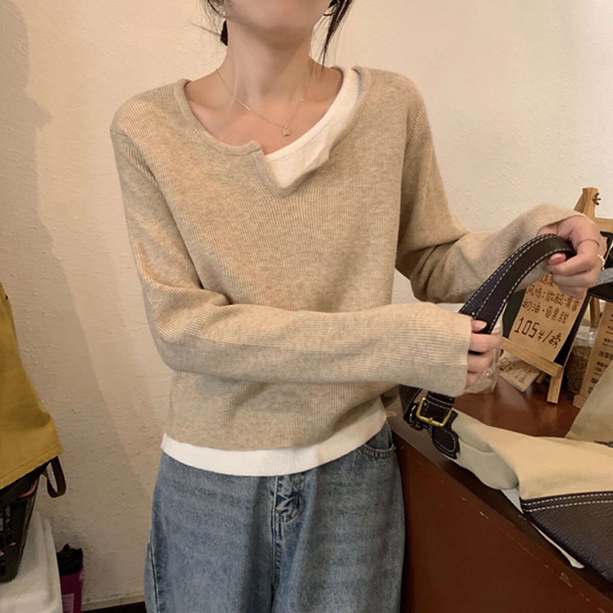 v領假兩件長袖針織衫t恤女春秋胖mm大碼內搭打底衫小個子休閒上衣