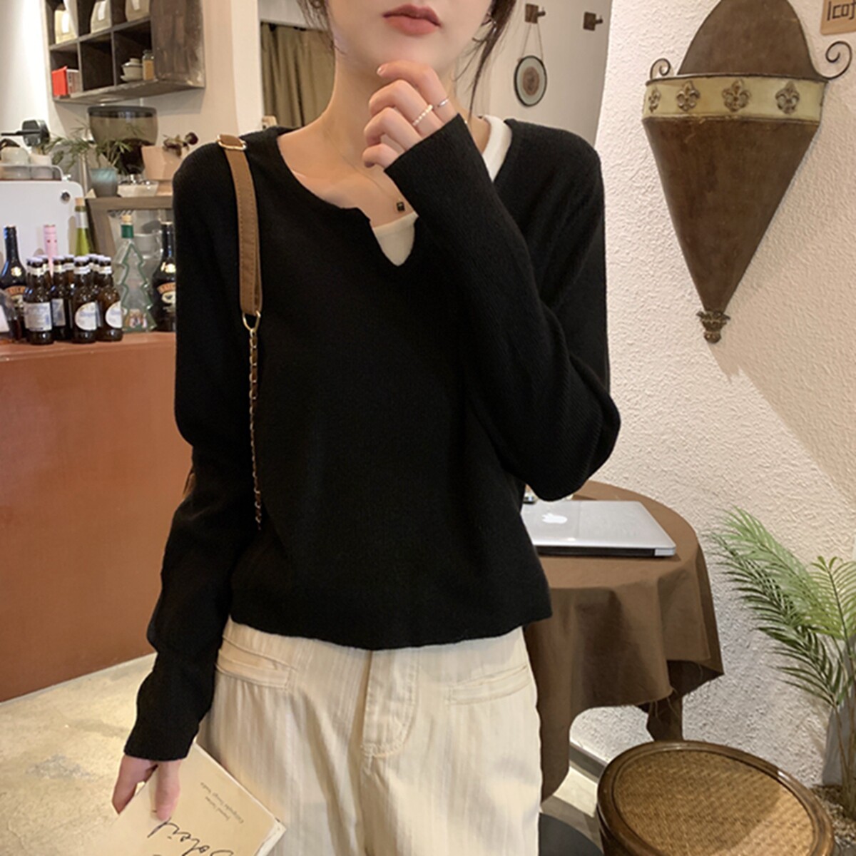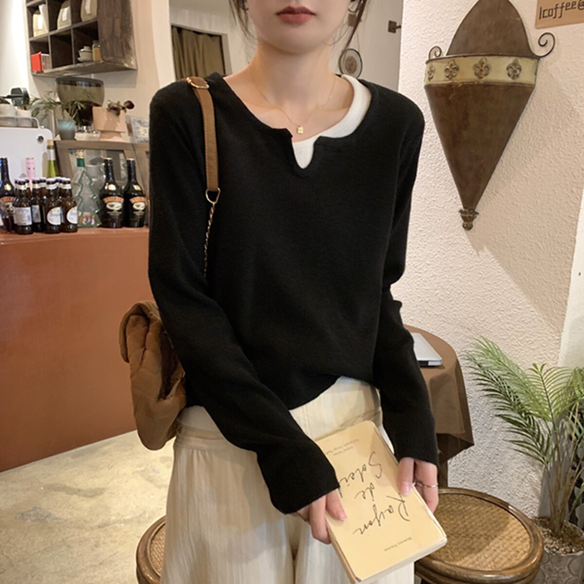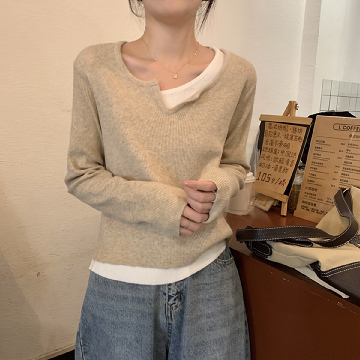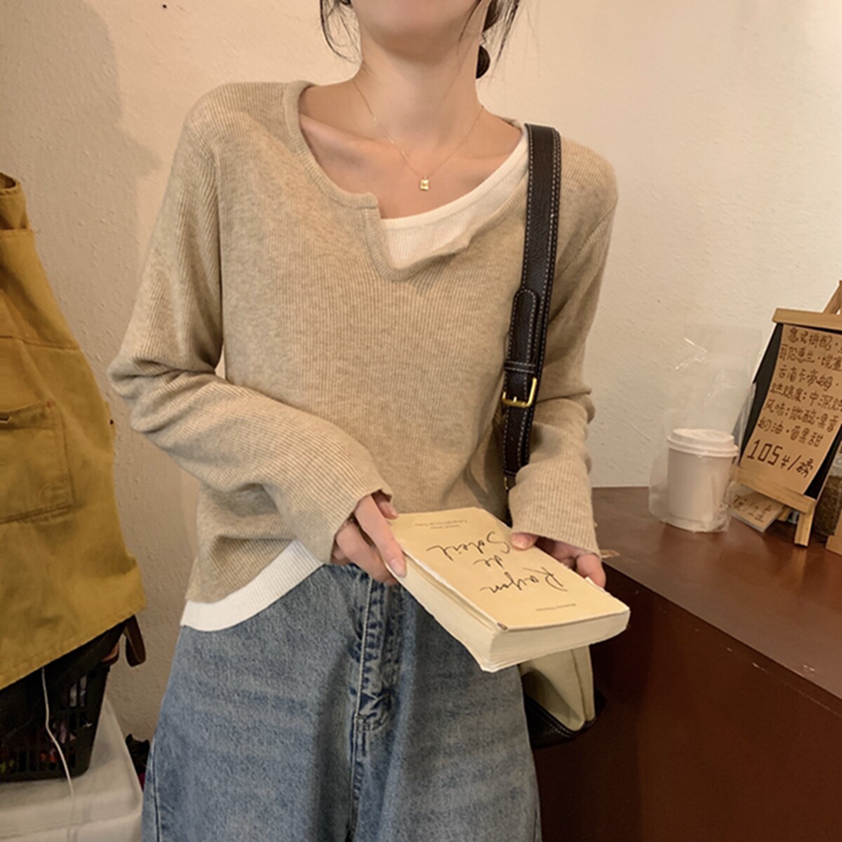 v領假兩件長袖針織衫t恤女春秋胖mm大碼內搭打底衫小個子休閒上衣