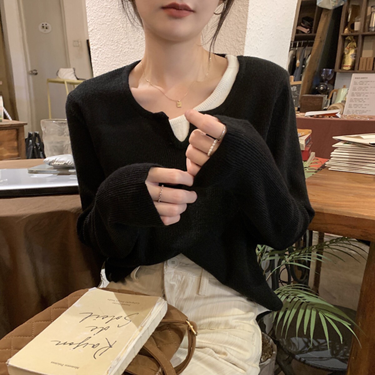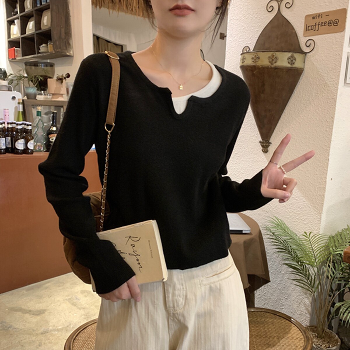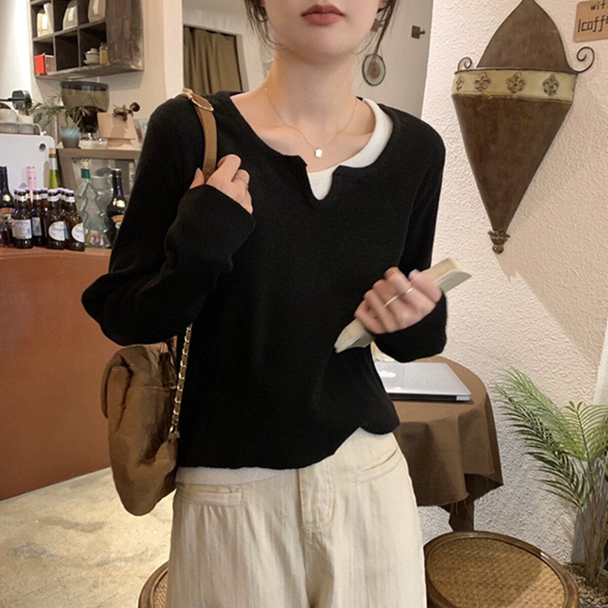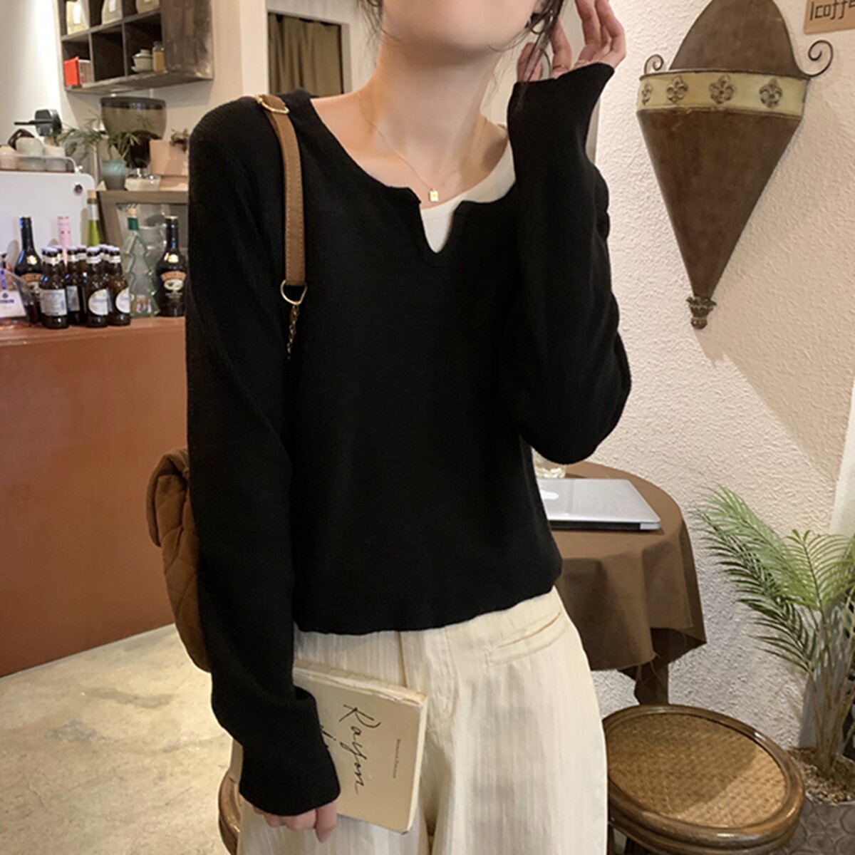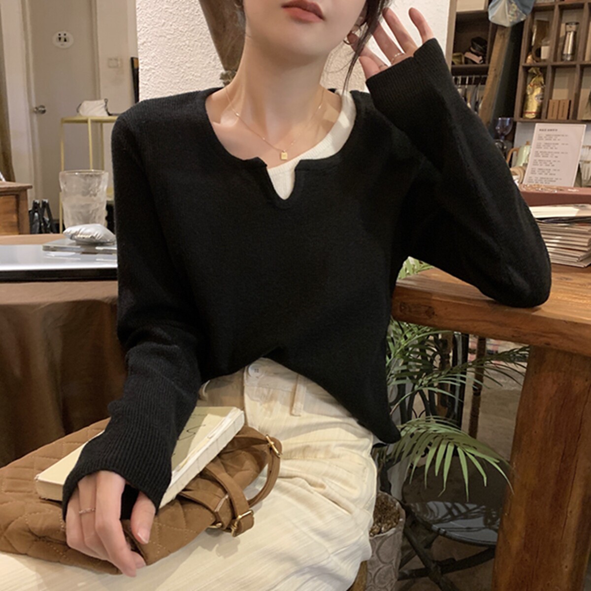 v領假兩件長袖針織衫t恤女春秋胖mm大碼內搭打底衫小個子休閒上衣