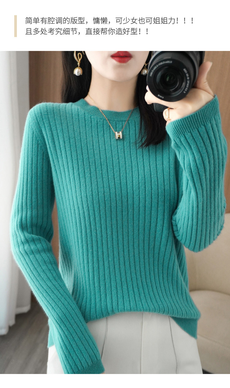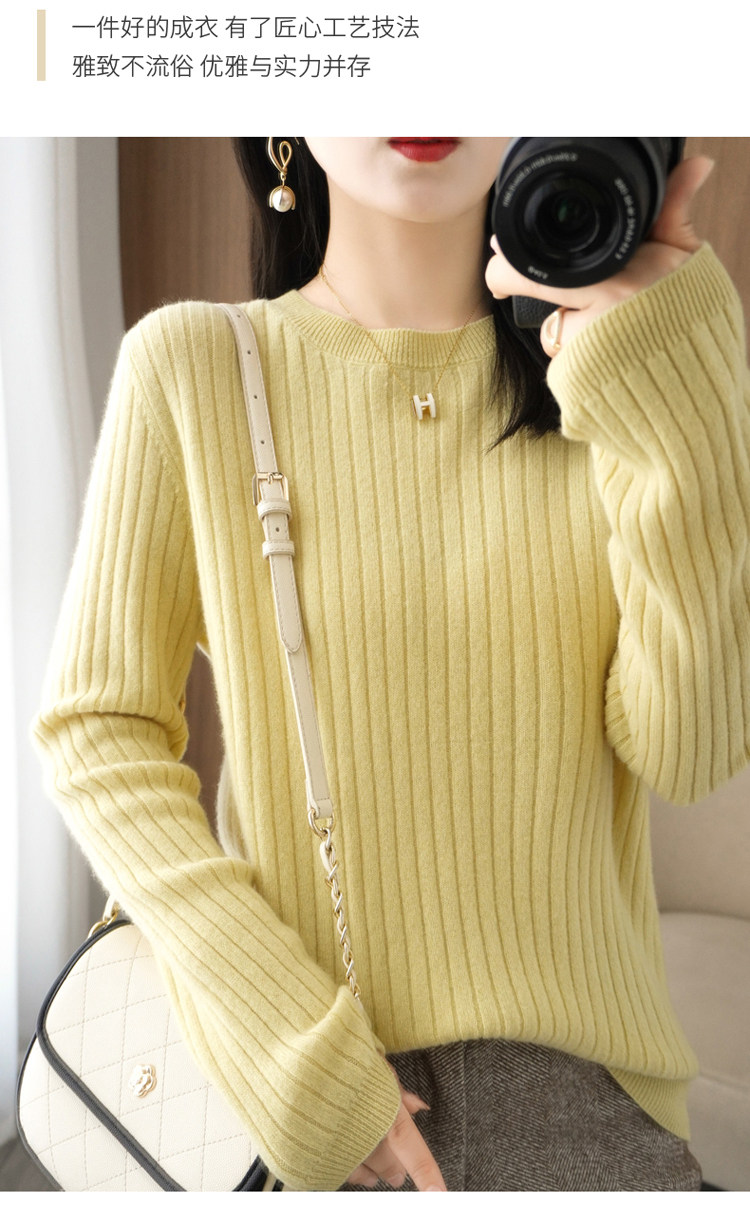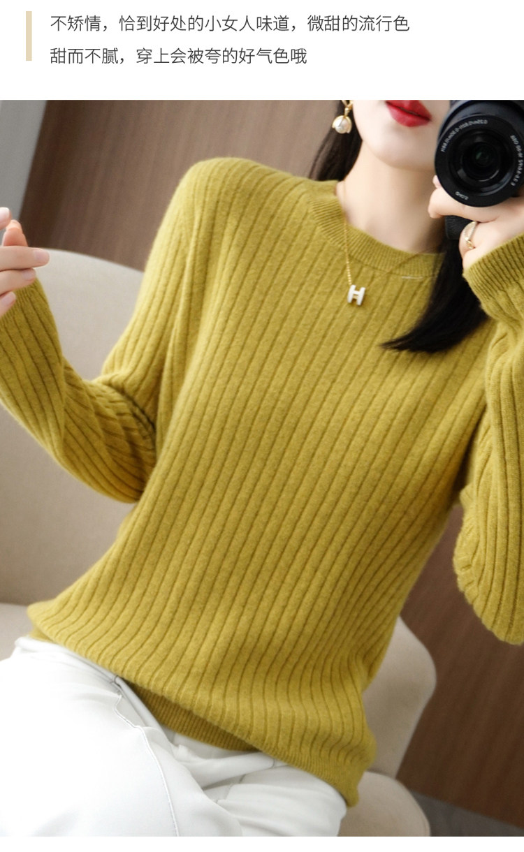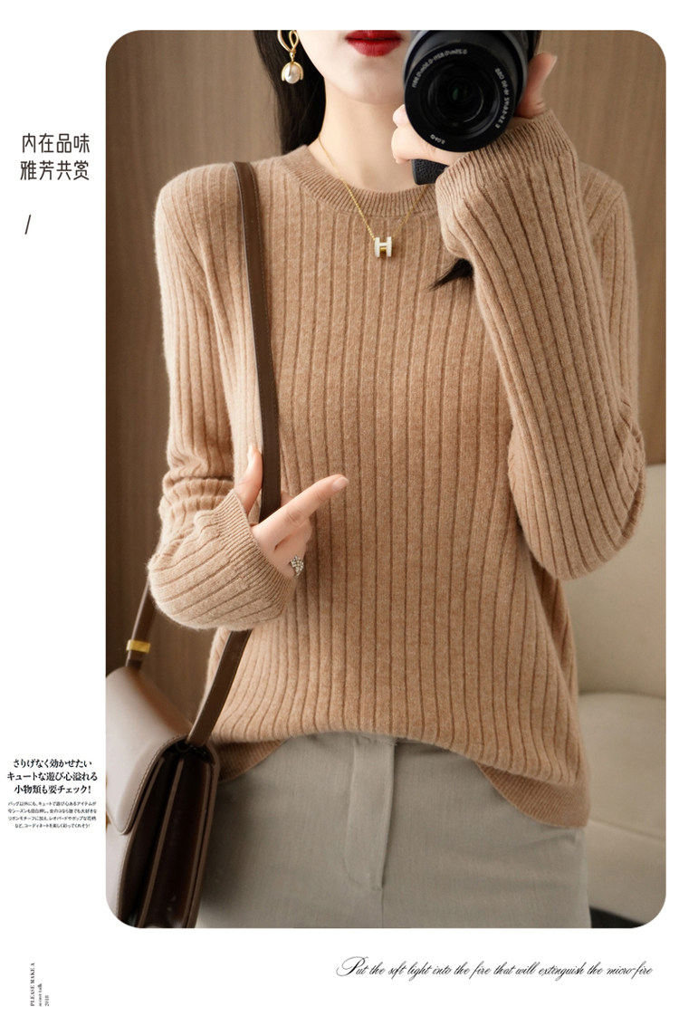 秋冬新款圓領毛衣女抽條內搭打底衫洋氣百搭寬鬆羊毛針織上衣春裝