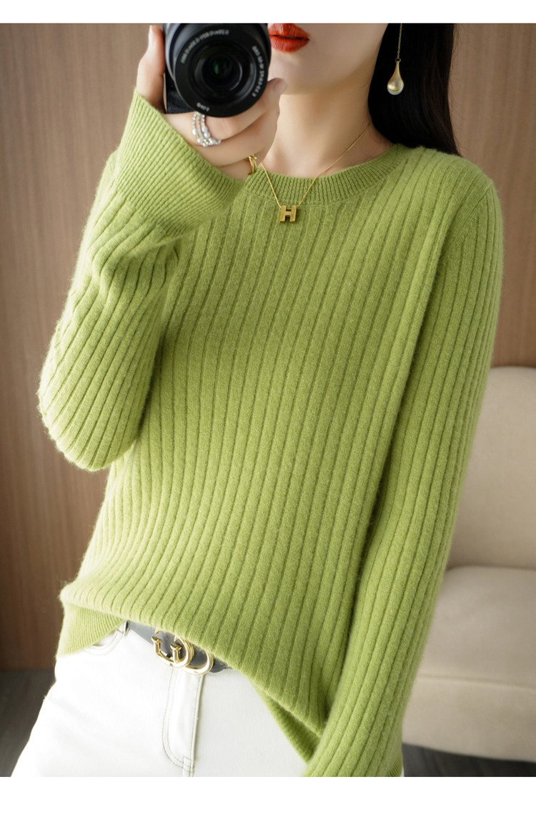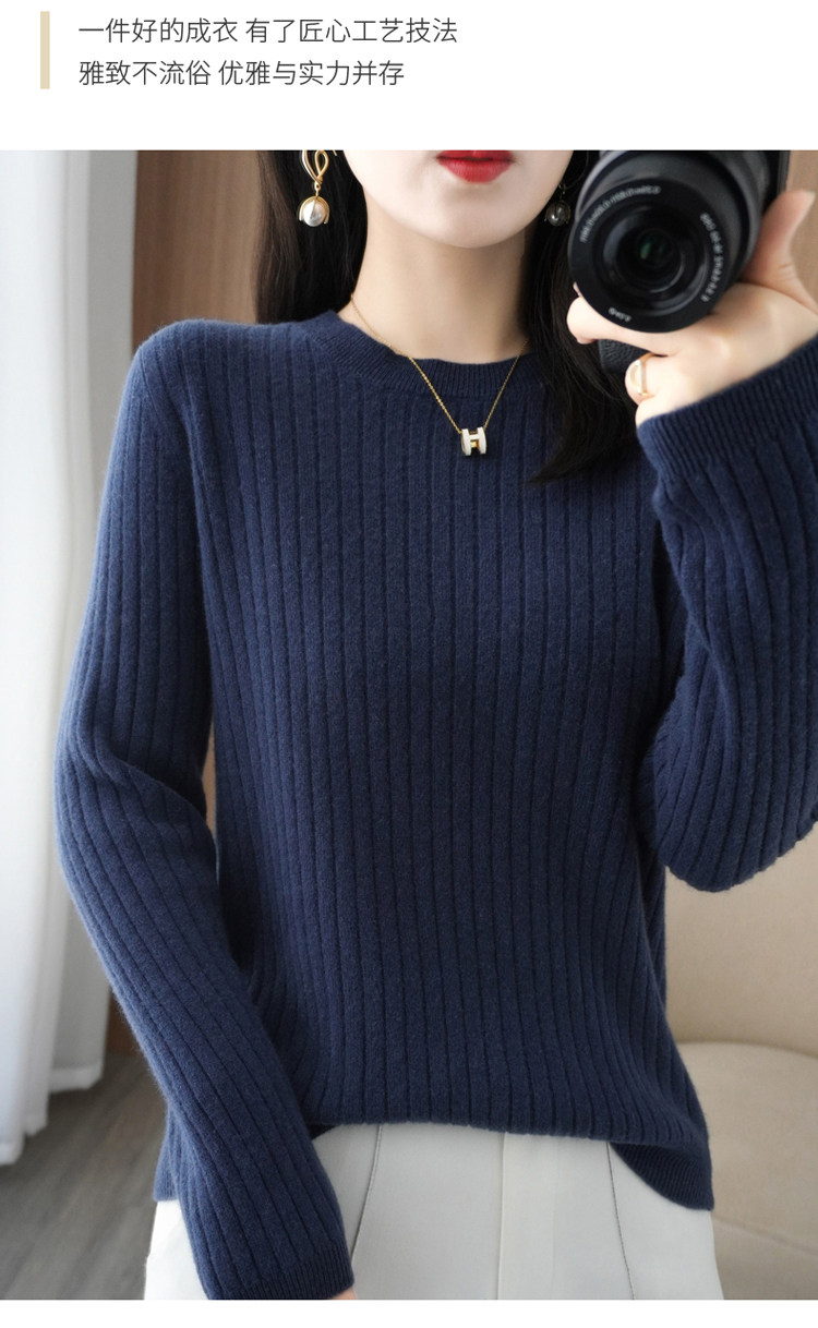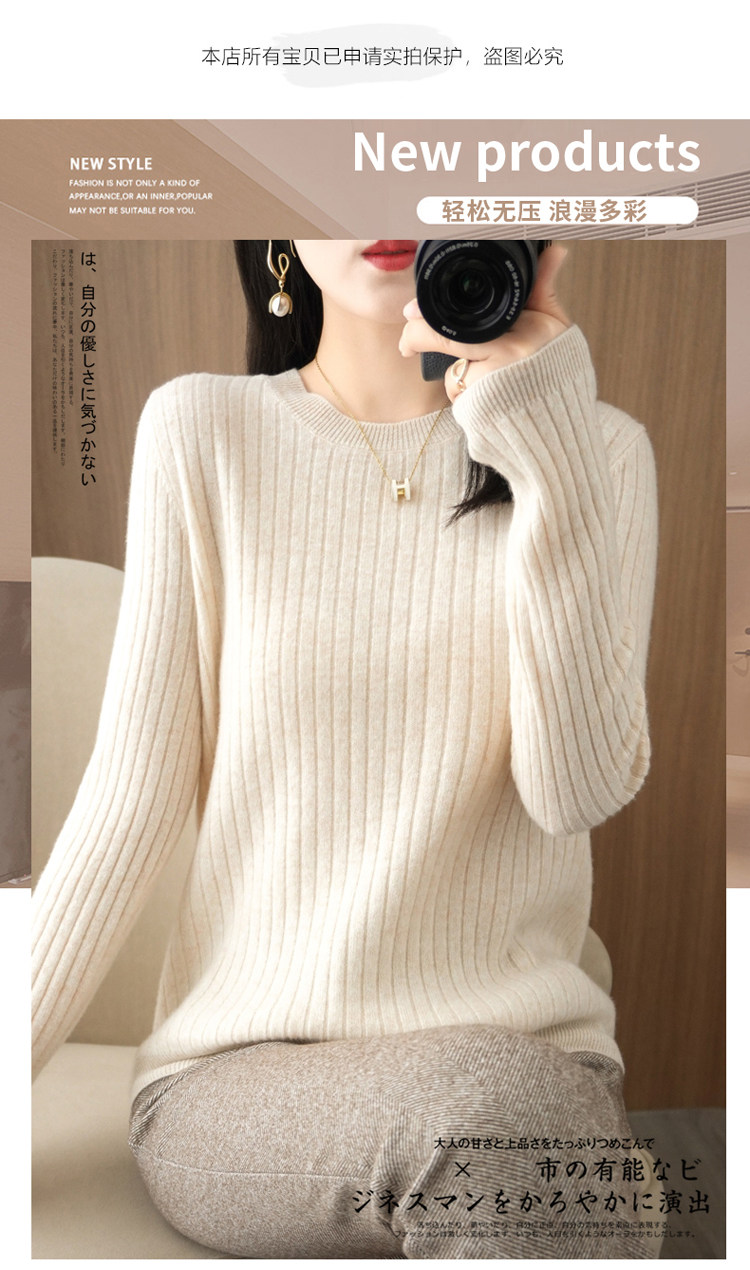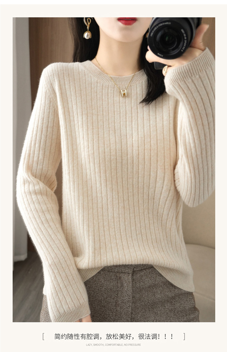 秋冬新款圓領毛衣女抽條內搭打底衫洋氣百搭寬鬆羊毛針織上衣春裝
