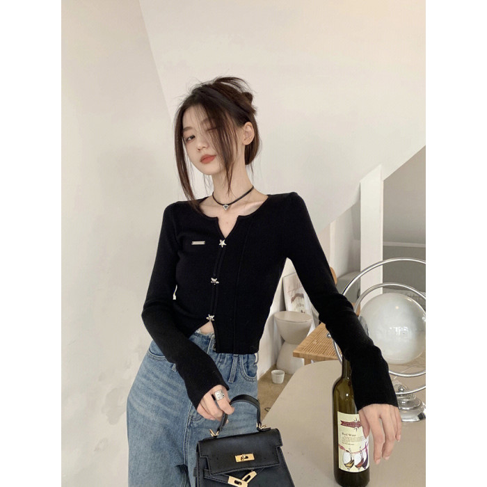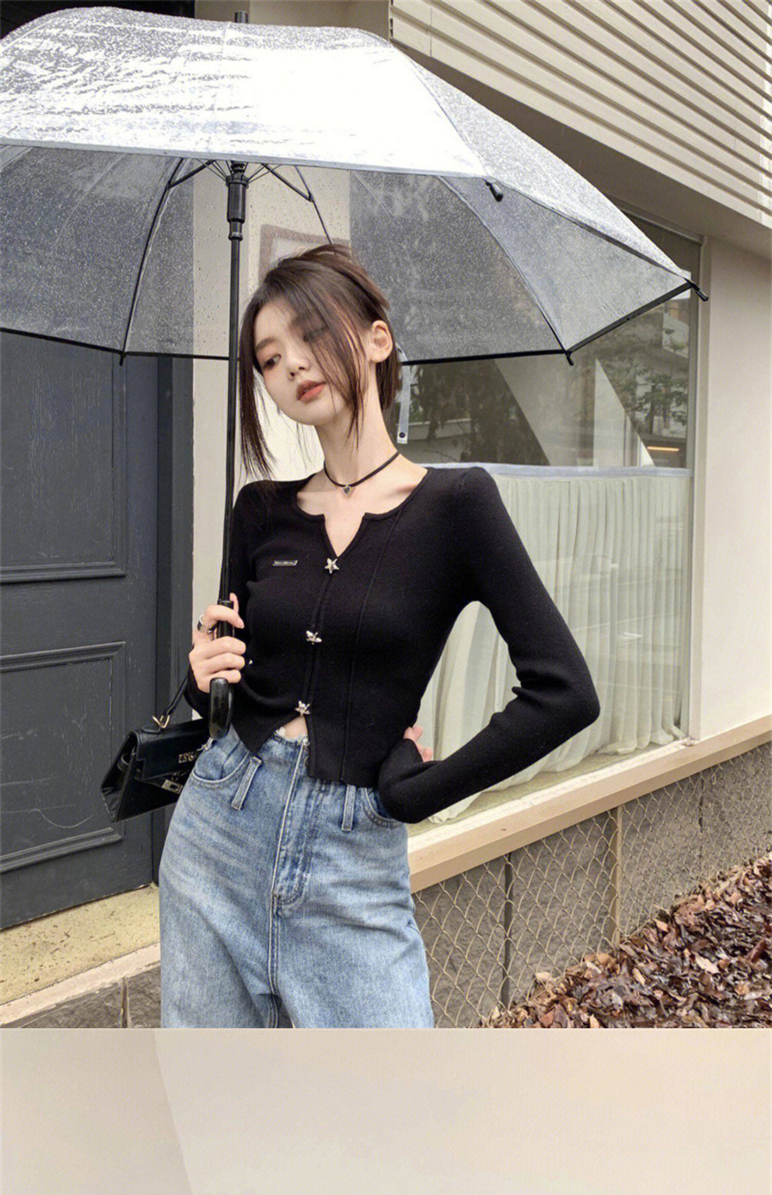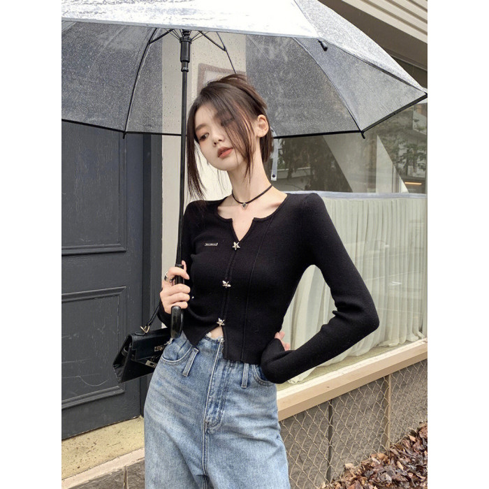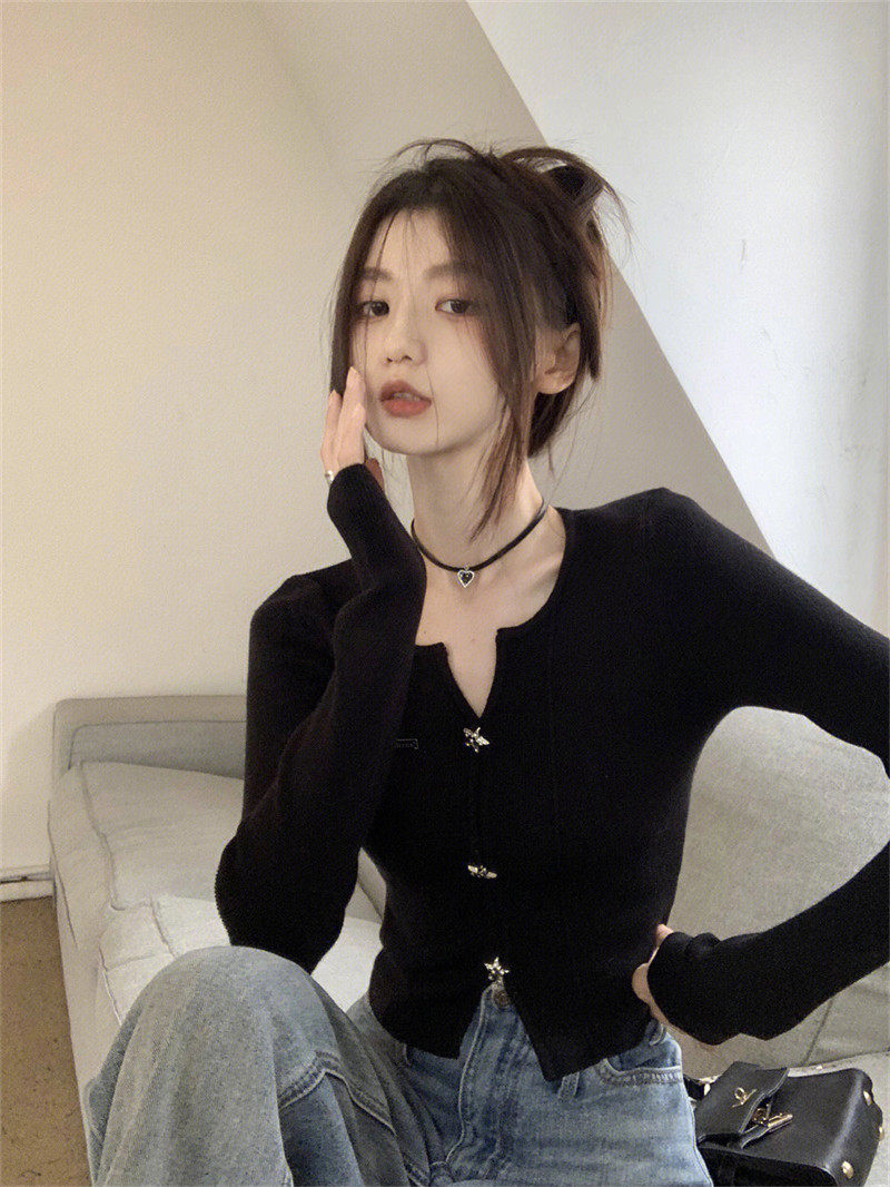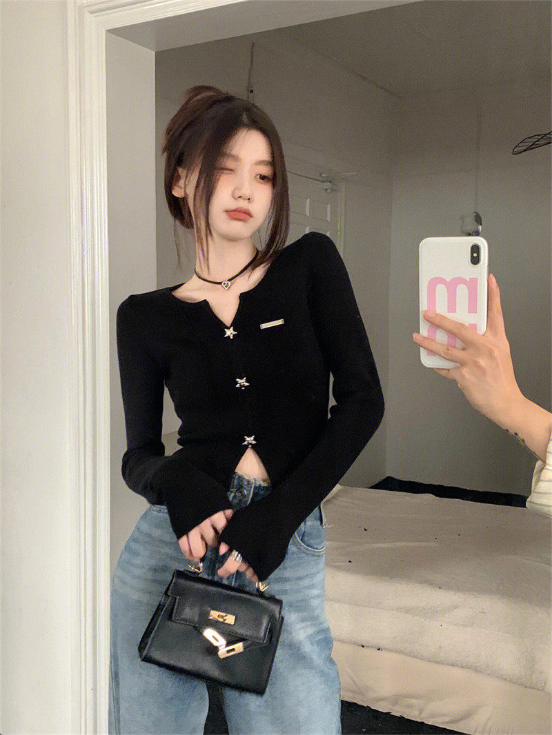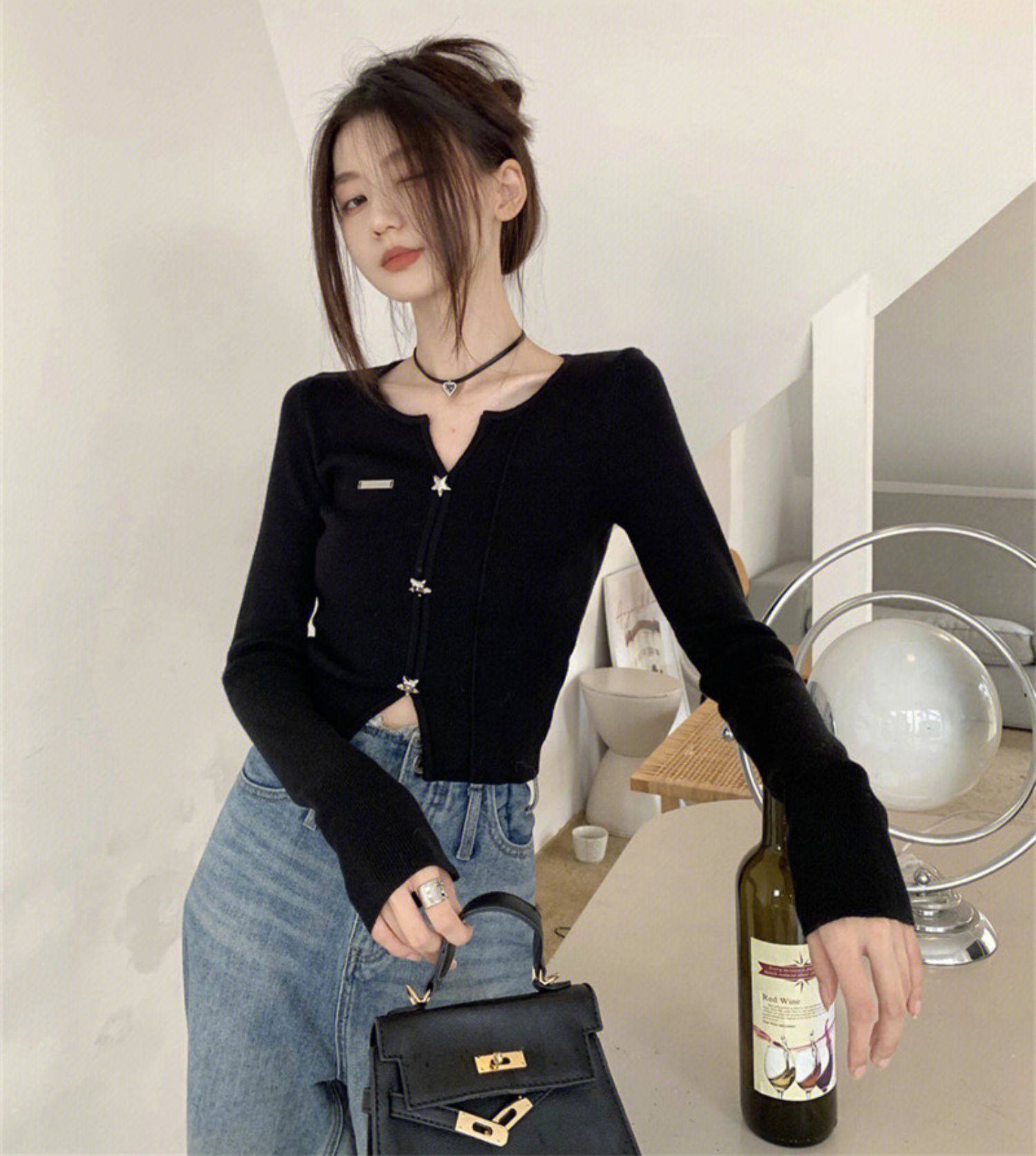 純欲v領黑色打底衫女針織開衫2025春秋裝新款辣妹上衣設計感小衆