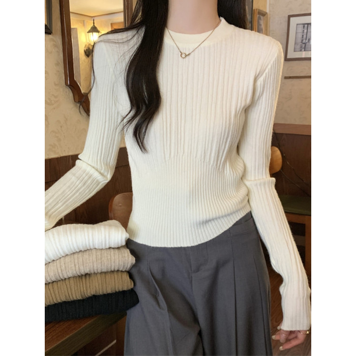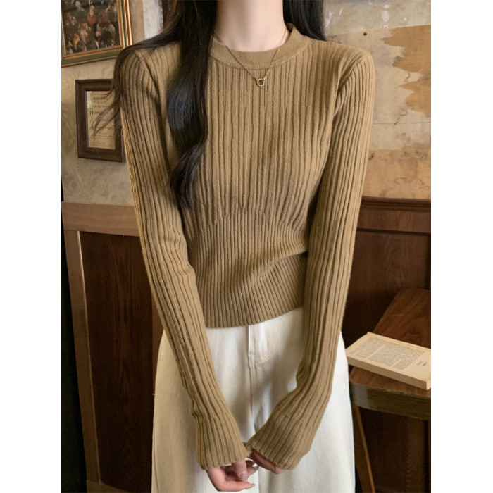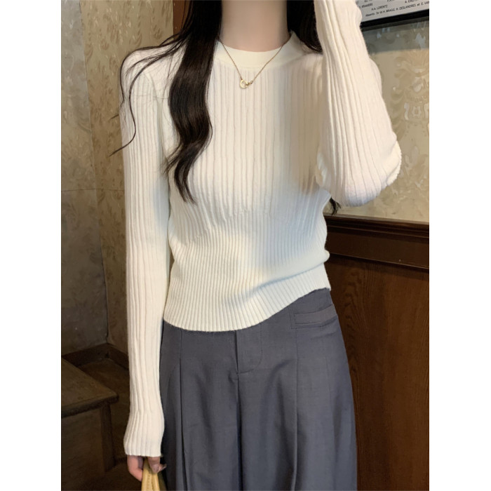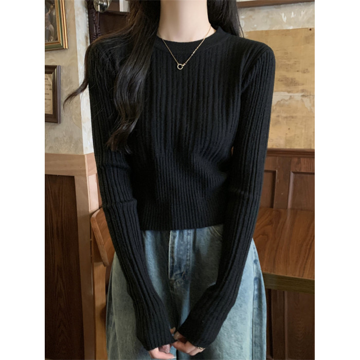 法式圓領黑色長袖毛衣衫女秋冬高級設計感純欲針織打底衫歐貨上衣
