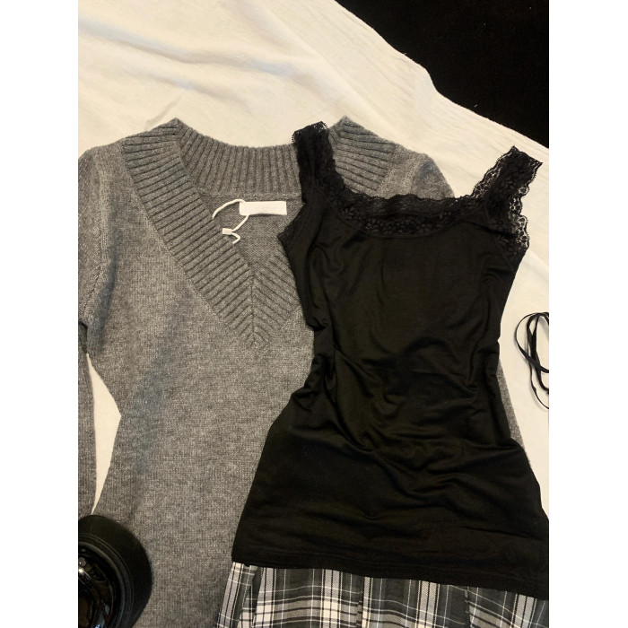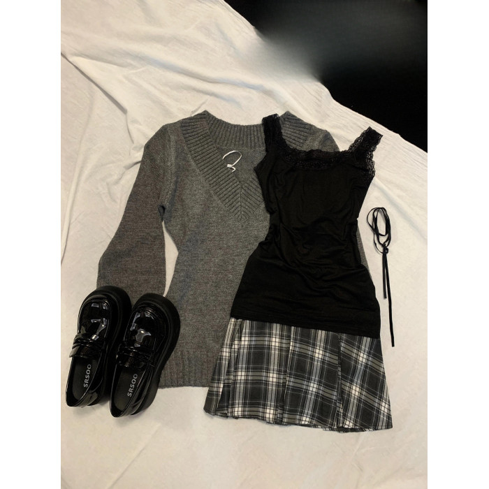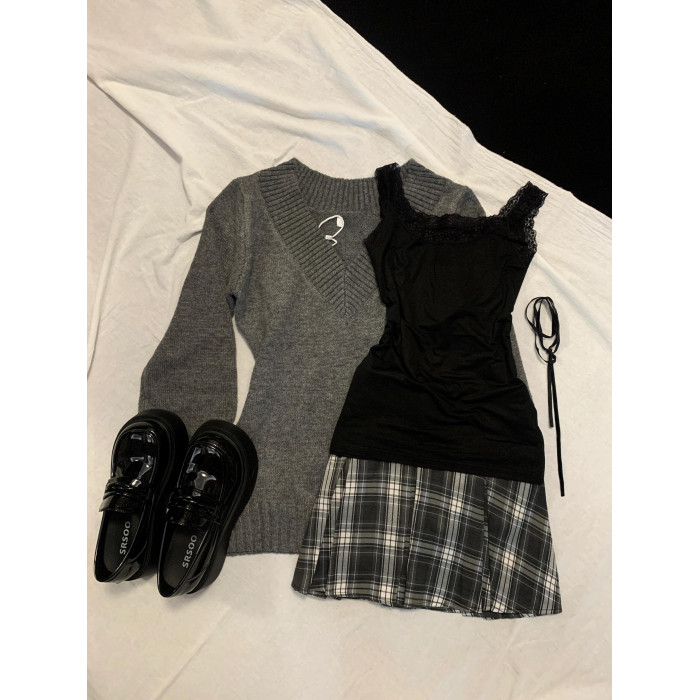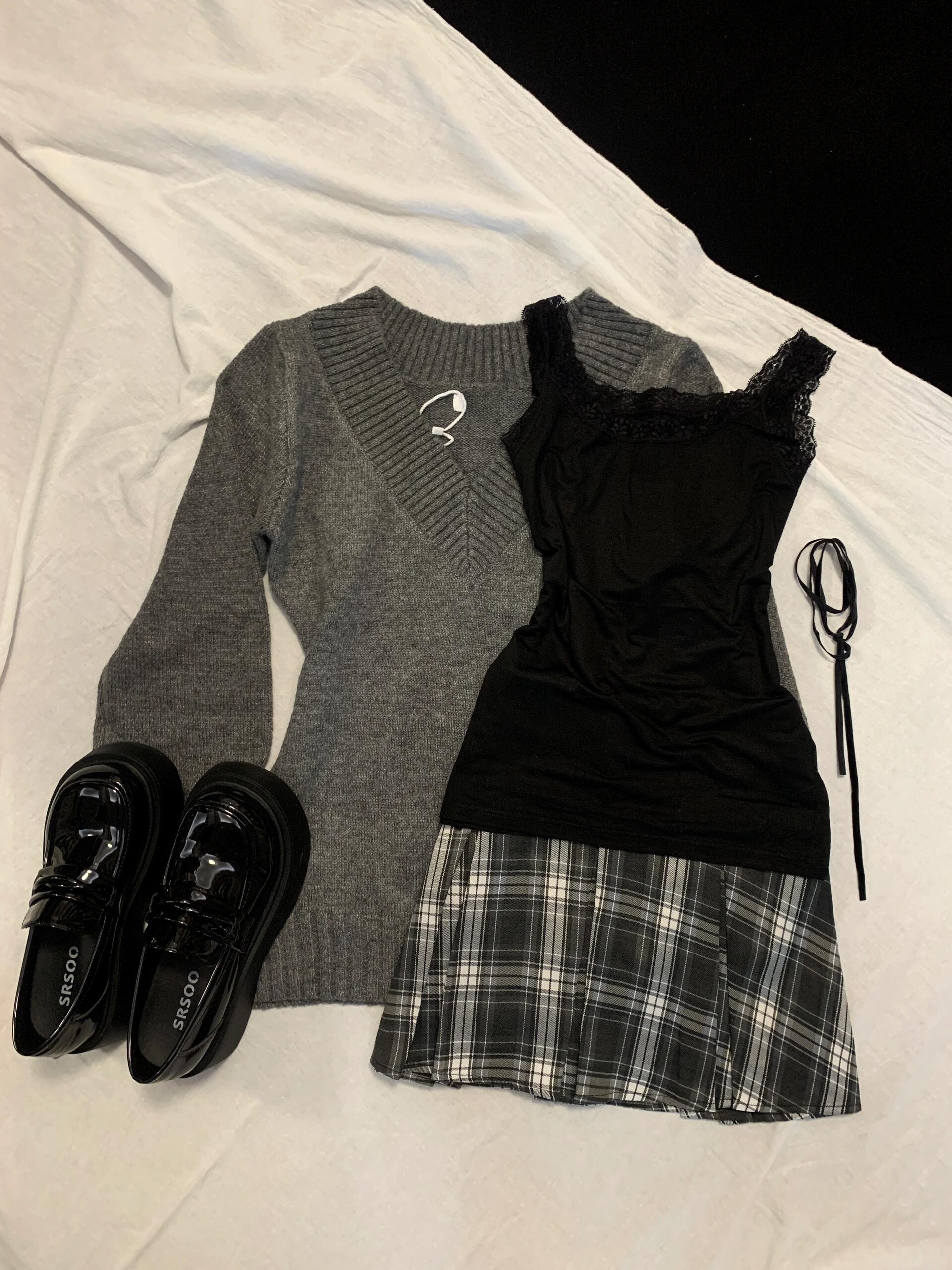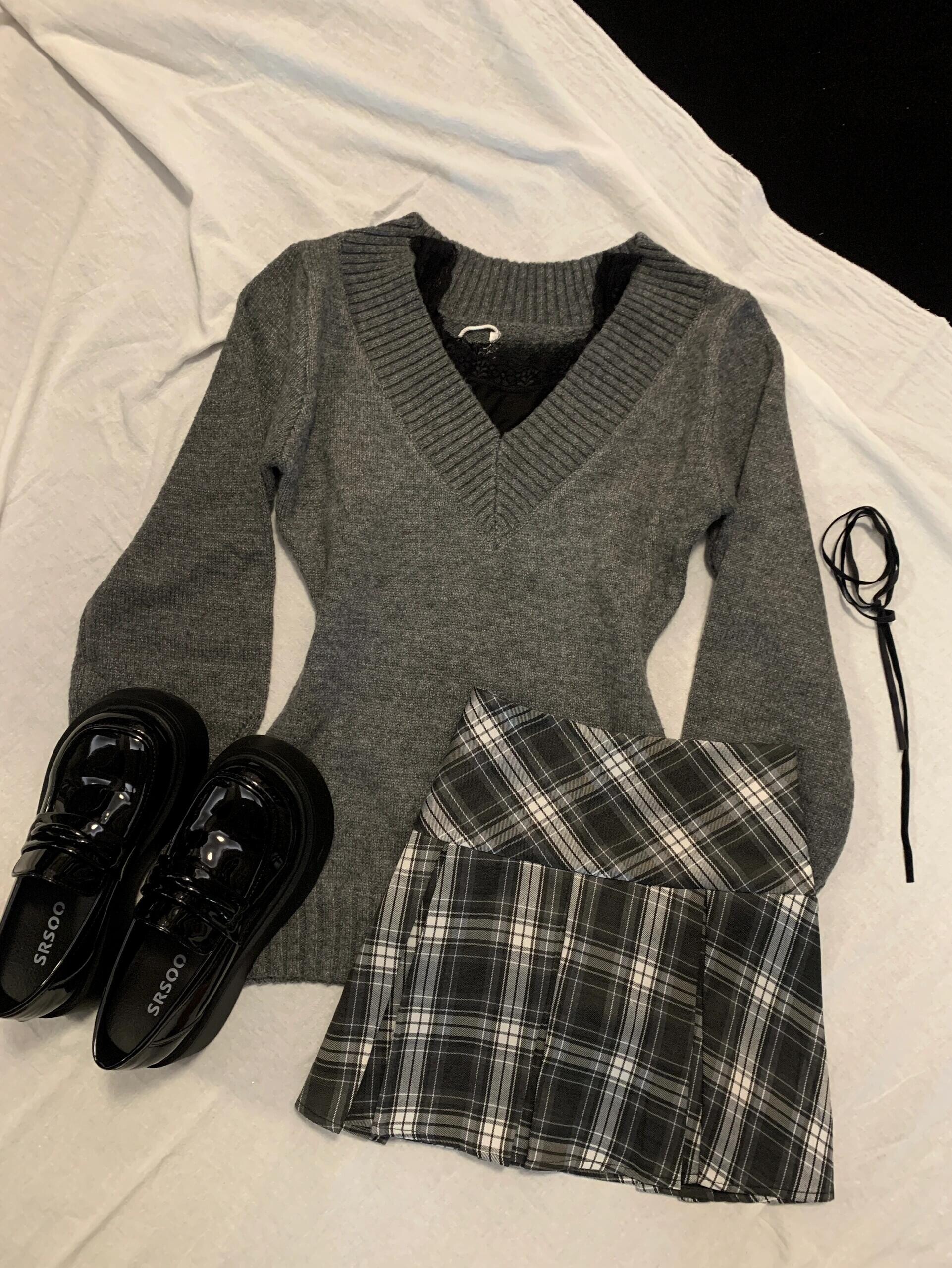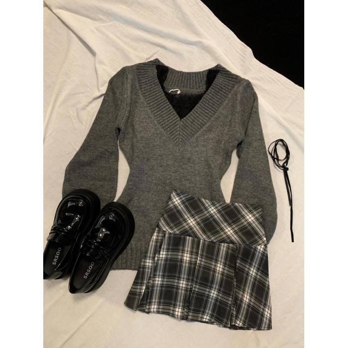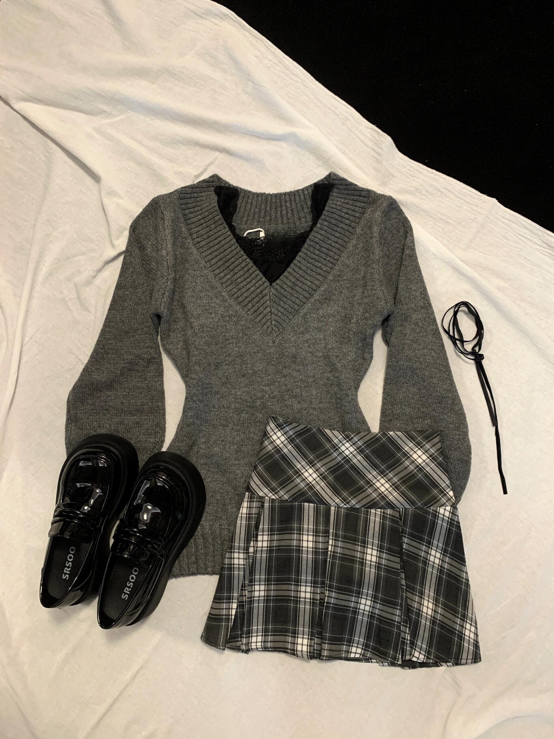 韓系古著感V領毛衣女秋冬2025新款灰色收腰修身顯瘦軟糯針織上衣