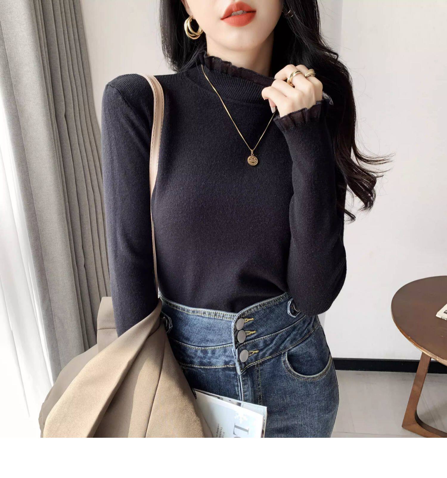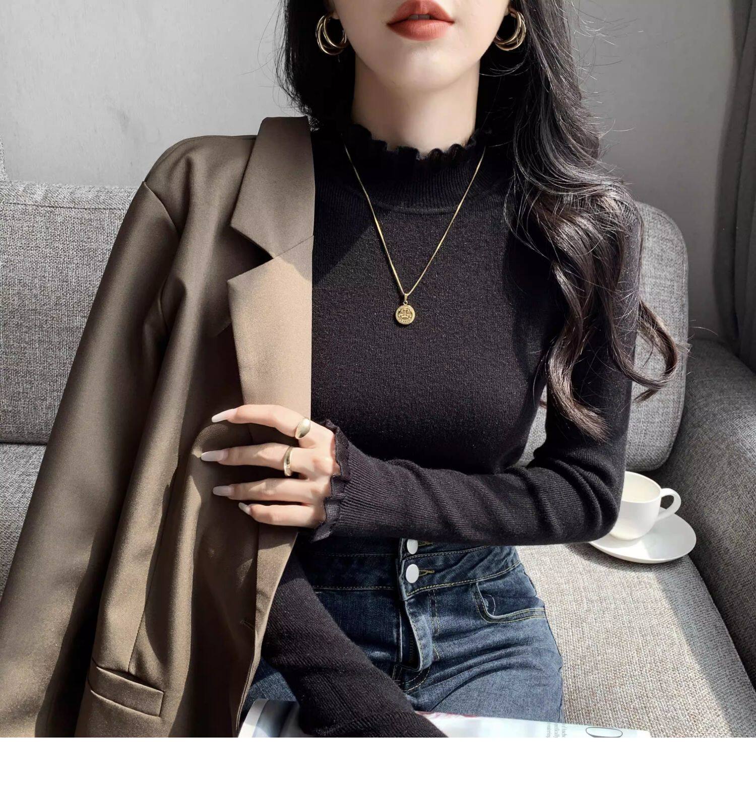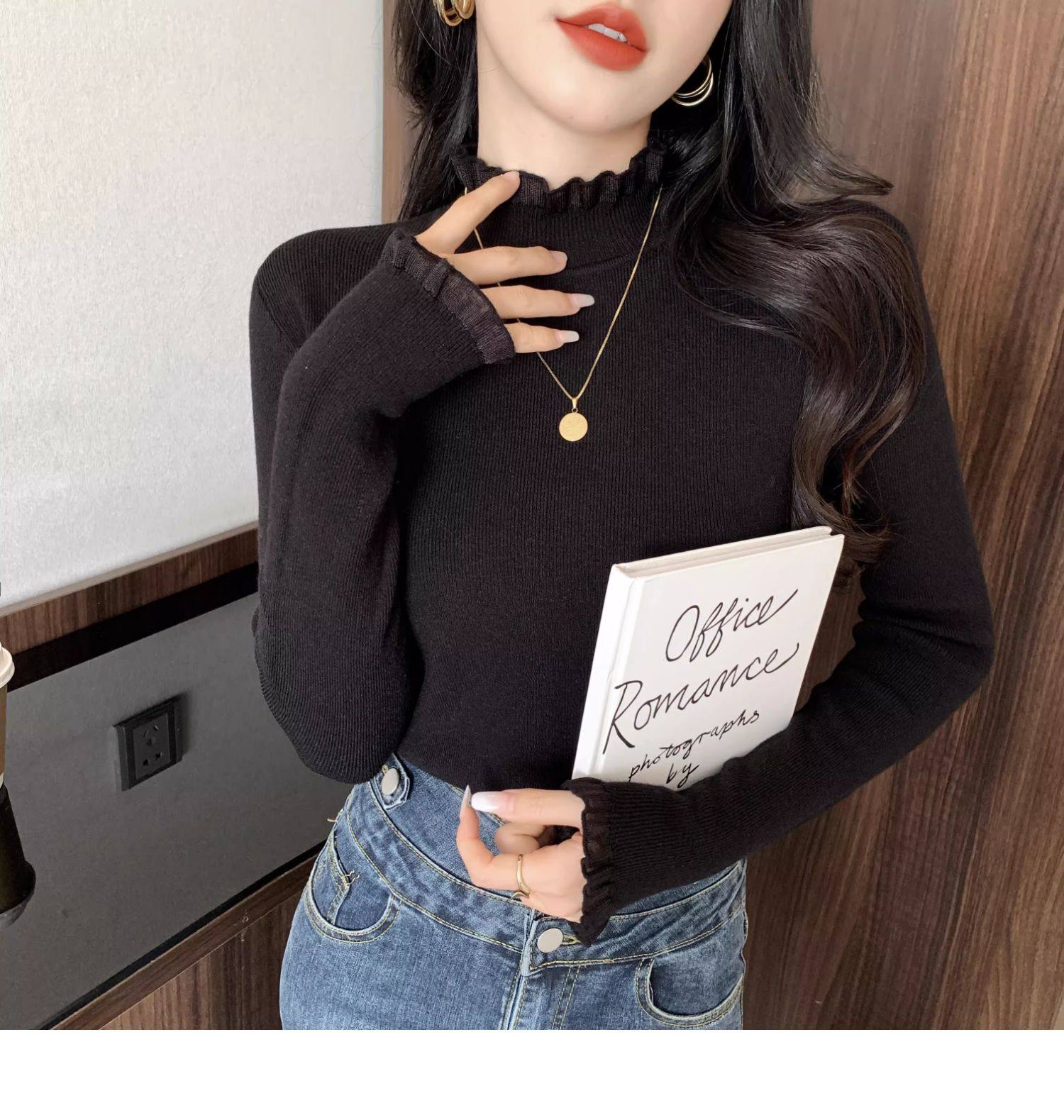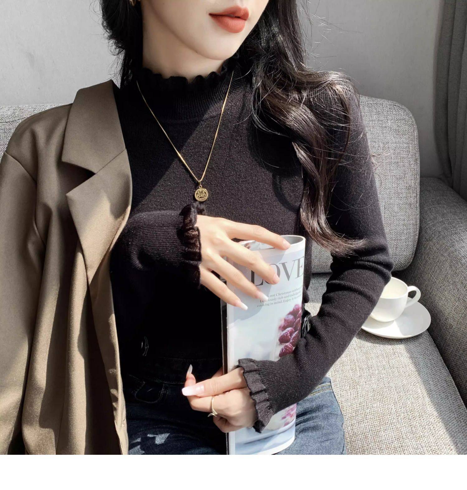 2025年秋季絕美蕾絲半高領長袖針織衫女修身內搭加絨毛衣打底上衣