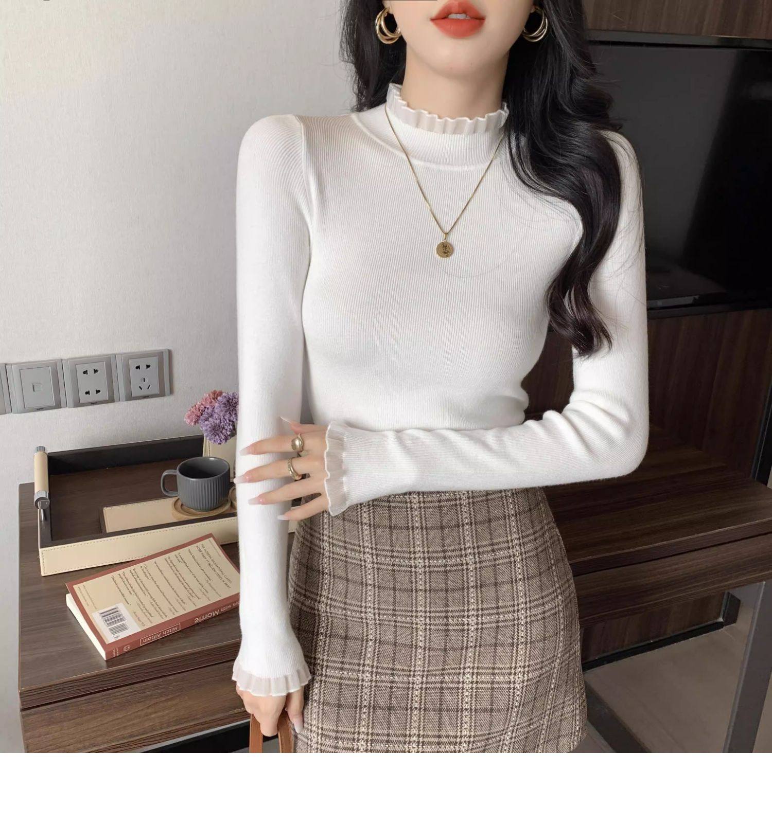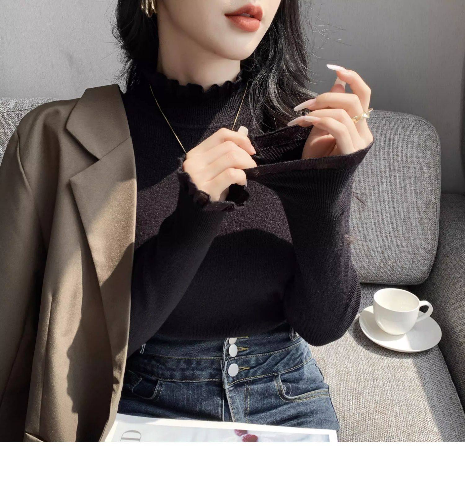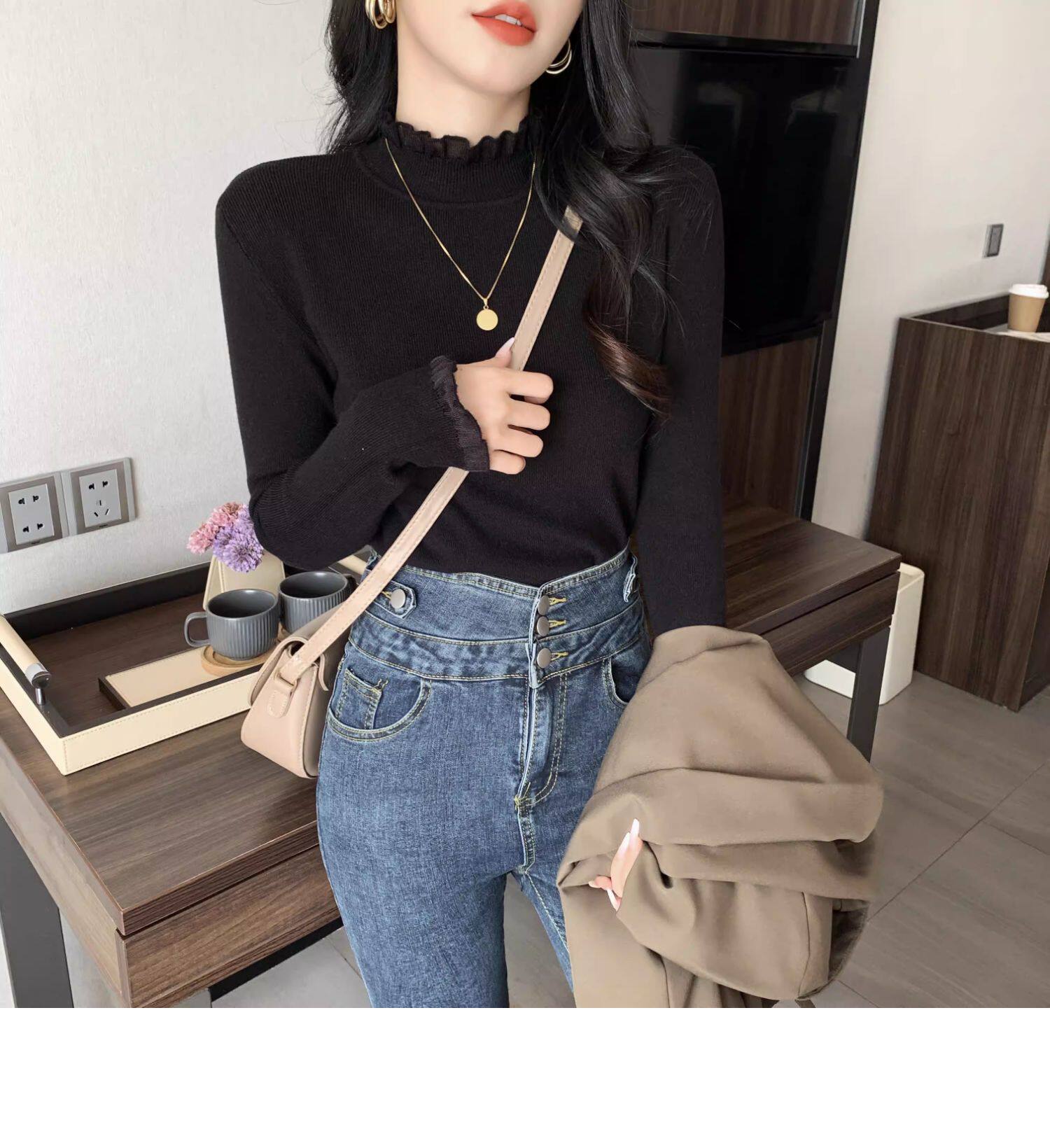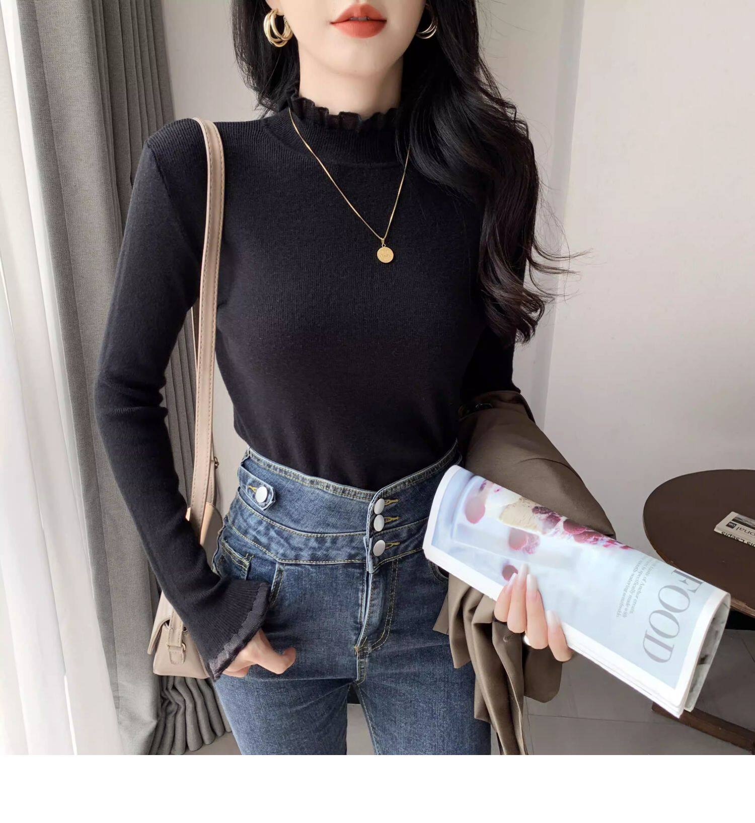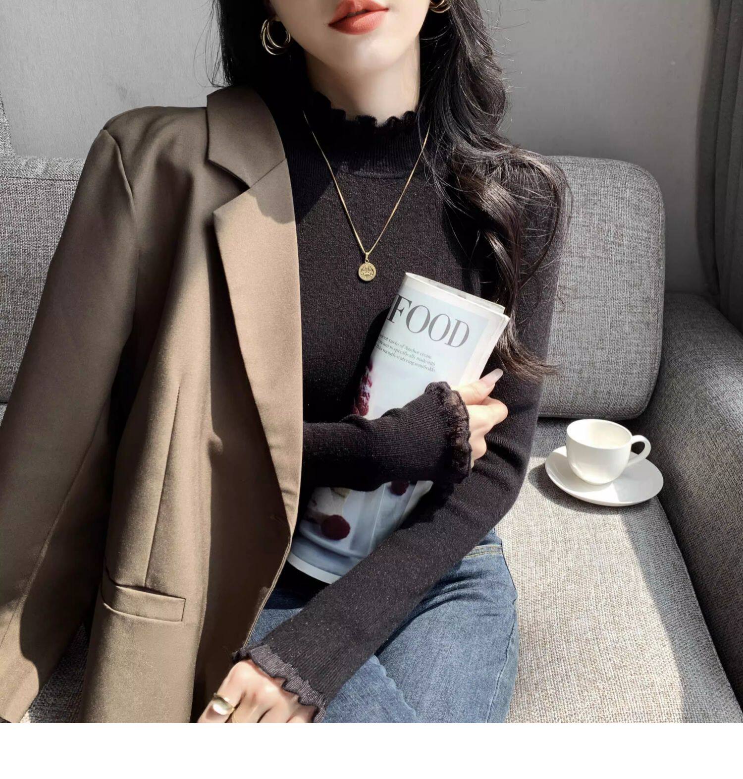 2025年秋季絕美蕾絲半高領長袖針織衫女修身內搭加絨毛衣打底上衣