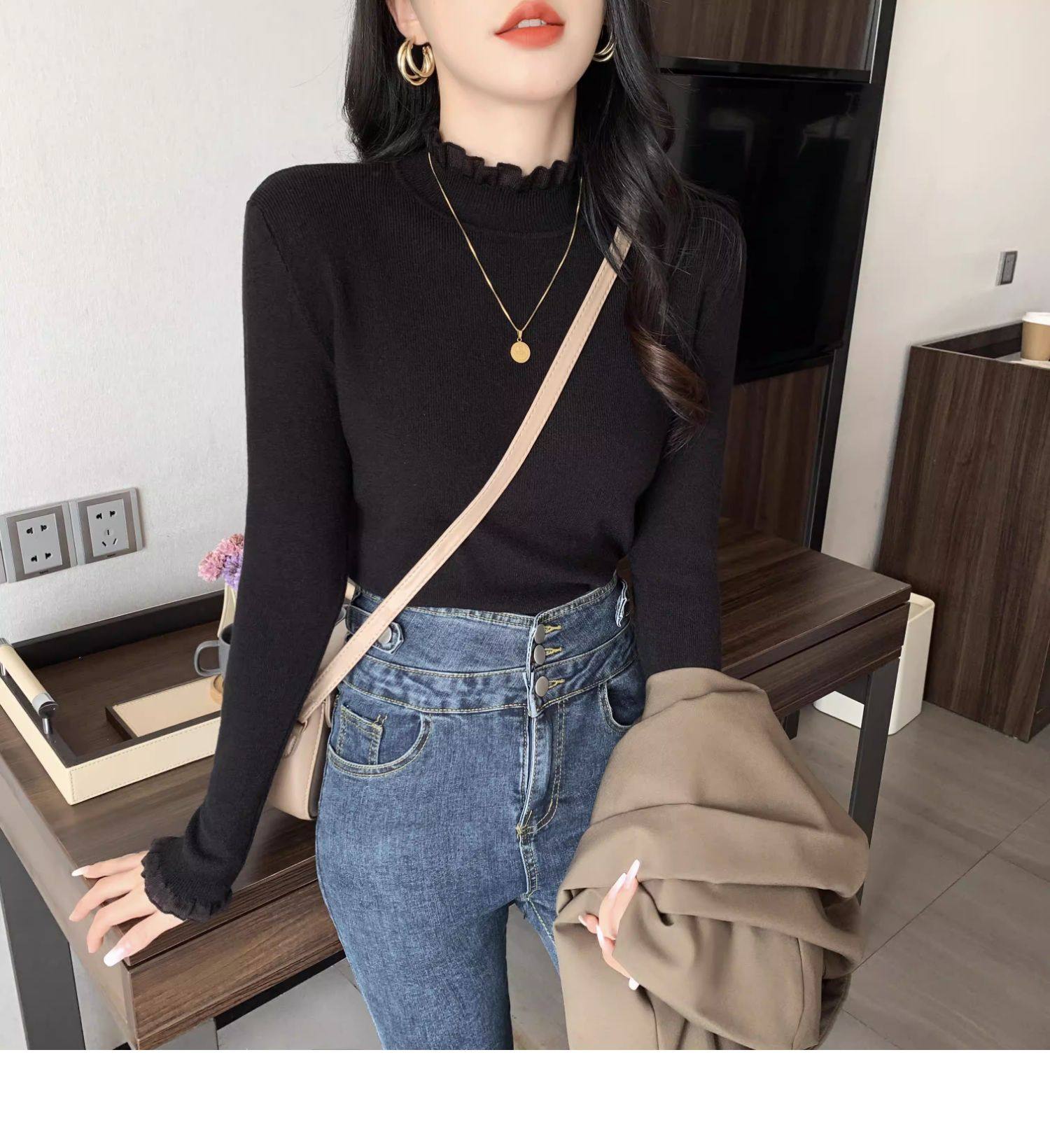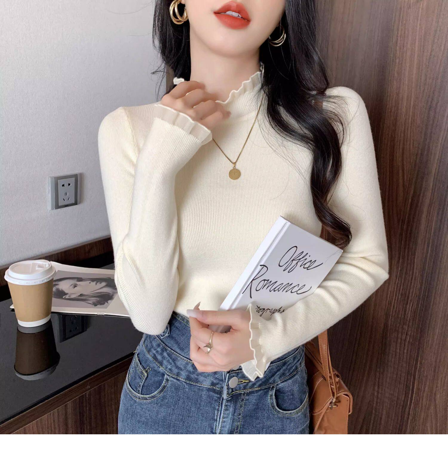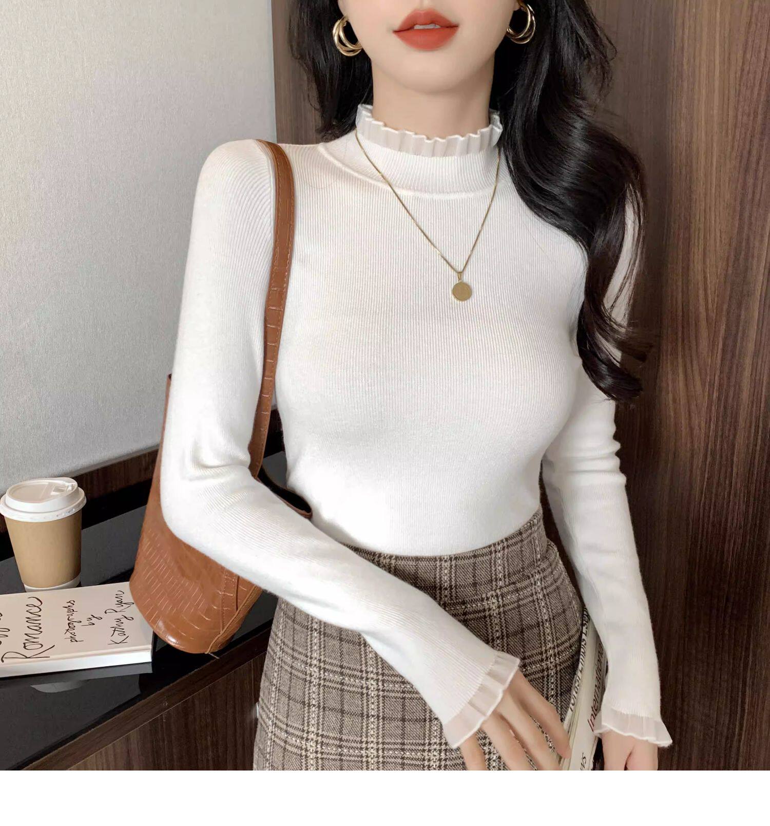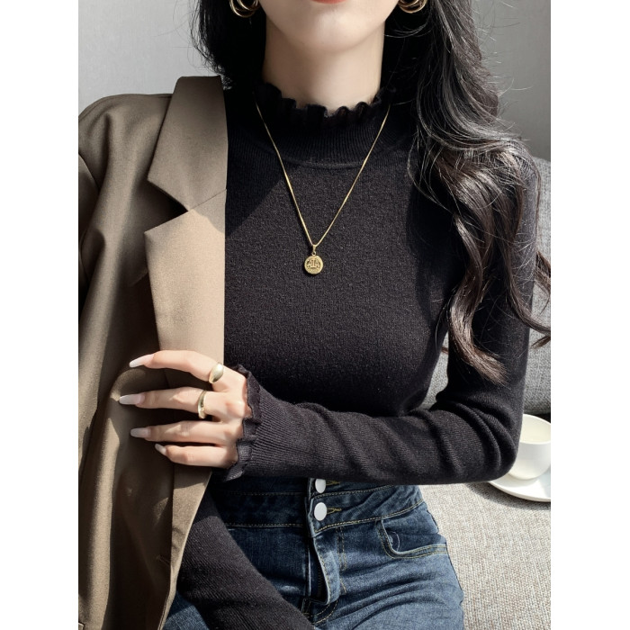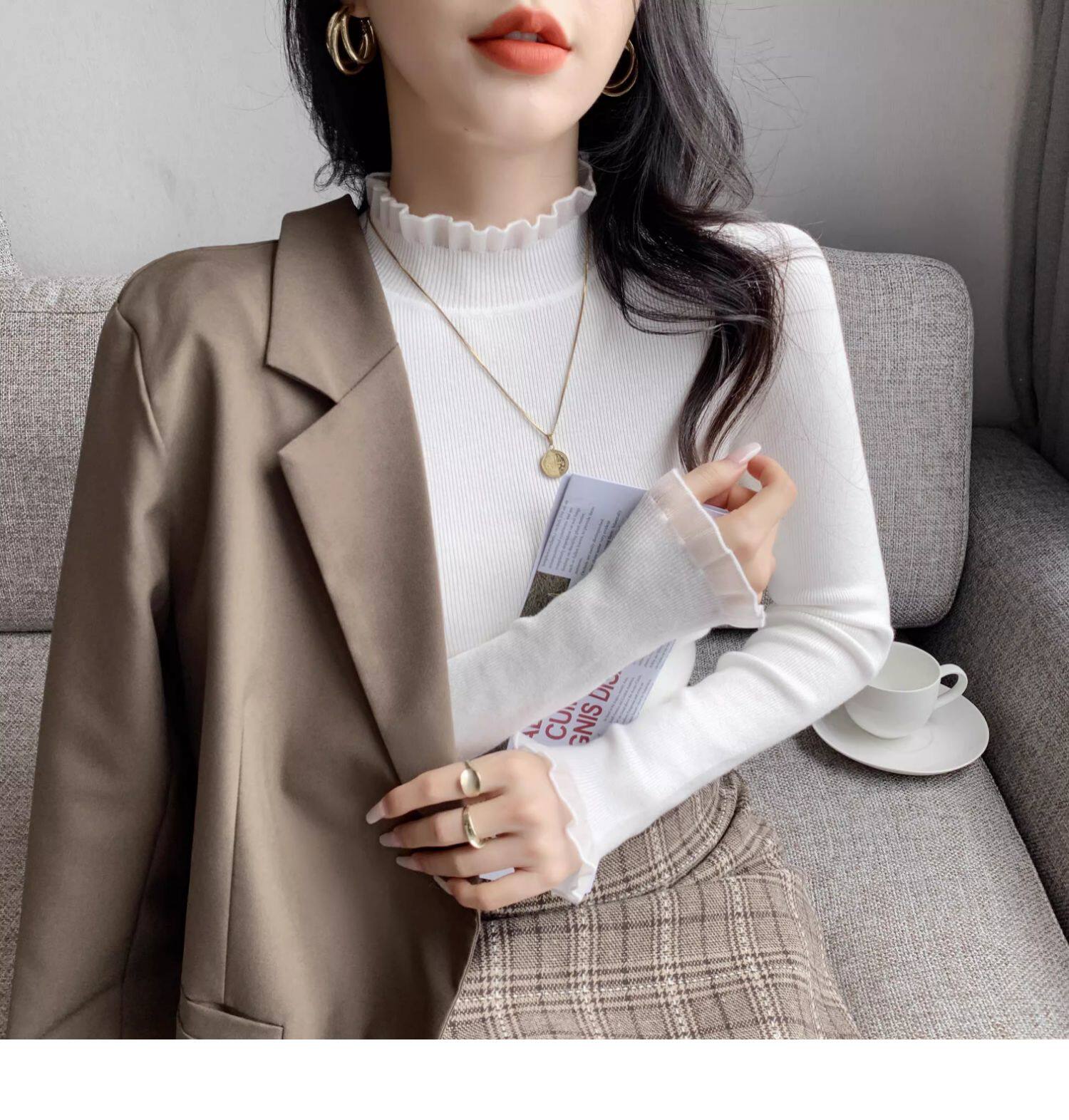 2025年秋季絕美蕾絲半高領長袖針織衫女修身內搭加絨毛衣打底上衣