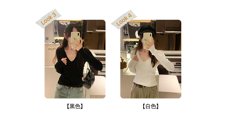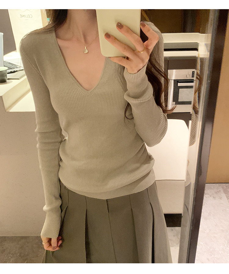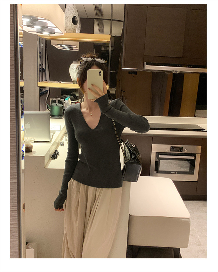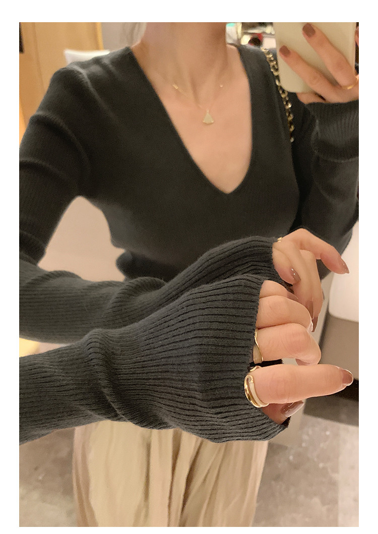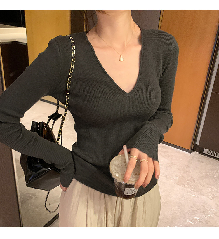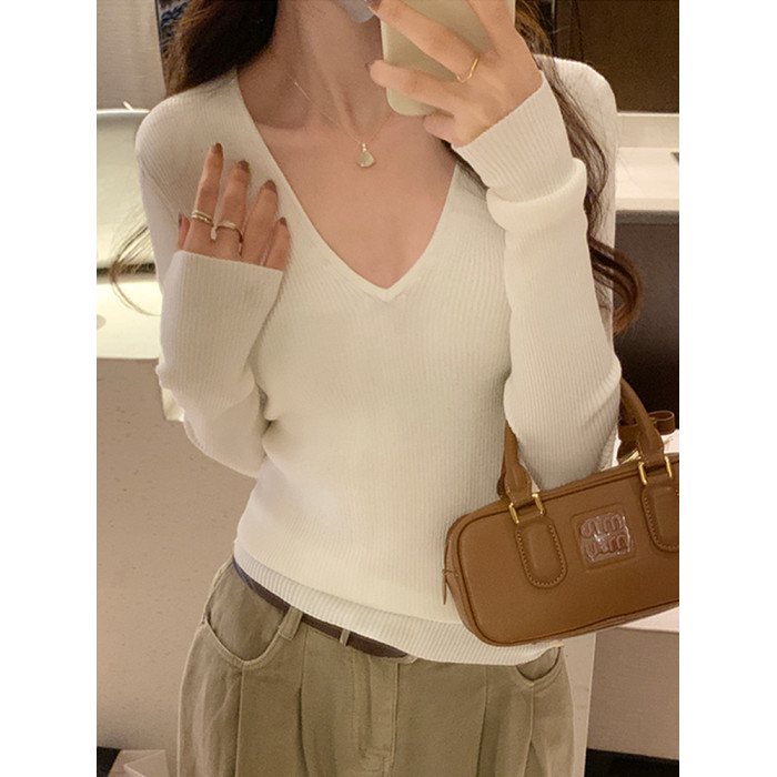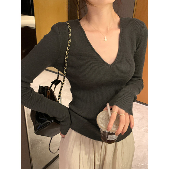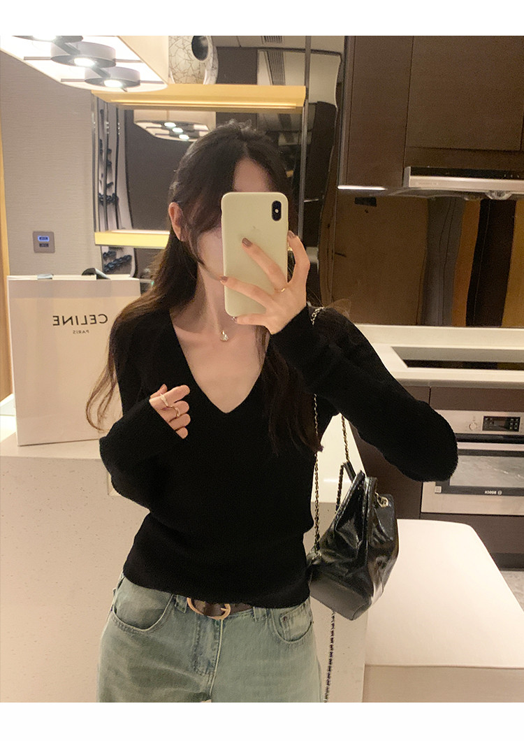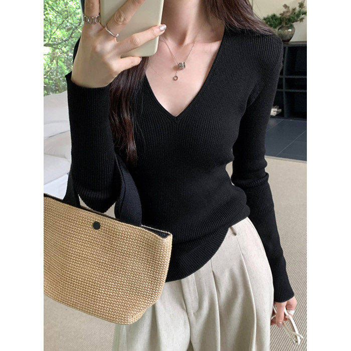 早秋外穿黑色V領高級感長袖內搭毛衣女冬絕美顯瘦針織打底衫上衣