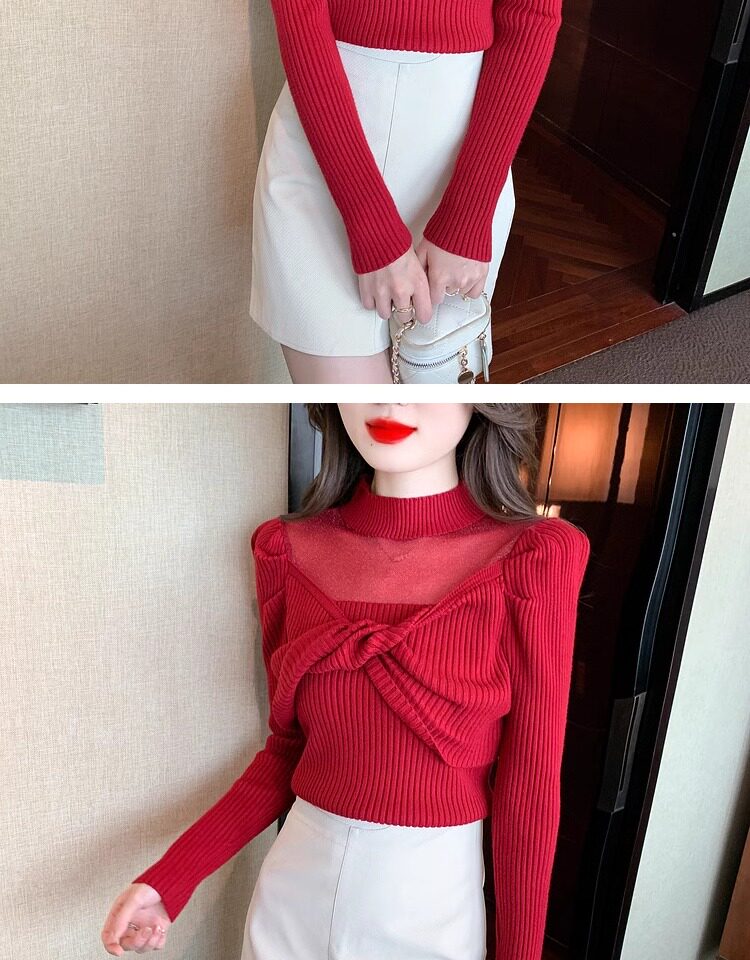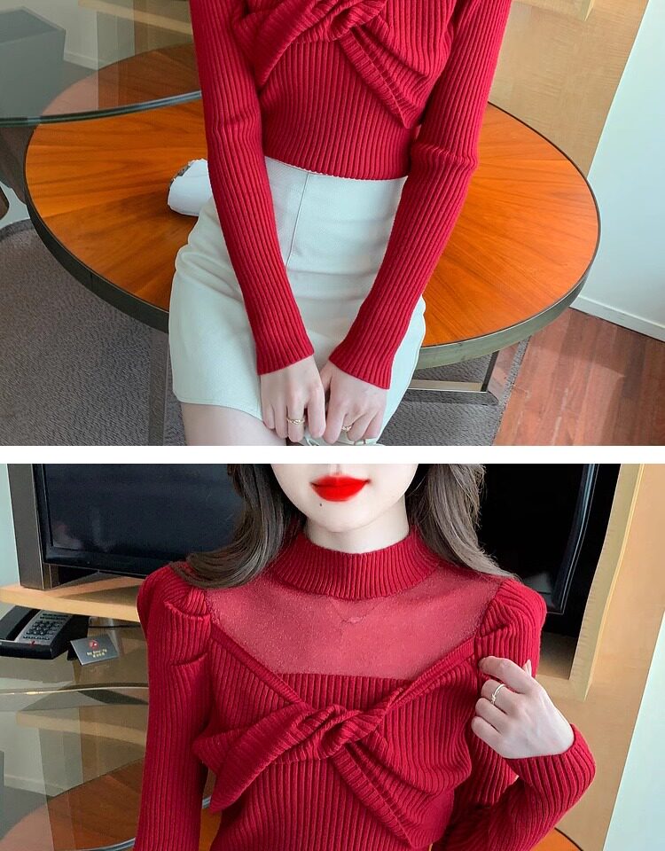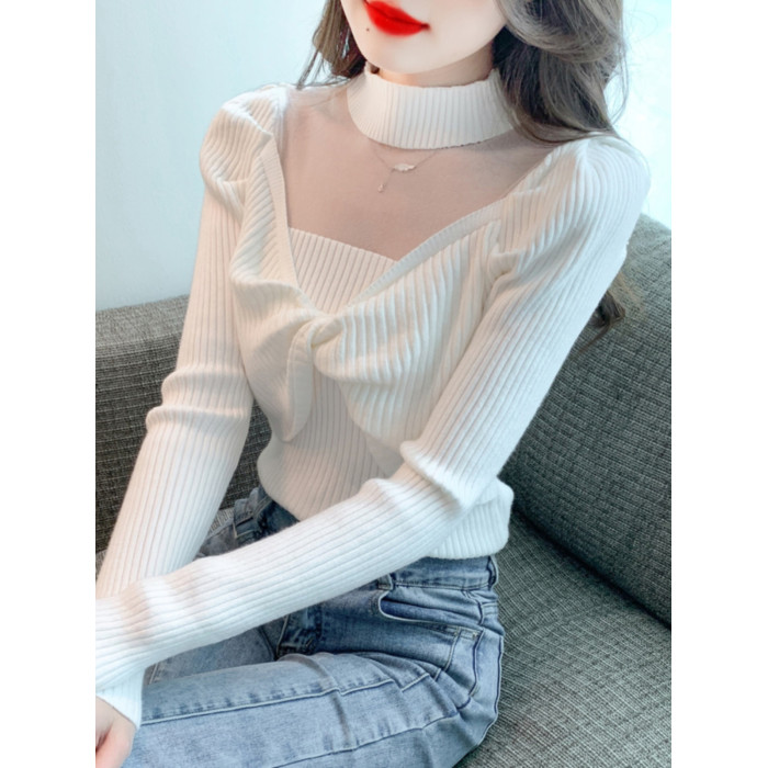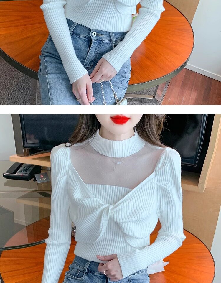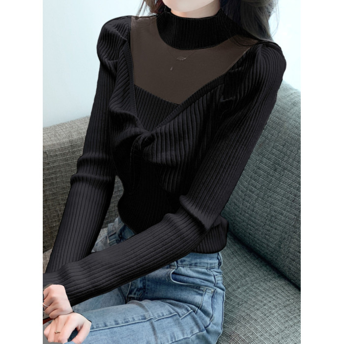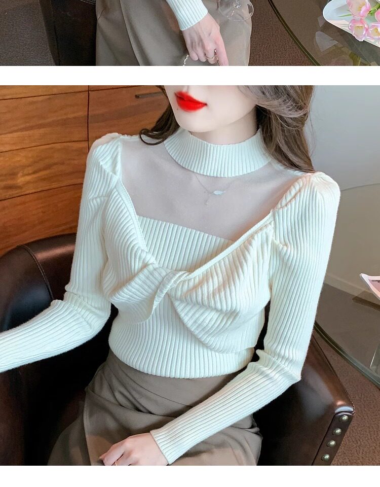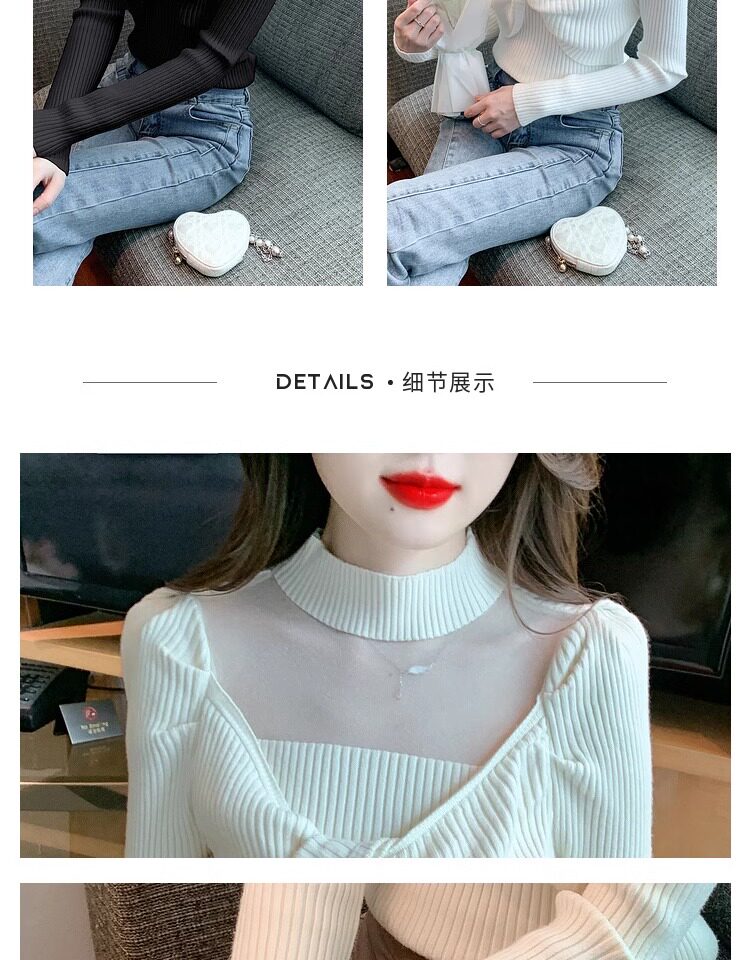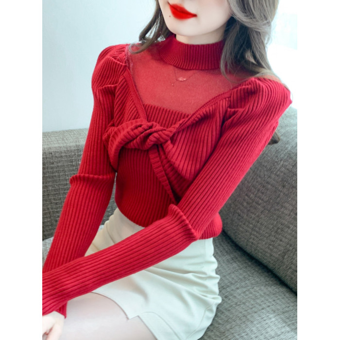 2024年新款秋冬半高領長袖網紗針織衫女氣質扭結毛衣打底衫上衣潮