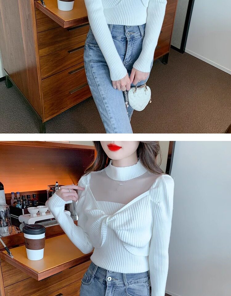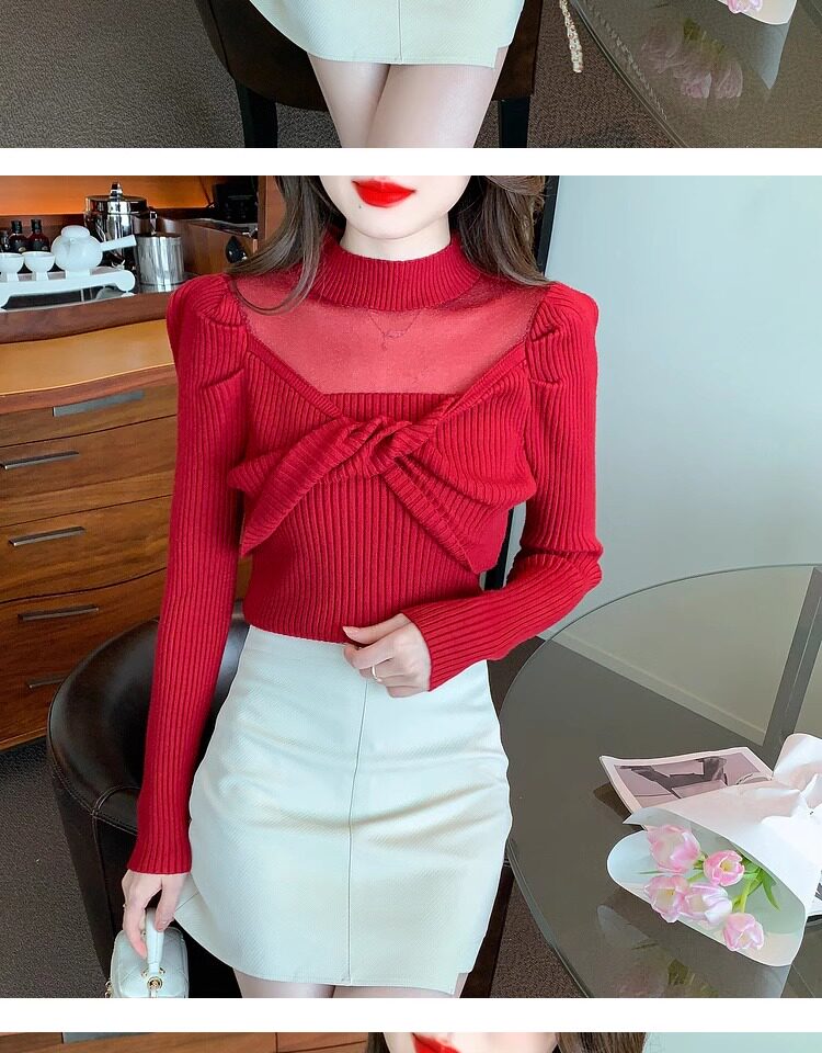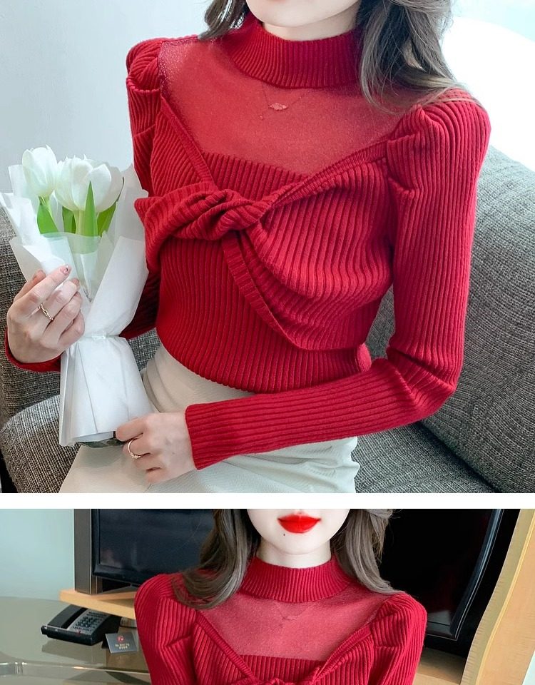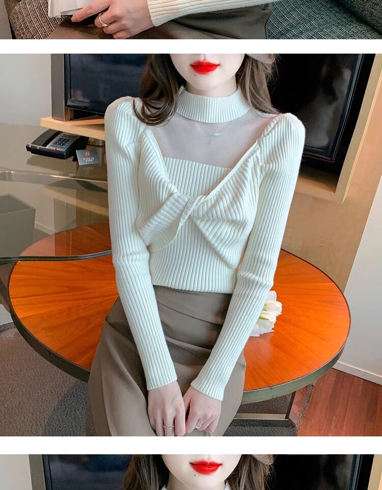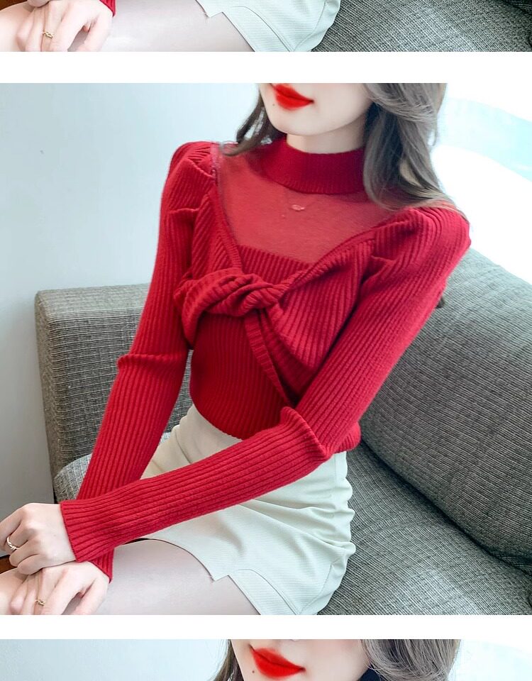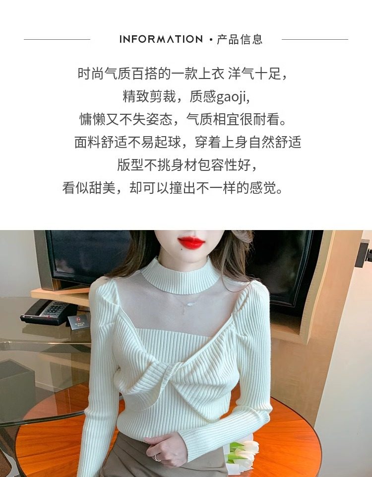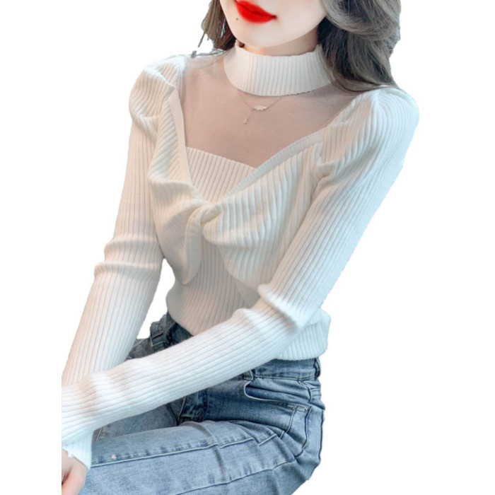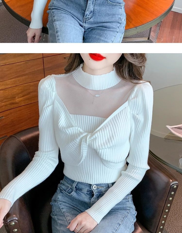 2024年新款秋冬半高領長袖網紗針織衫女氣質扭結毛衣打底衫上衣潮