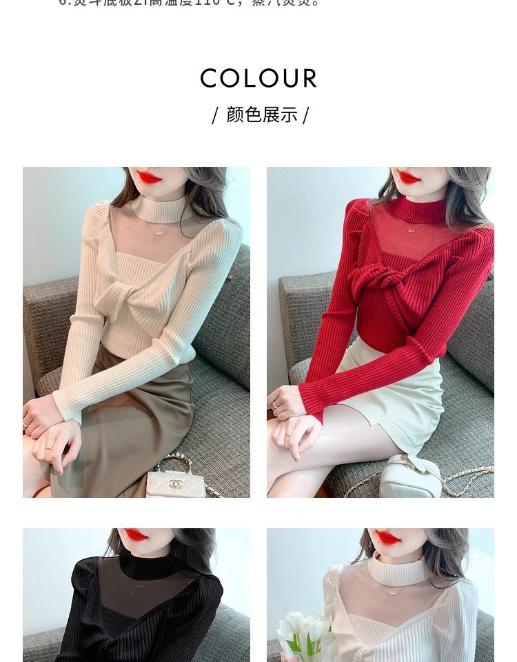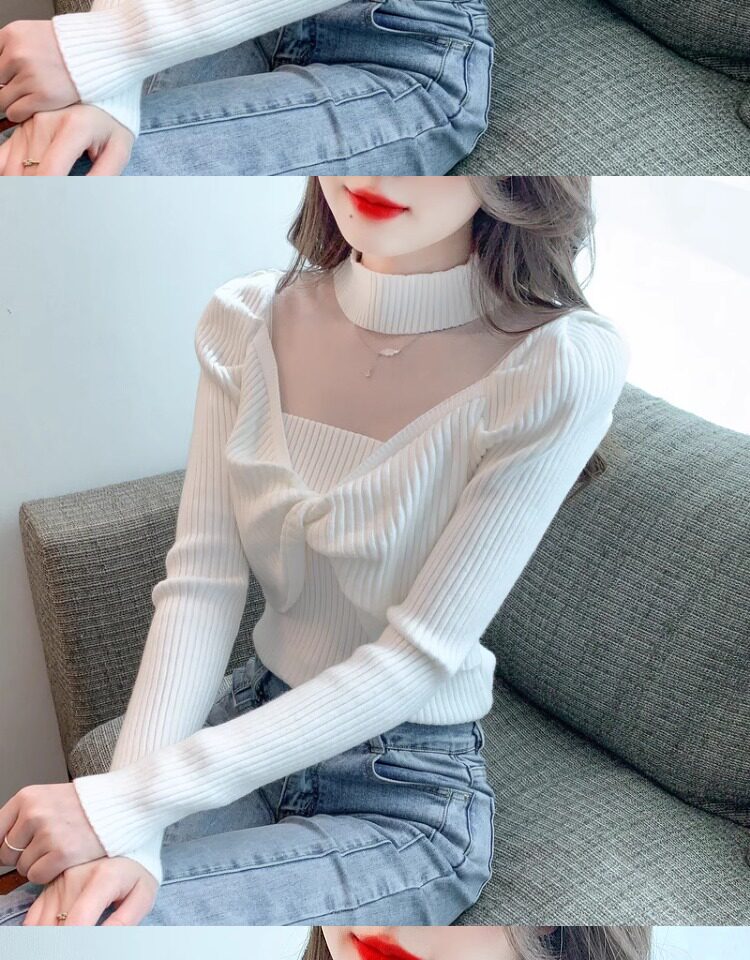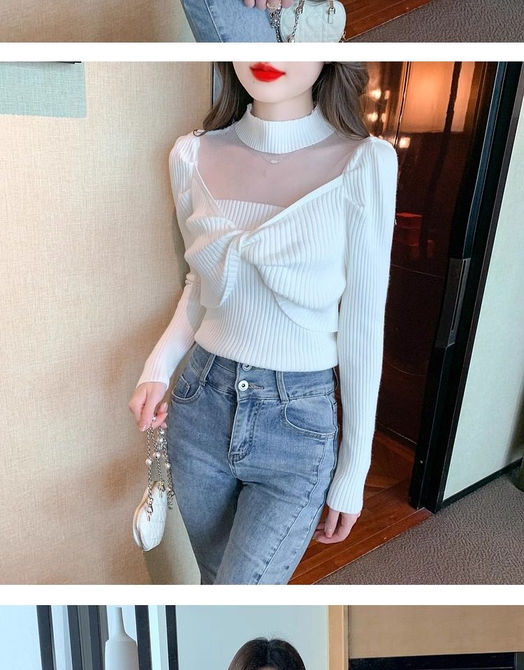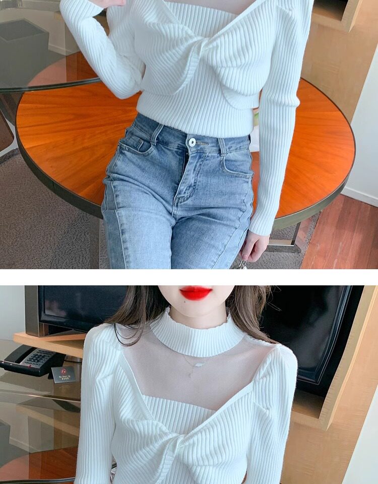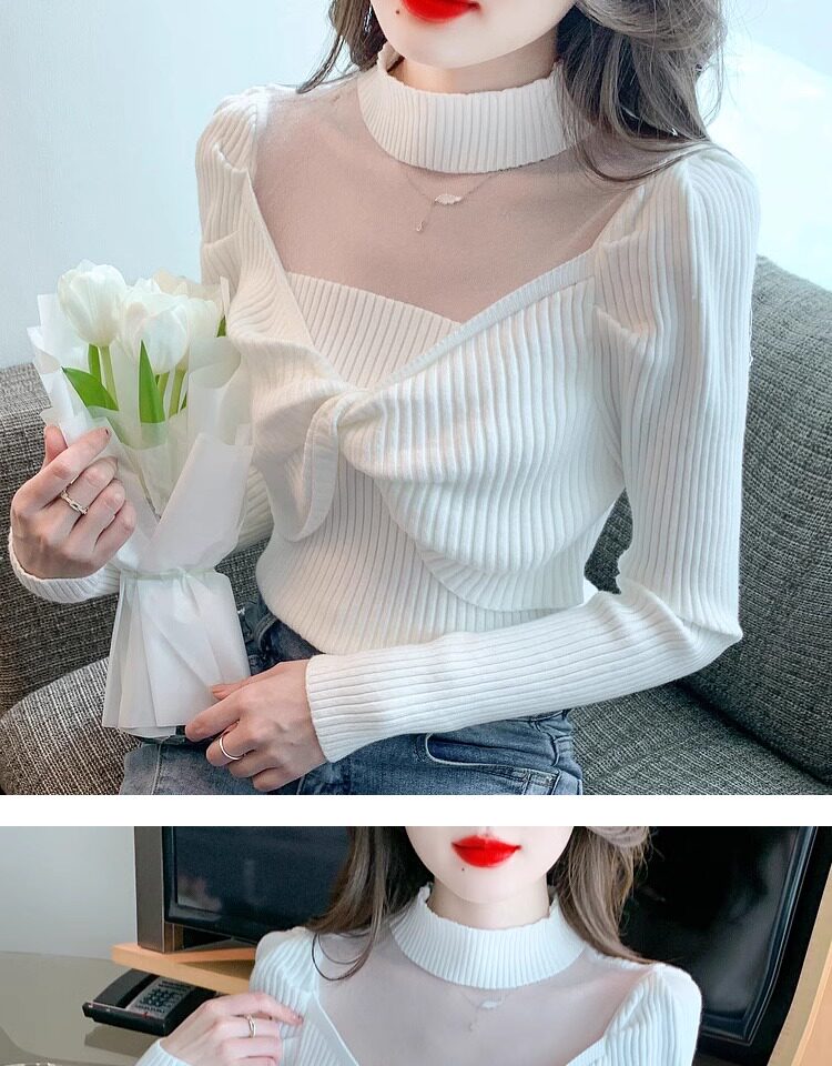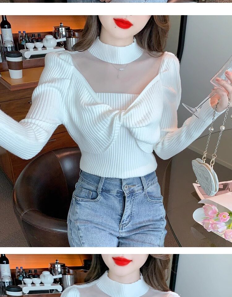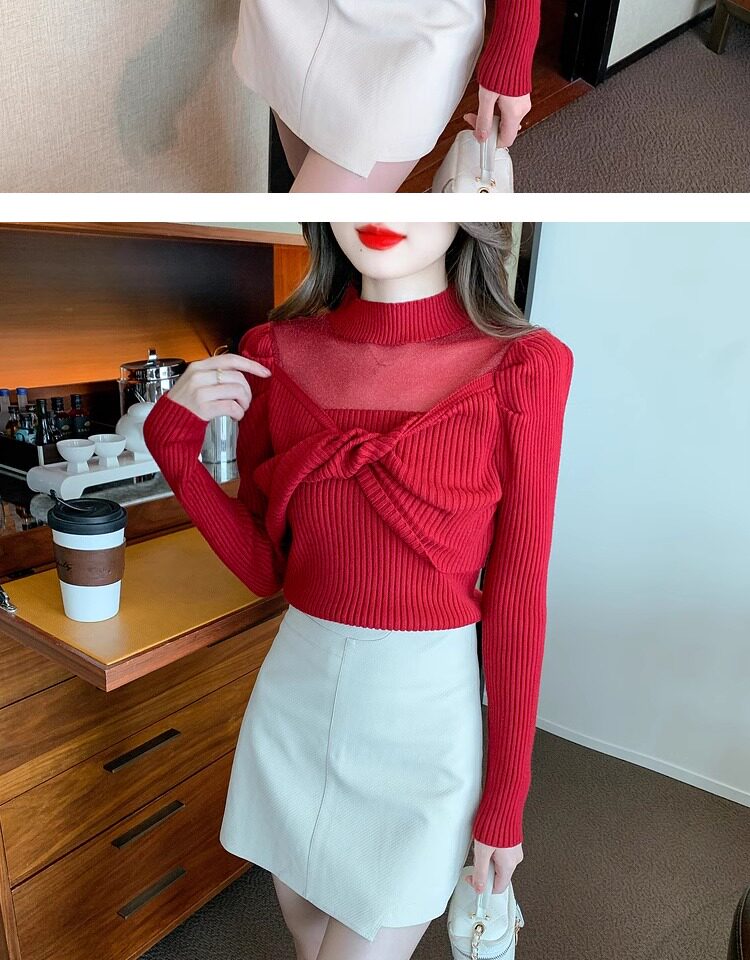 2024年新款秋冬半高領長袖網紗針織衫女氣質扭結毛衣打底衫上衣潮