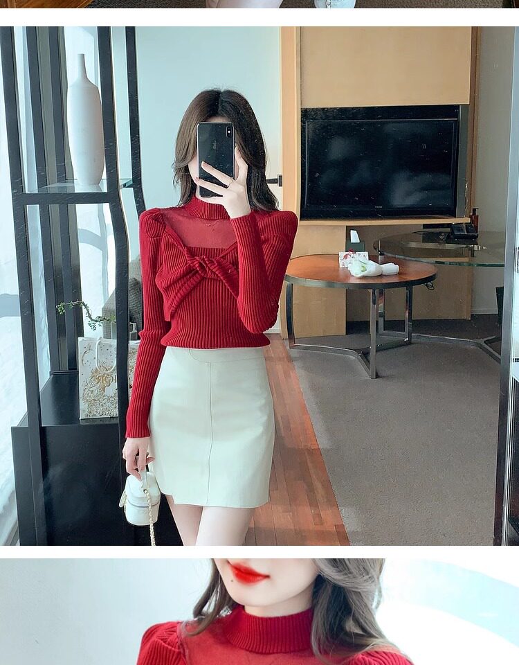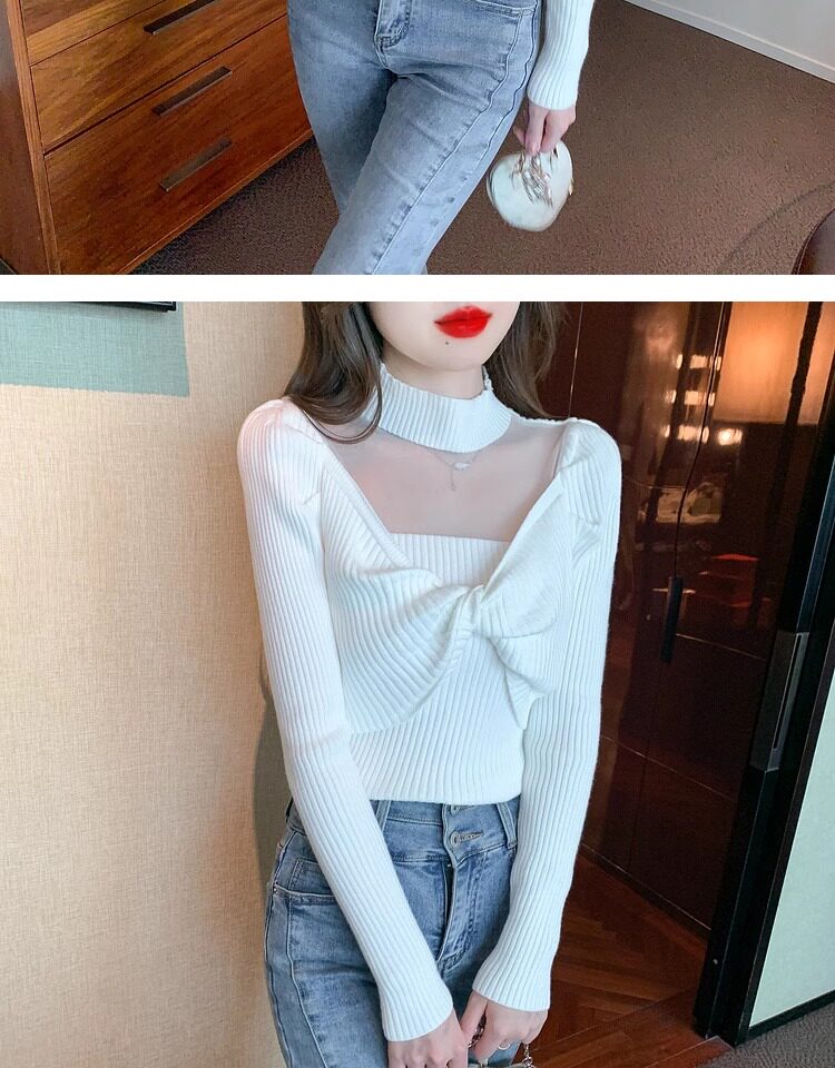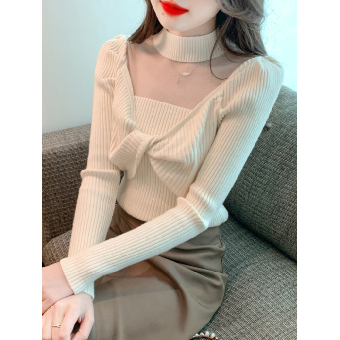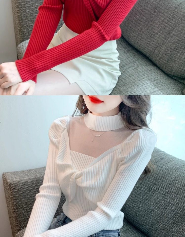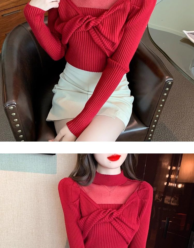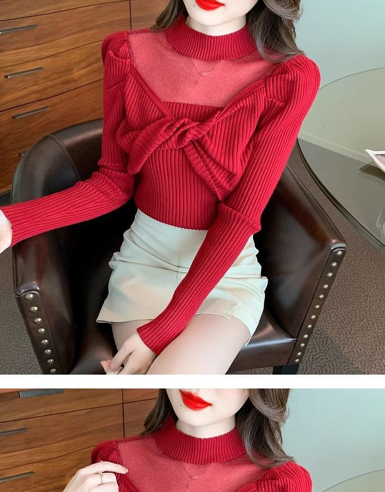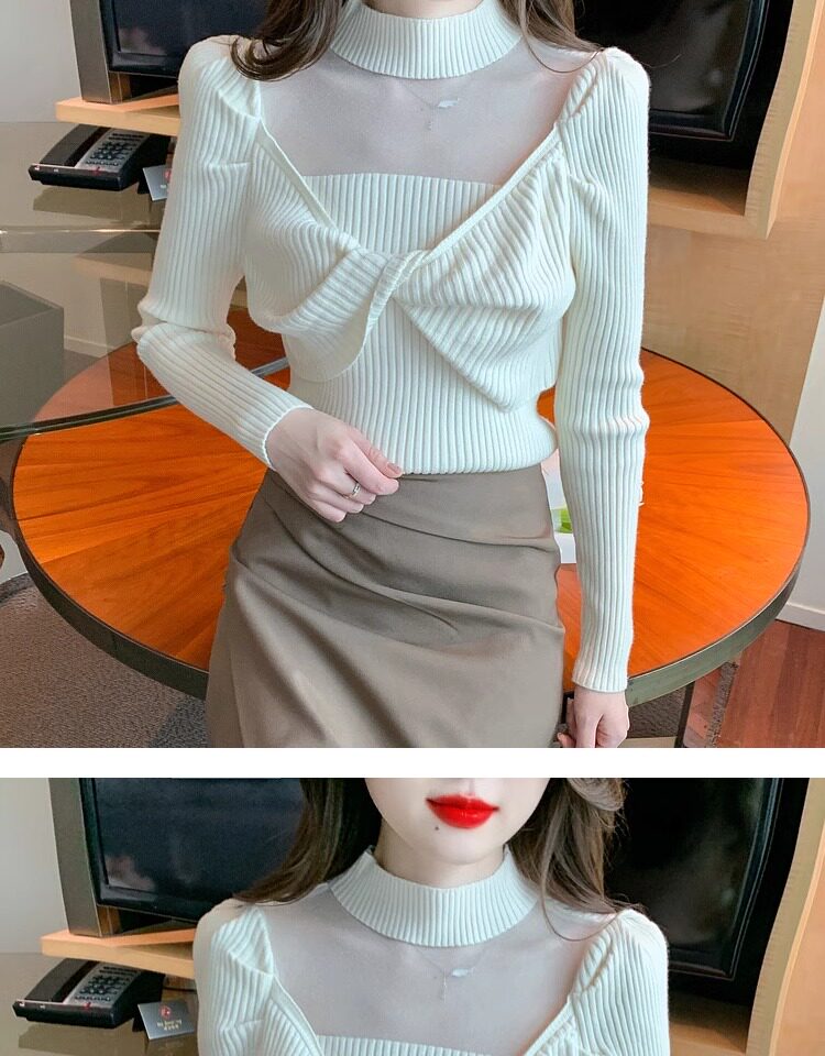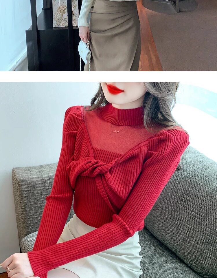 2024年新款秋冬半高領長袖網紗針織衫女氣質扭結毛衣打底衫上衣潮