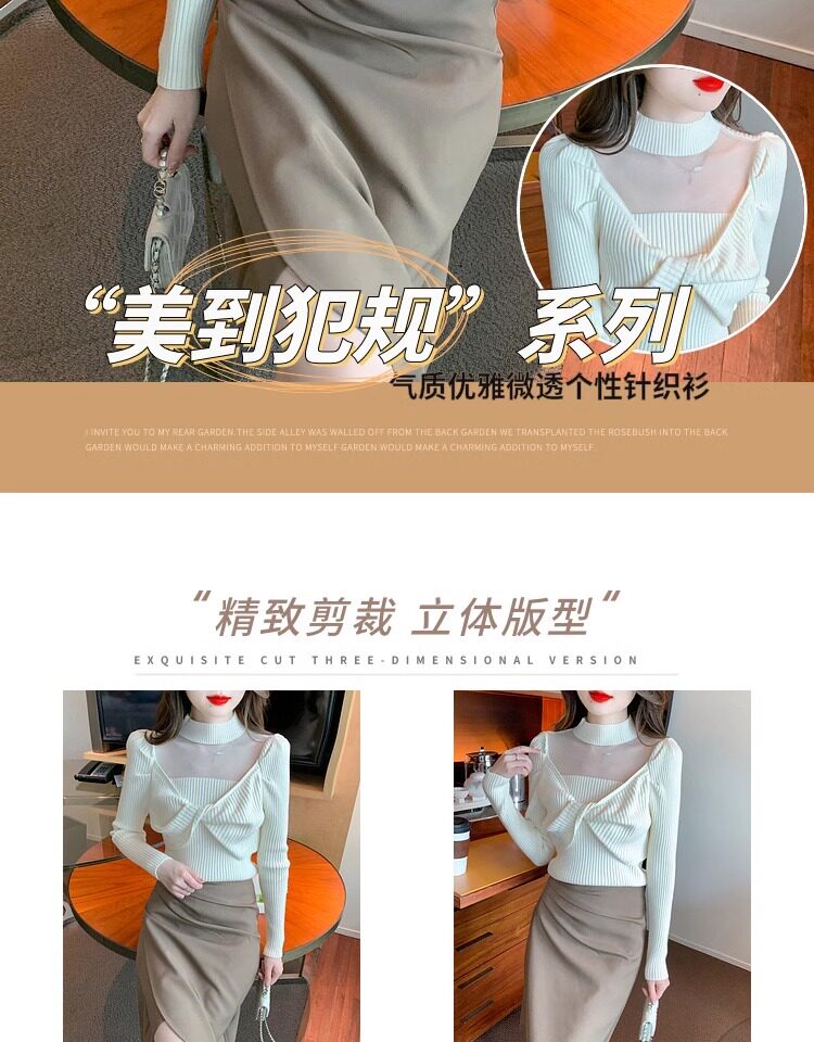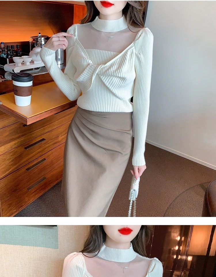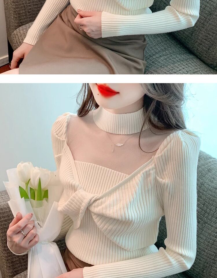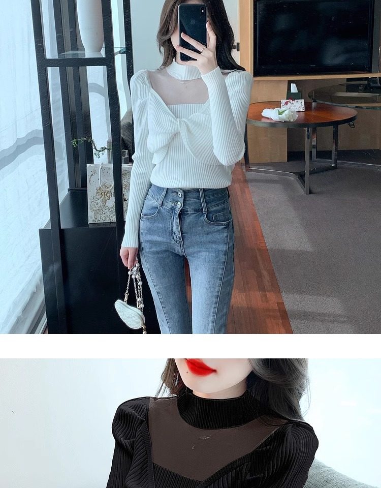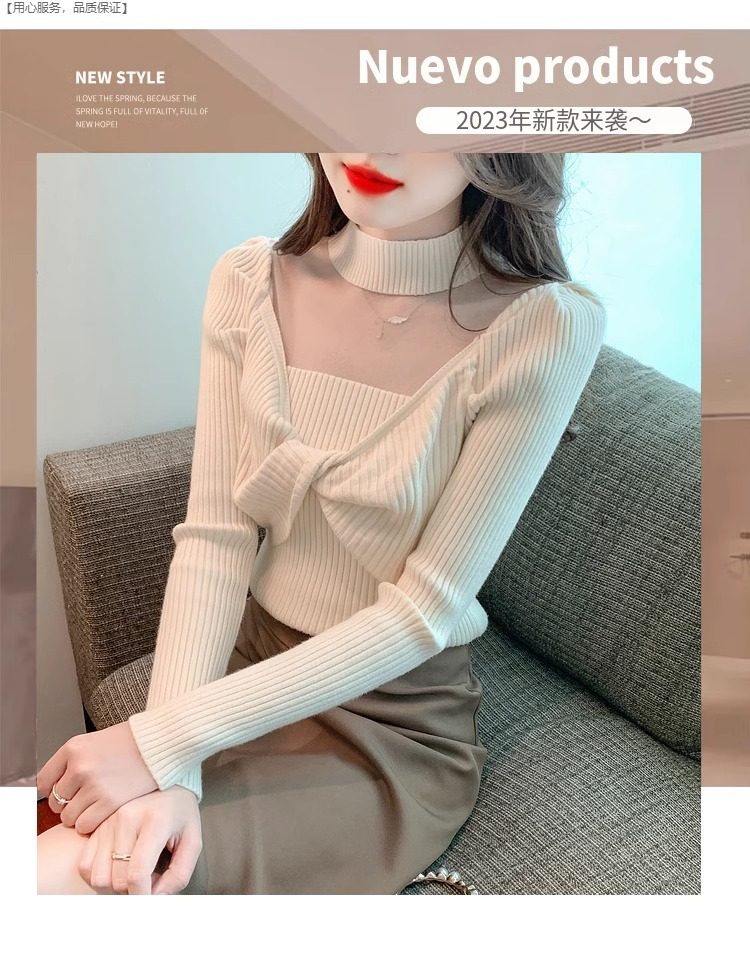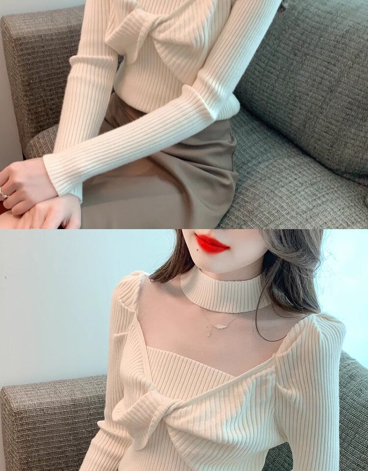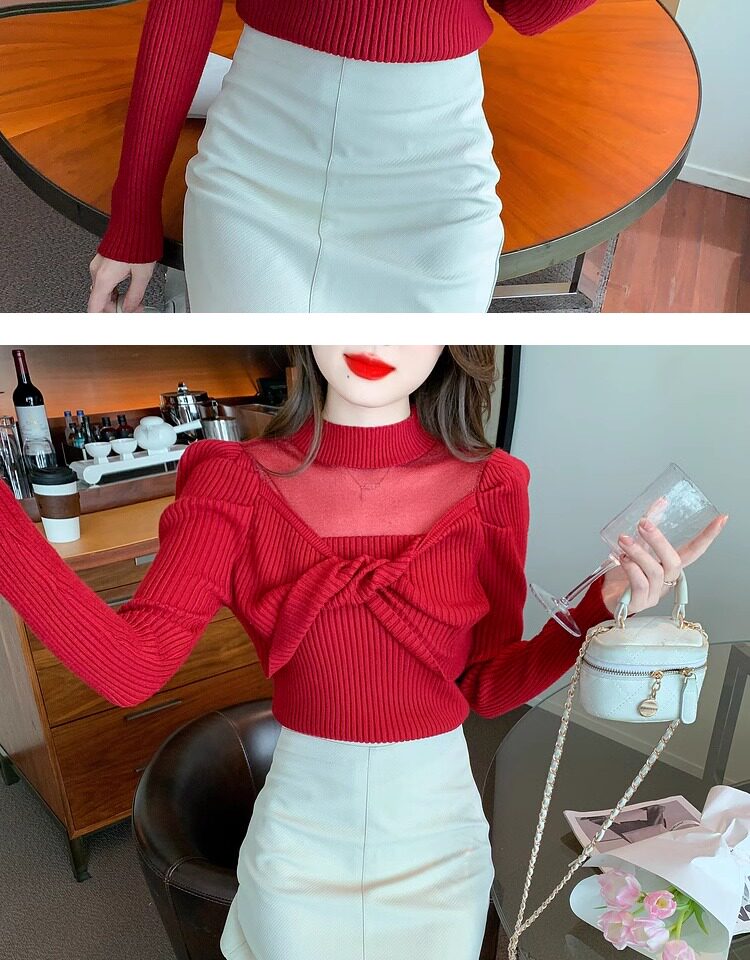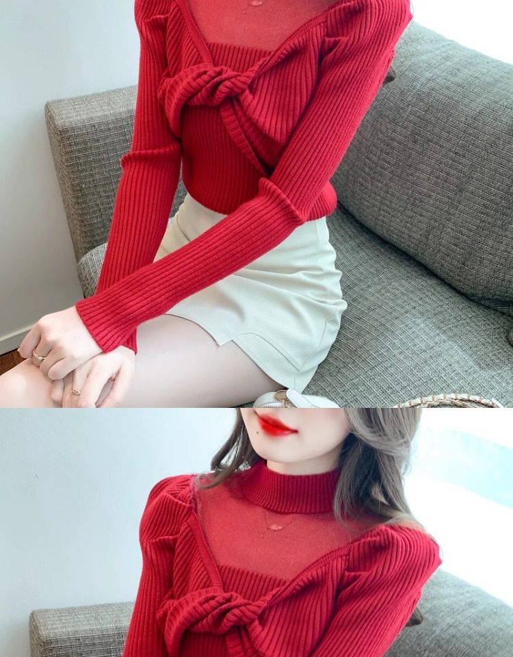 2024年新款秋冬半高領長袖網紗針織衫女氣質扭結毛衣打底衫上衣潮