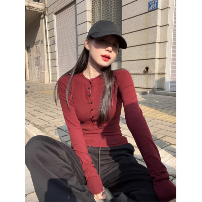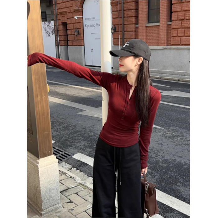 辣妹半開領紅色顯白緊身正肩T恤女內搭打底衫修身上衣V領顯瘦長袖