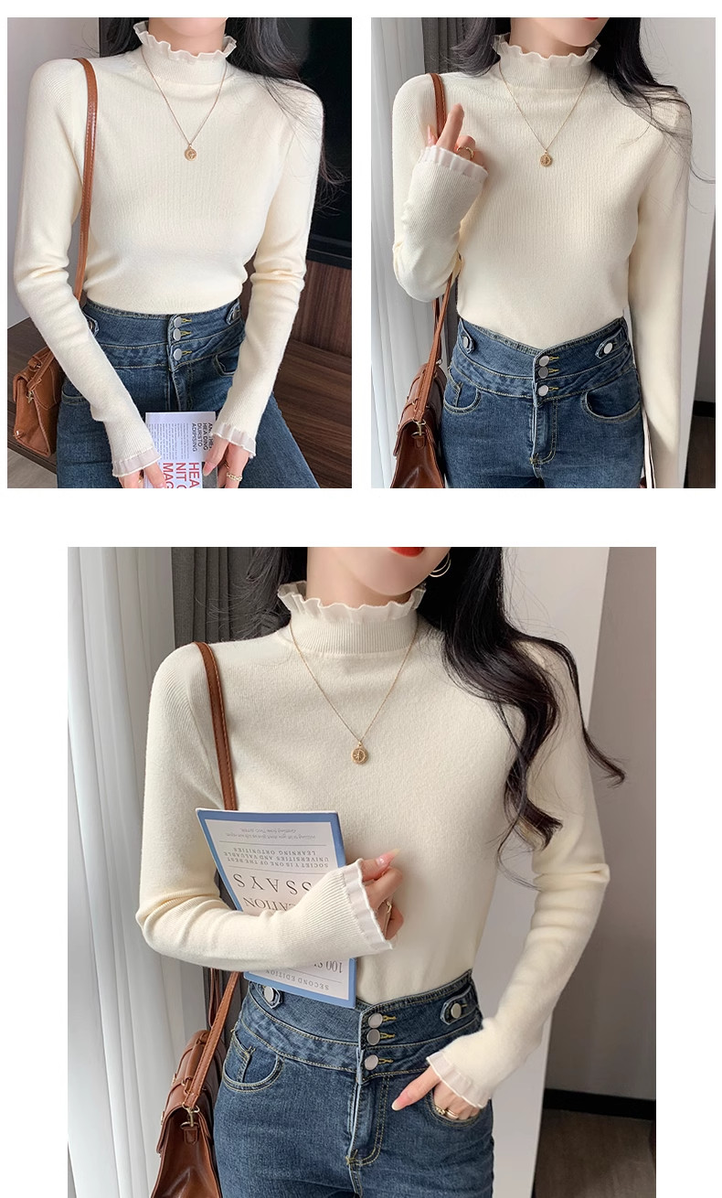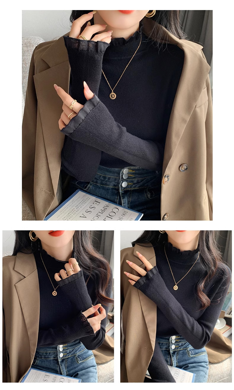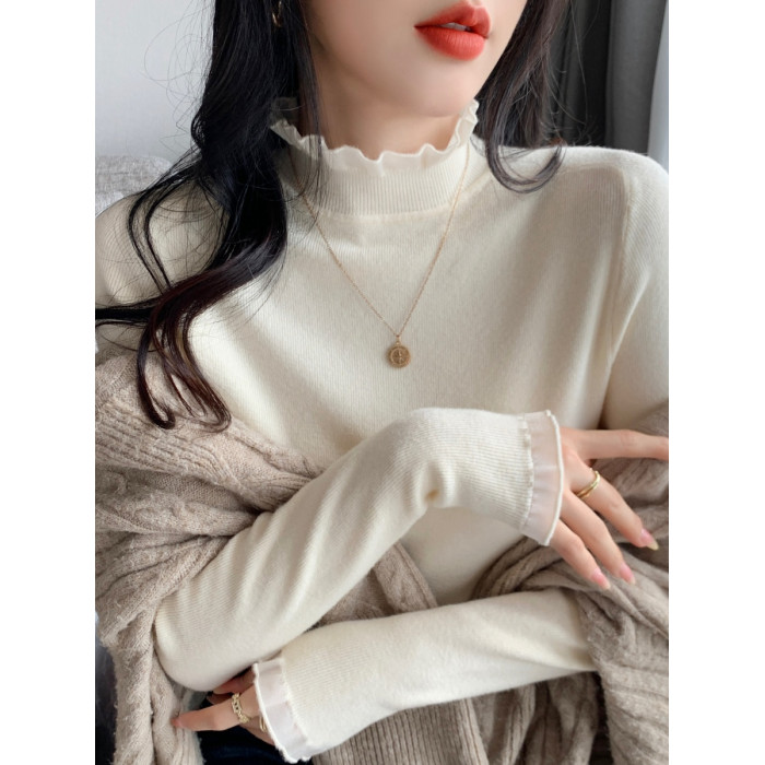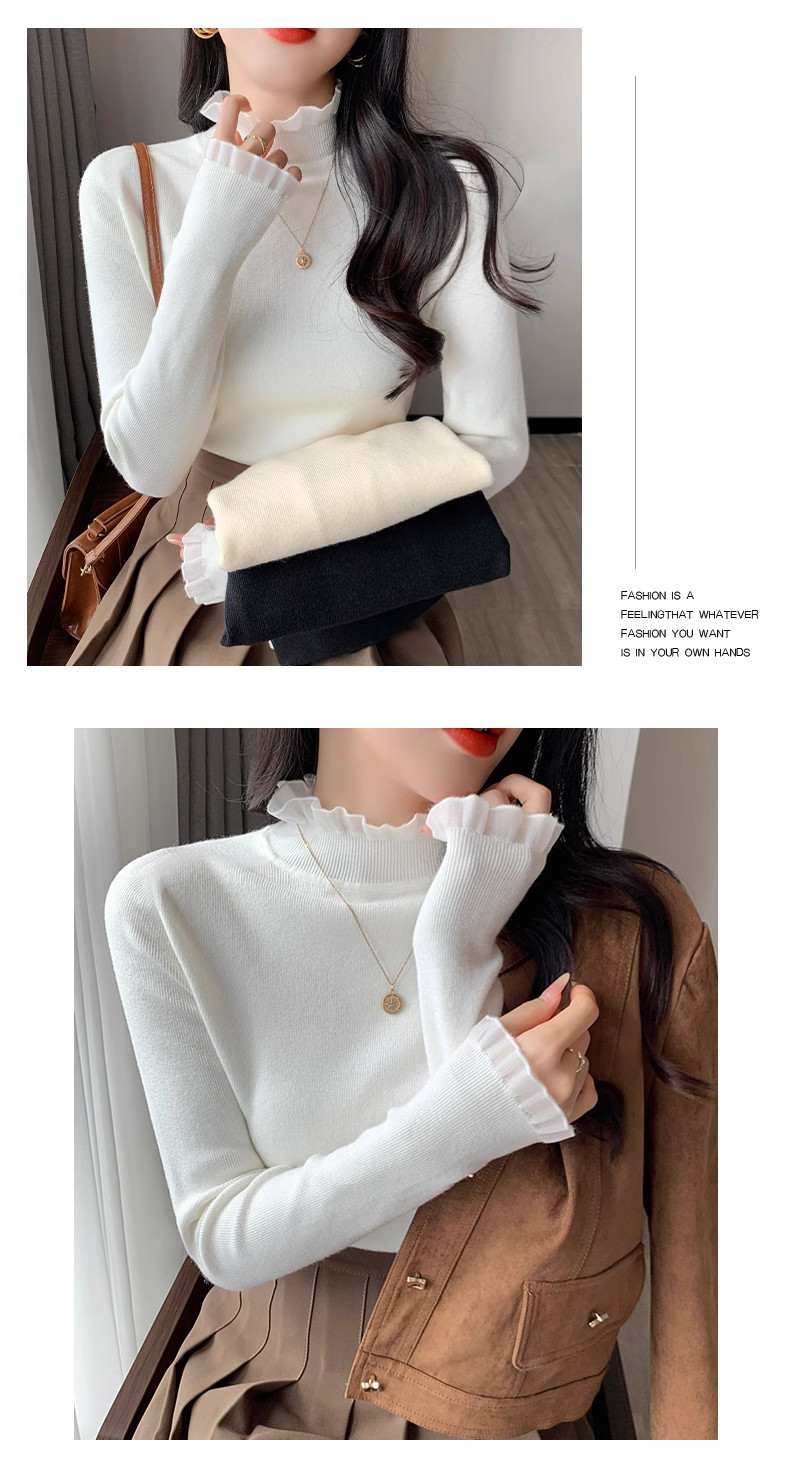 半高領內搭打底衫女春秋冬長袖設計感小衆針織上衣蕾絲邊白色毛衣