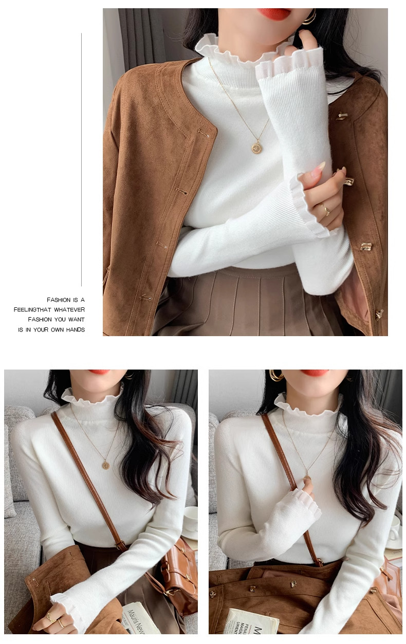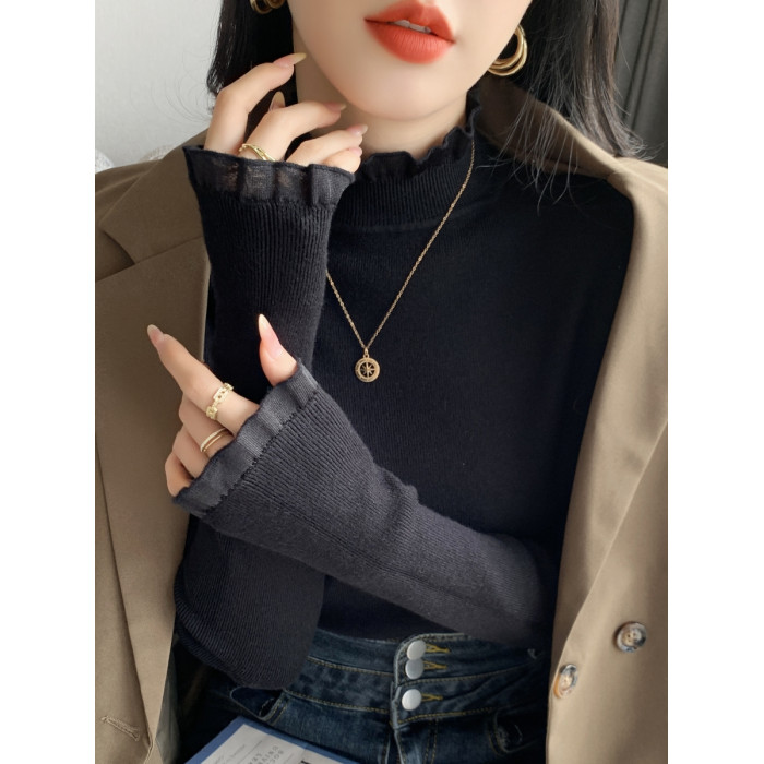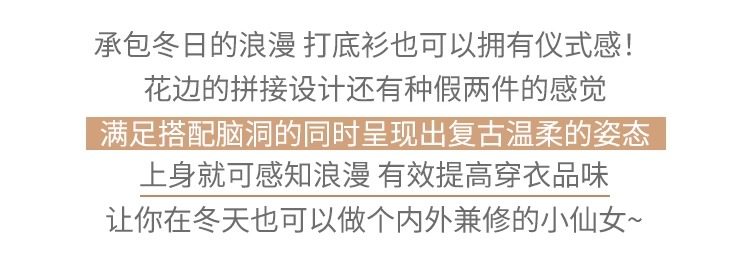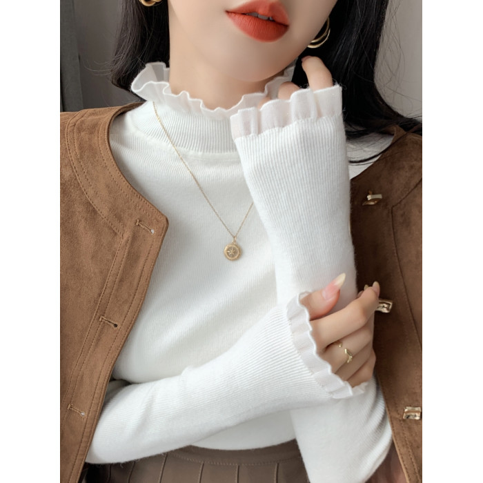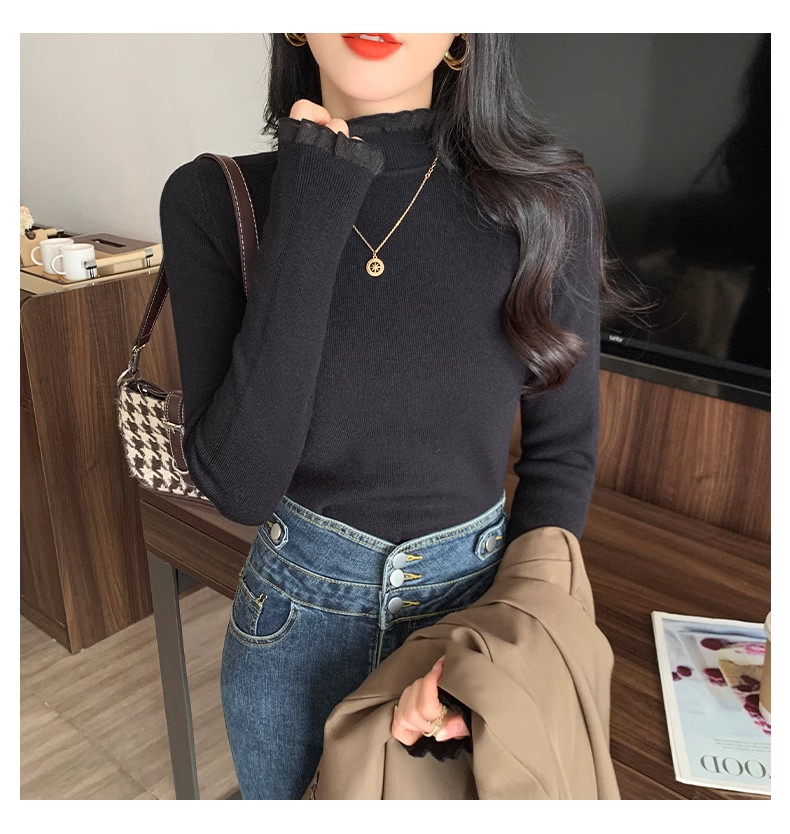 半高領內搭打底衫女春秋冬長袖設計感小衆針織上衣蕾絲邊白色毛衣