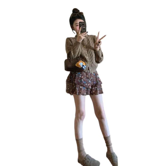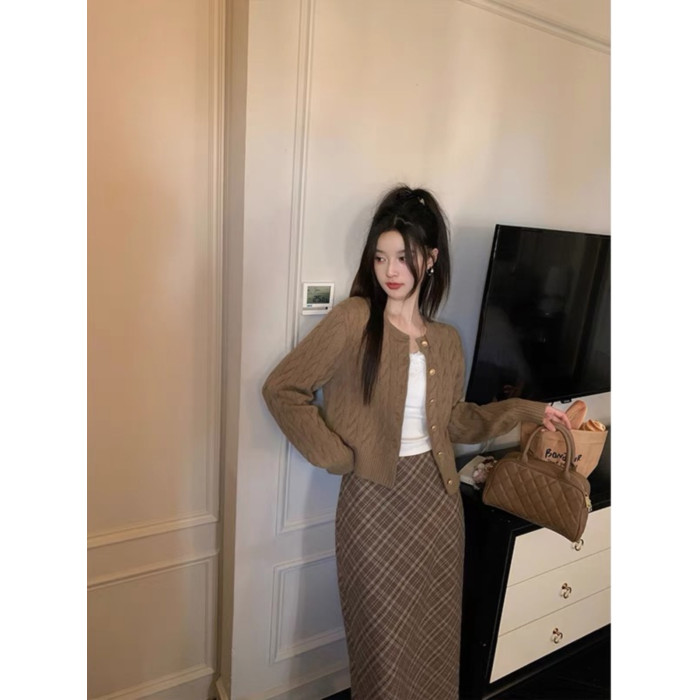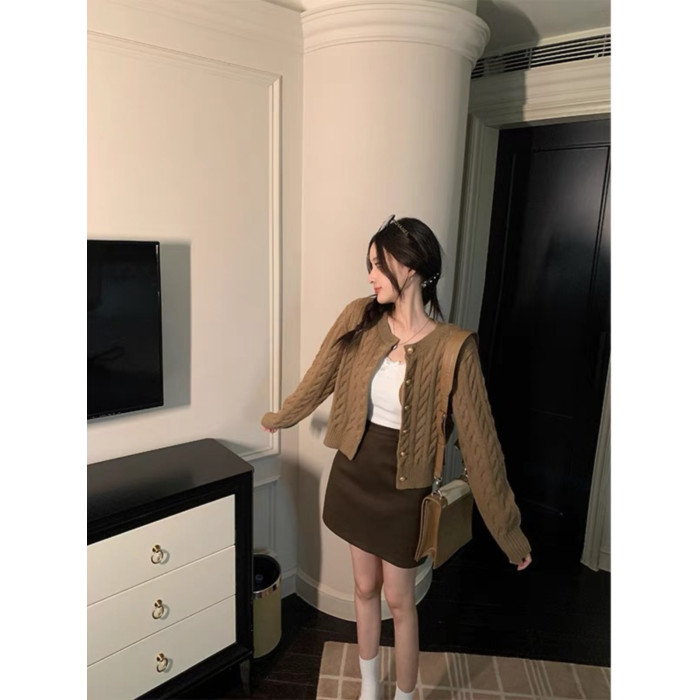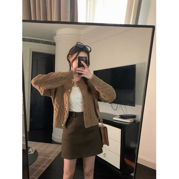 復古棕色粗條麻花紋理軟糯開衫毛衣女秋季新款修身厚實外搭上衣潮
