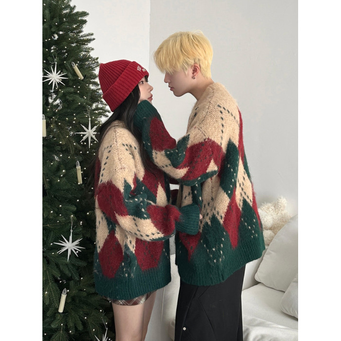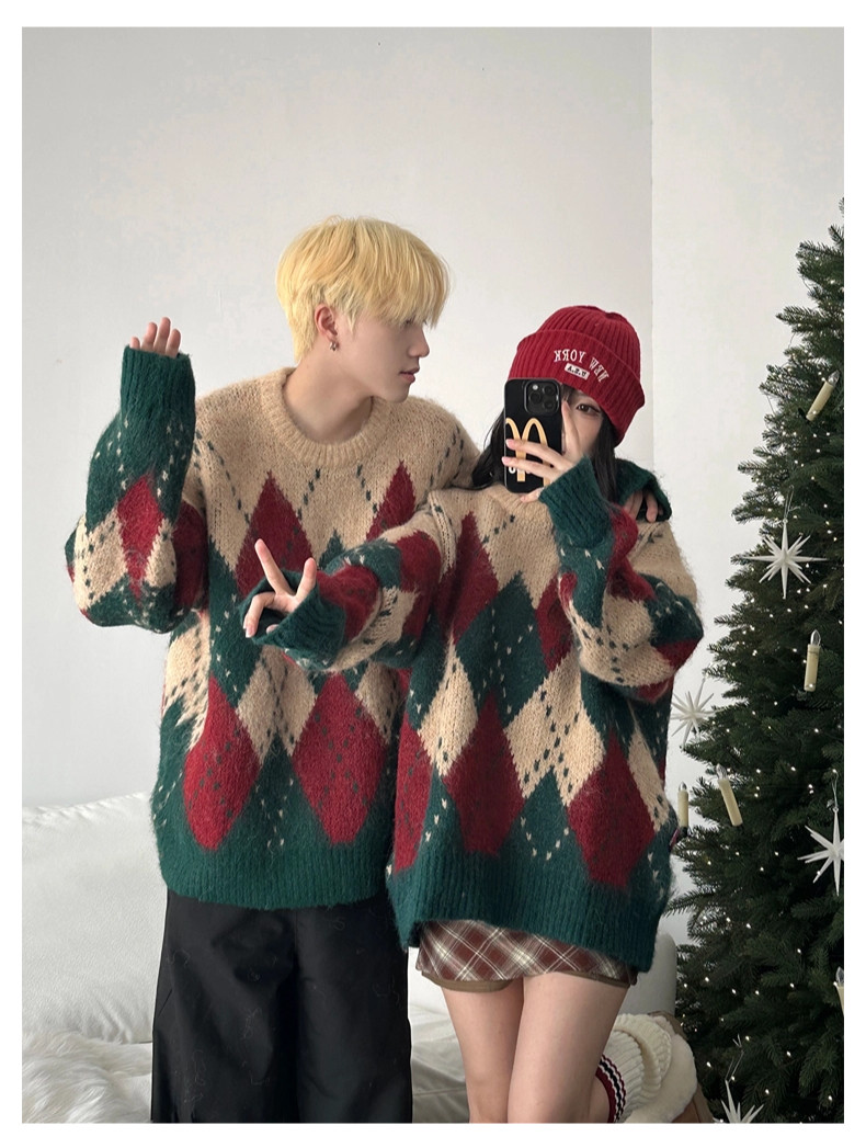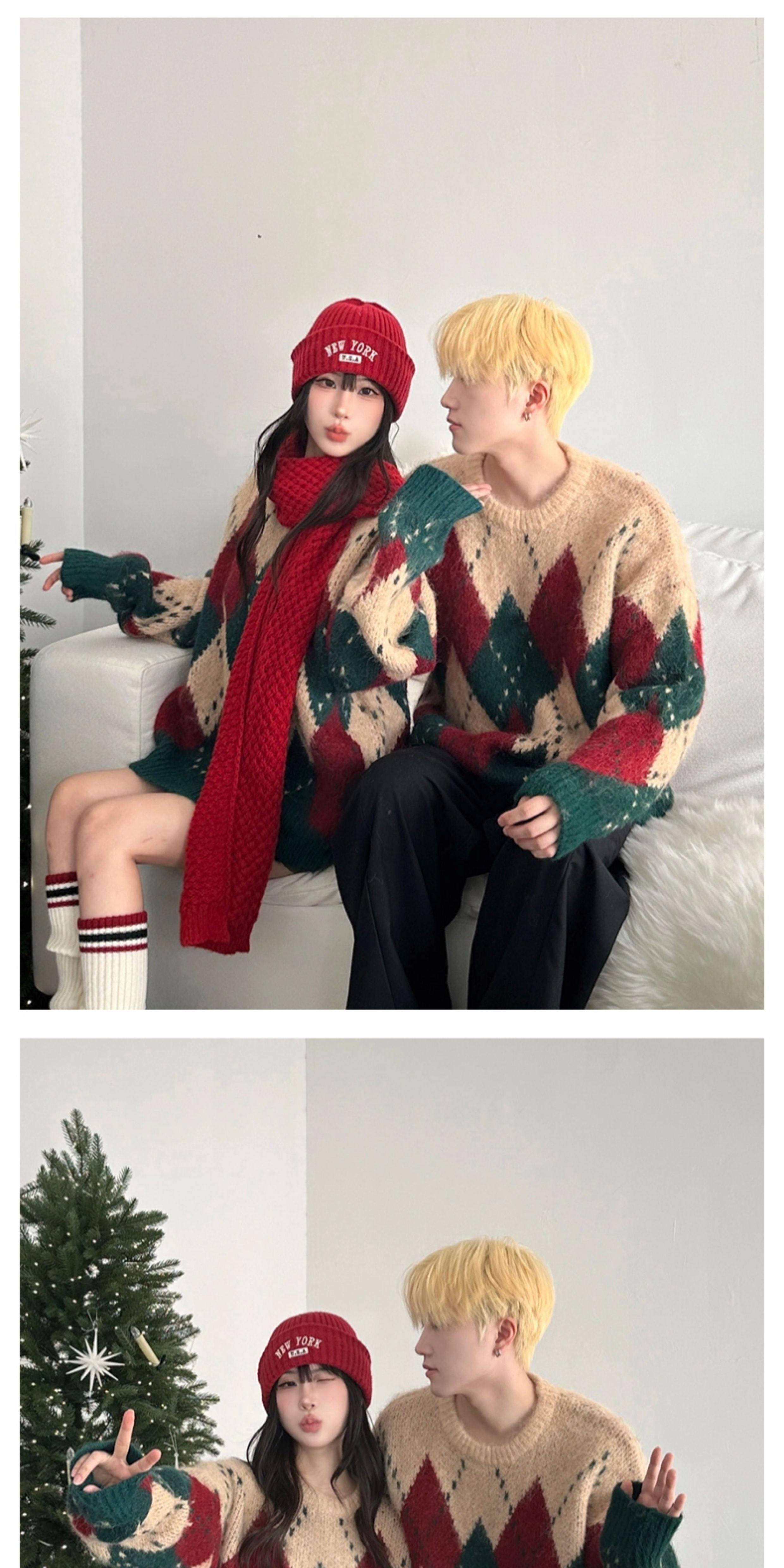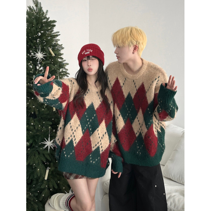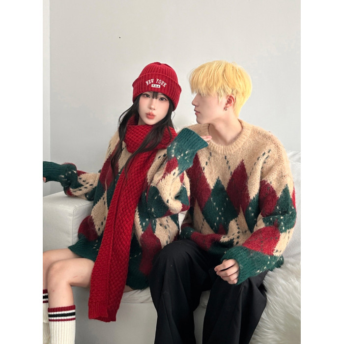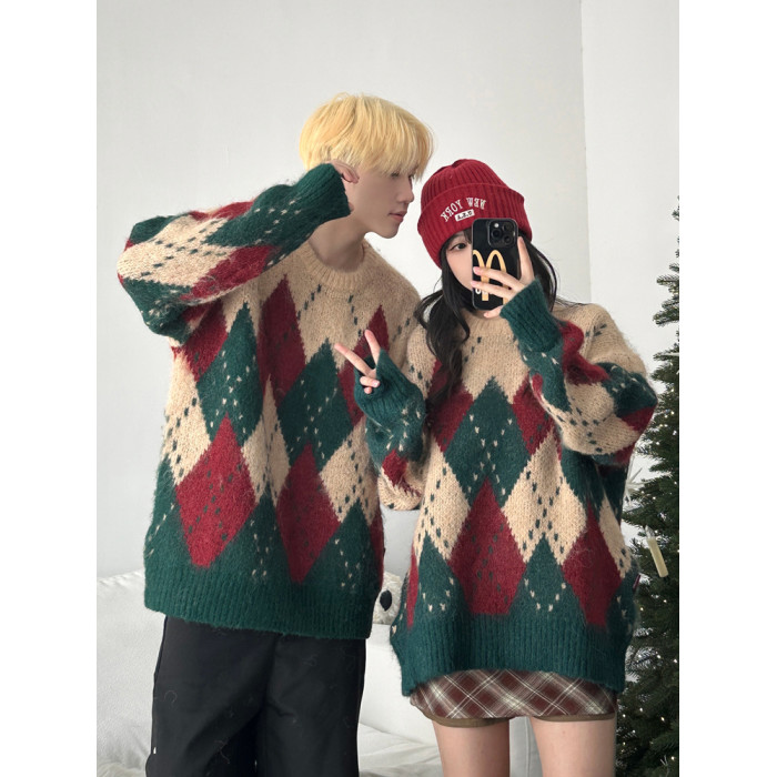 聖誕毛衣情侶裝秋冬ins潮牌寬松菱格圓領套頭高級感慵懶風針織衫
