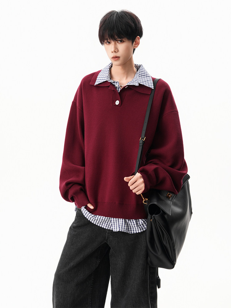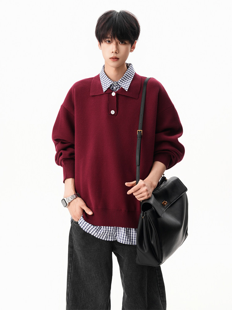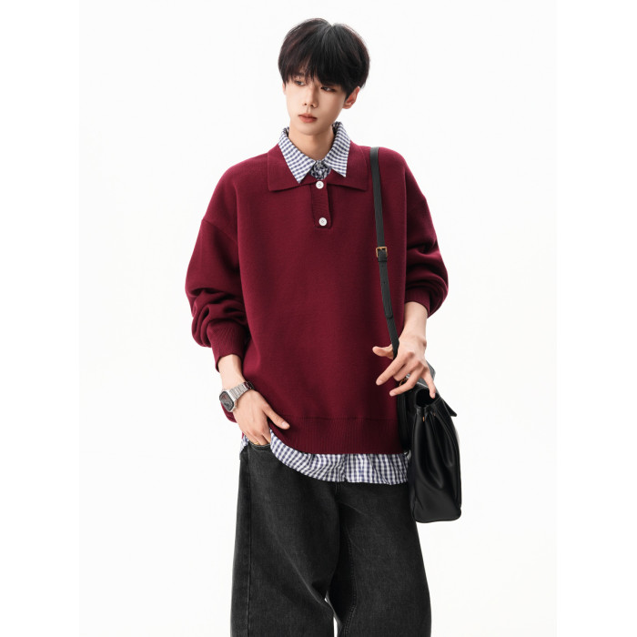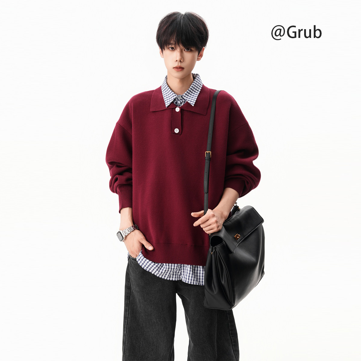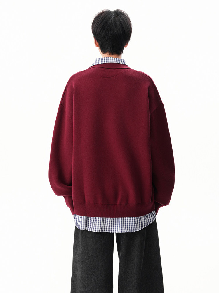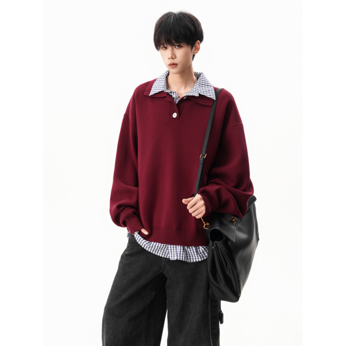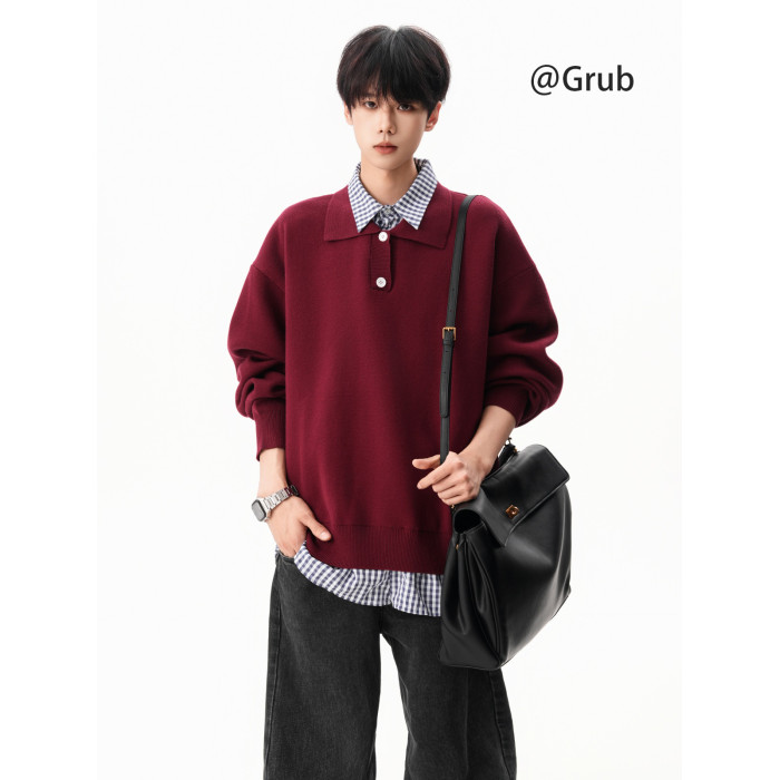 酒紅色假兩件針織衫男女冬季美式潮牌亨利領毛衣復古寬松休閒線衣
