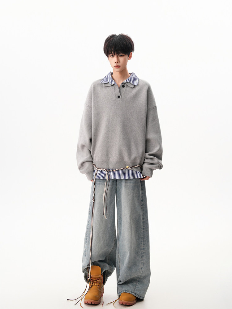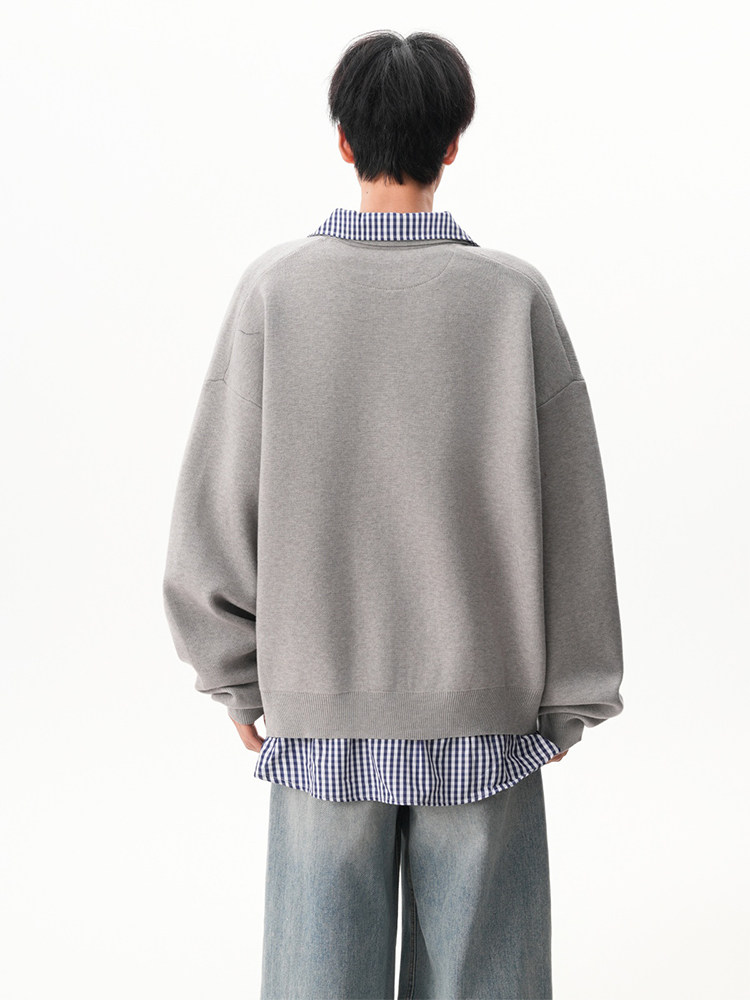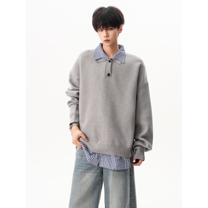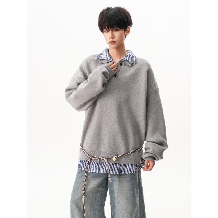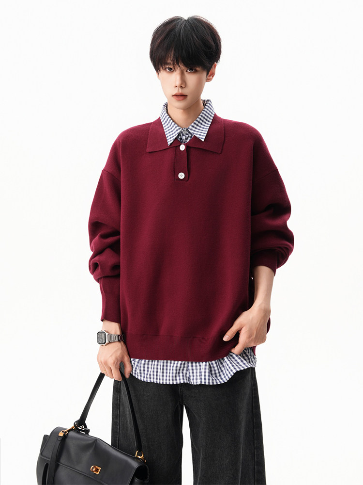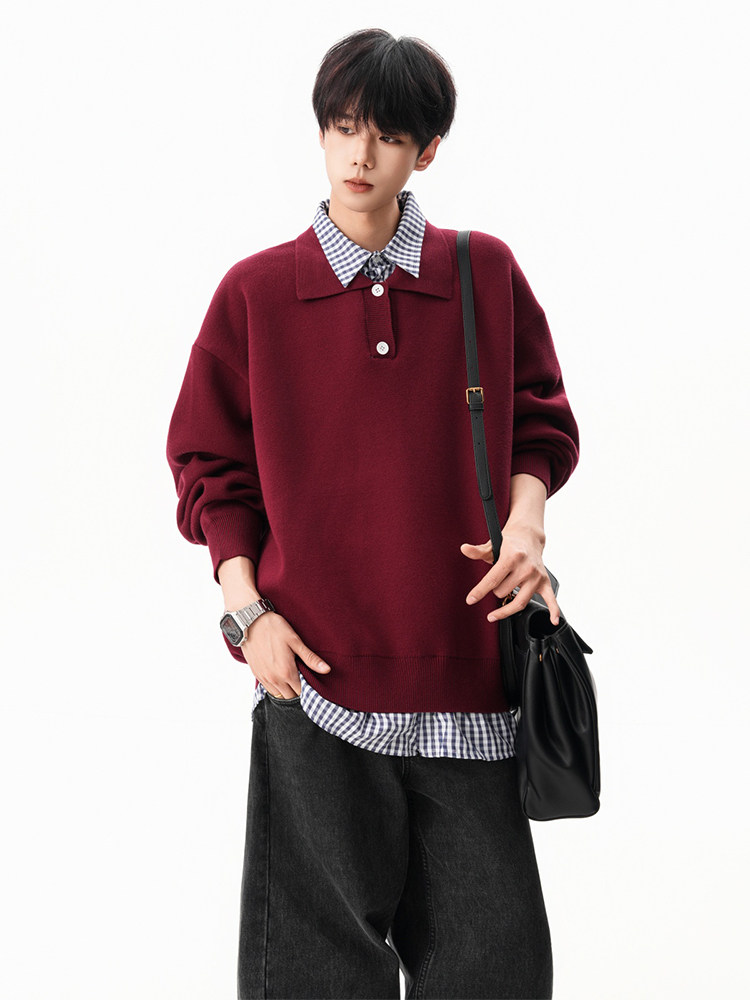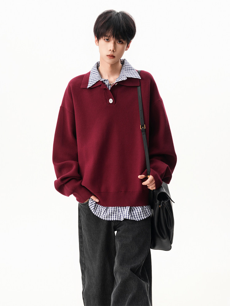 酒紅色假兩件針織衫男女冬季美式潮牌亨利領毛衣復古寬松休閒線衣