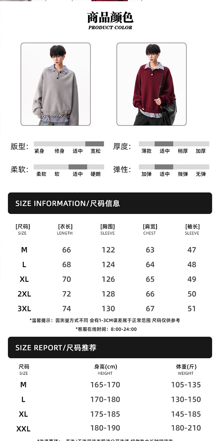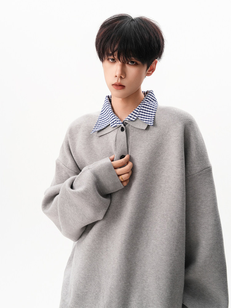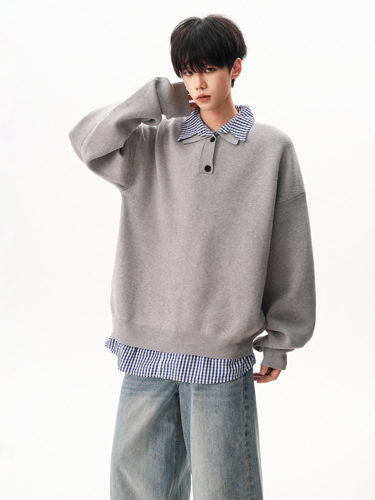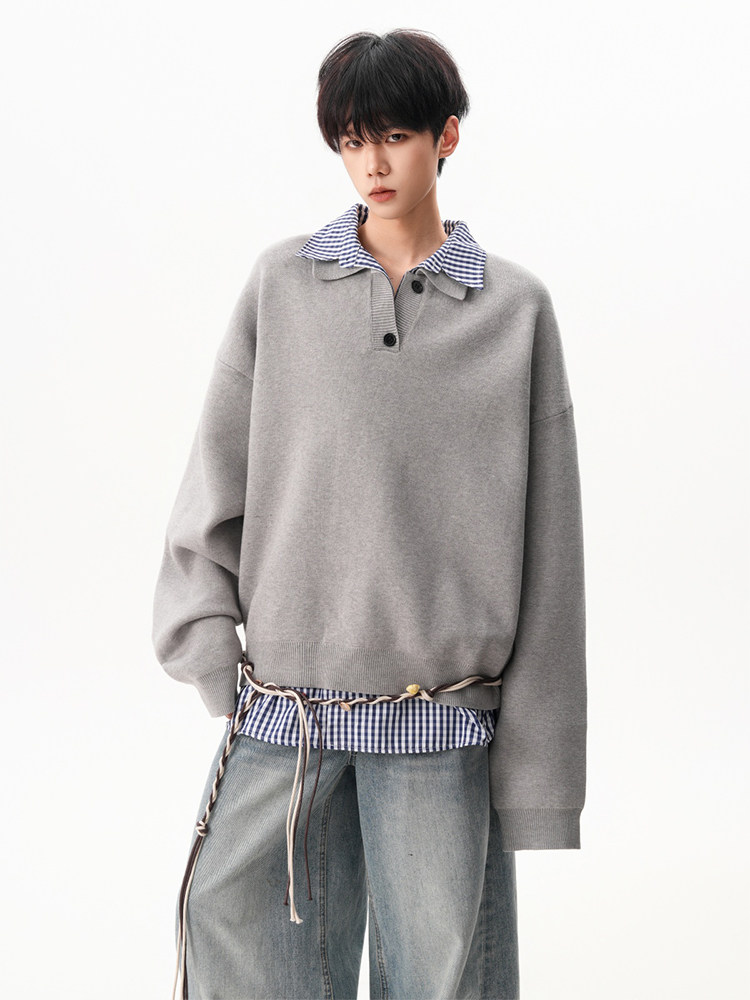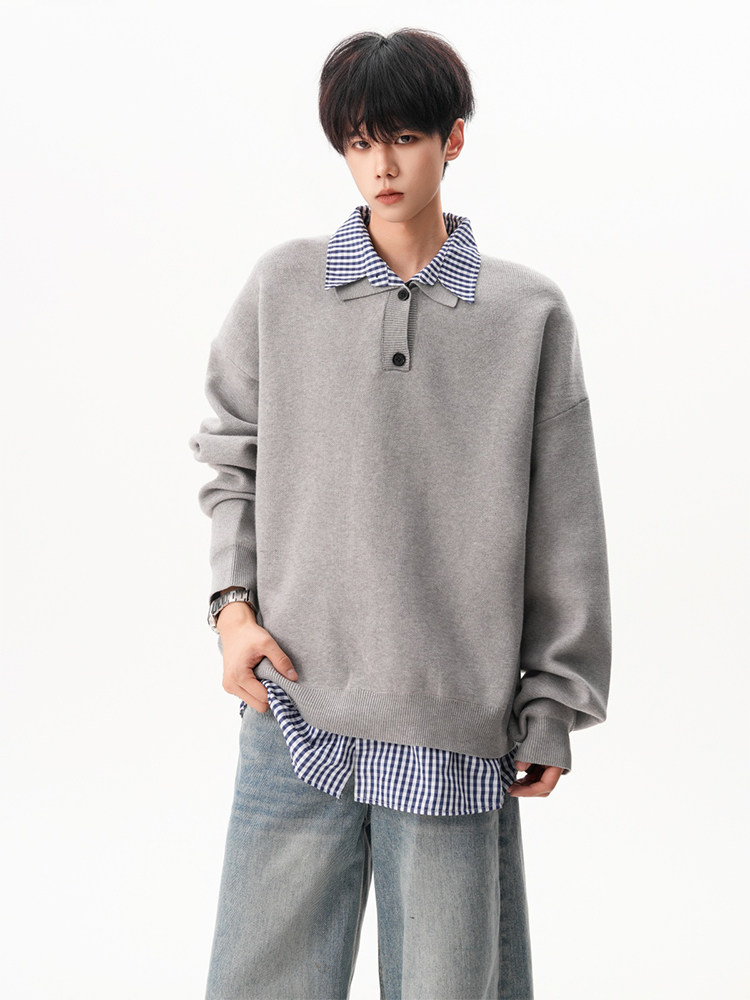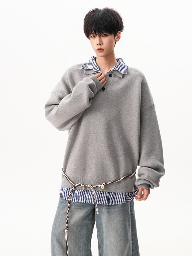 酒紅色假兩件針織衫男女冬季美式潮牌亨利領毛衣復古寬松休閒線衣