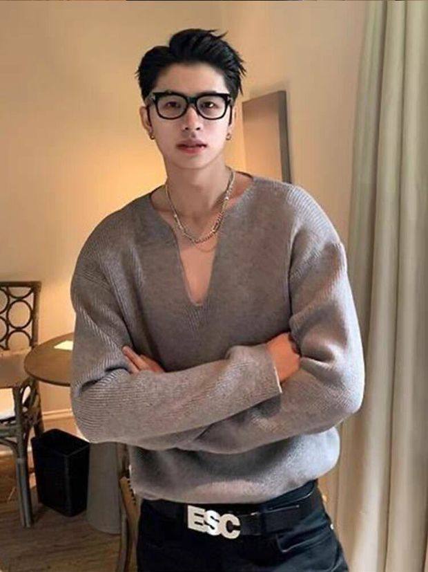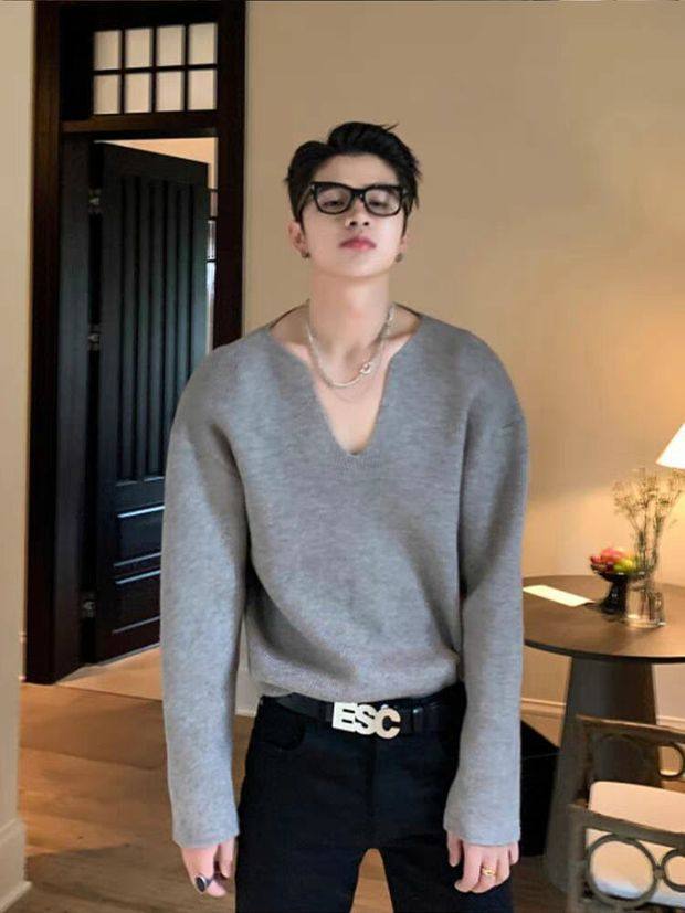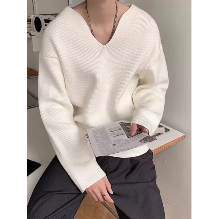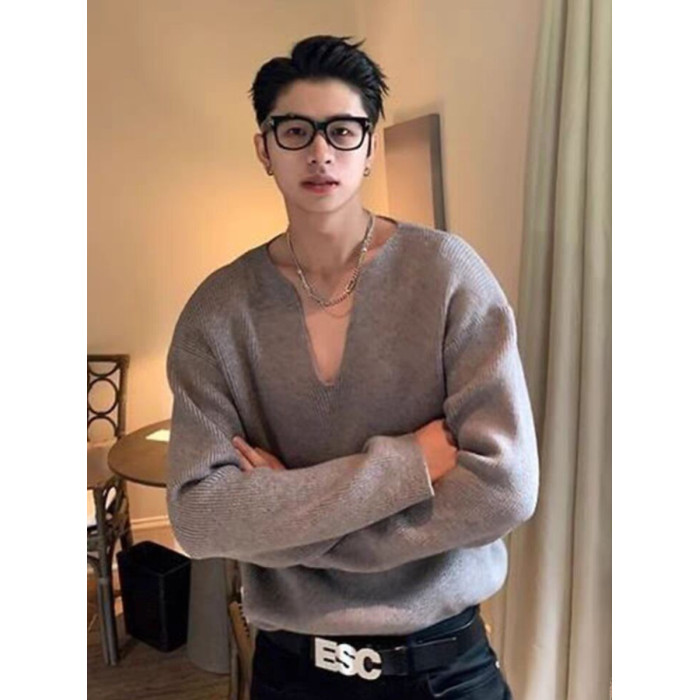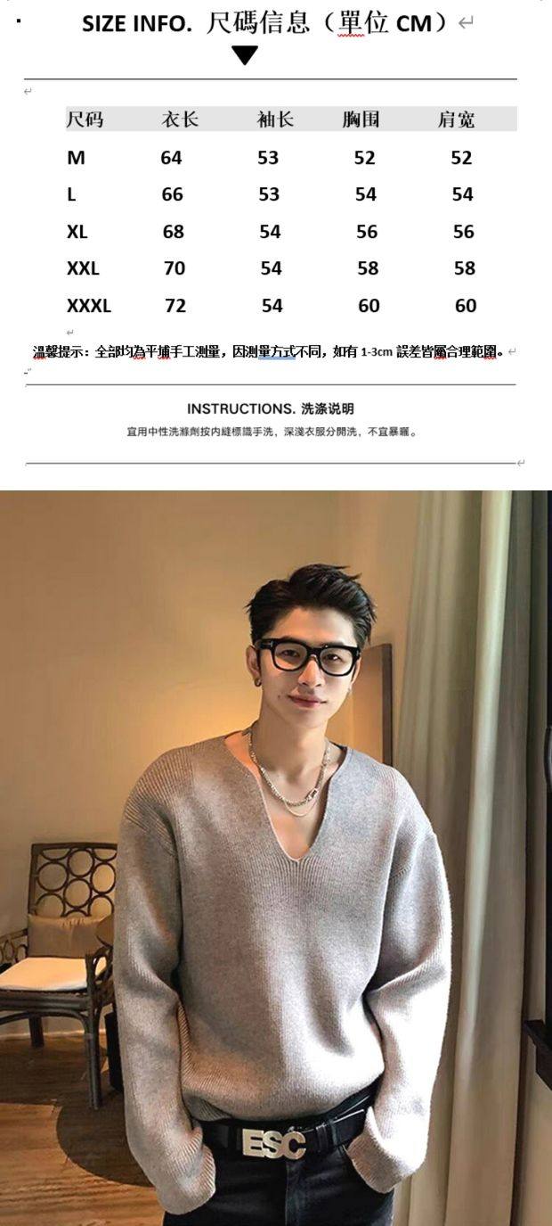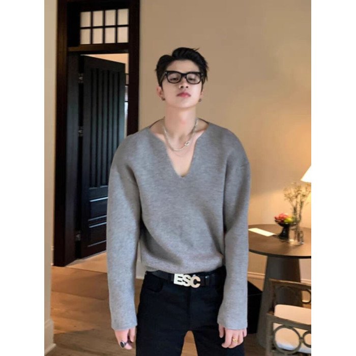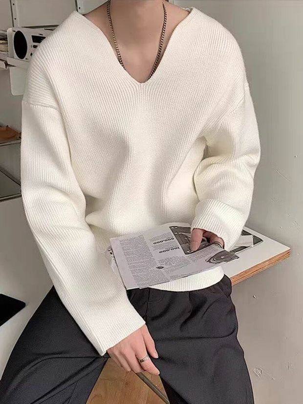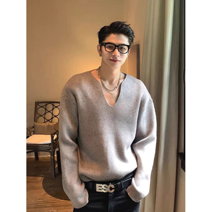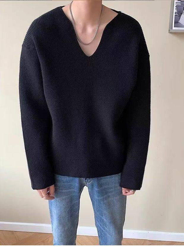 法式大v領針織衫高級感寬鬆長袖衛衣男模穿搭藝術生缺口領毛線衣