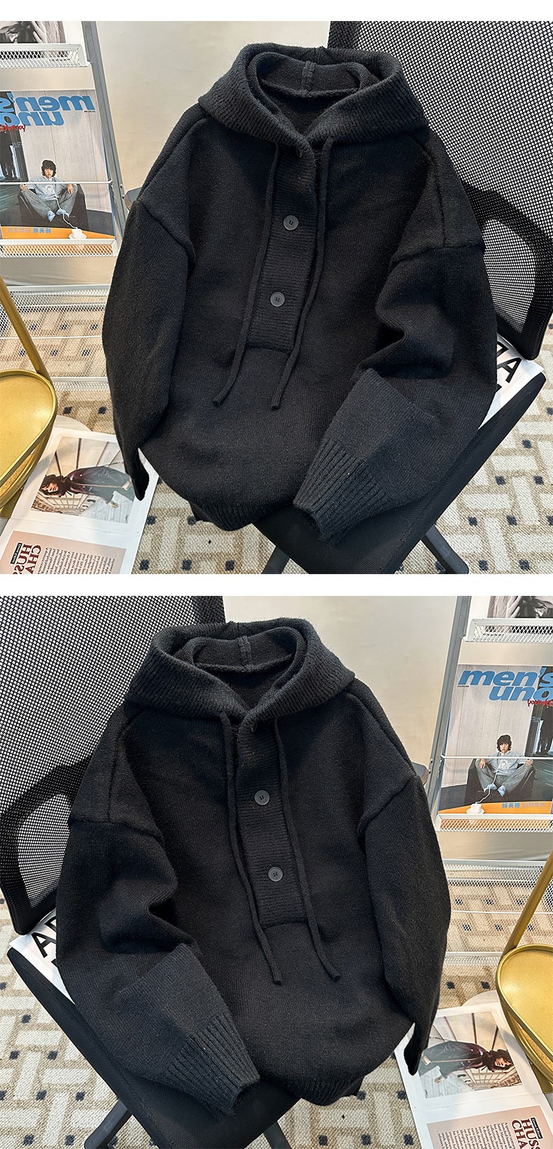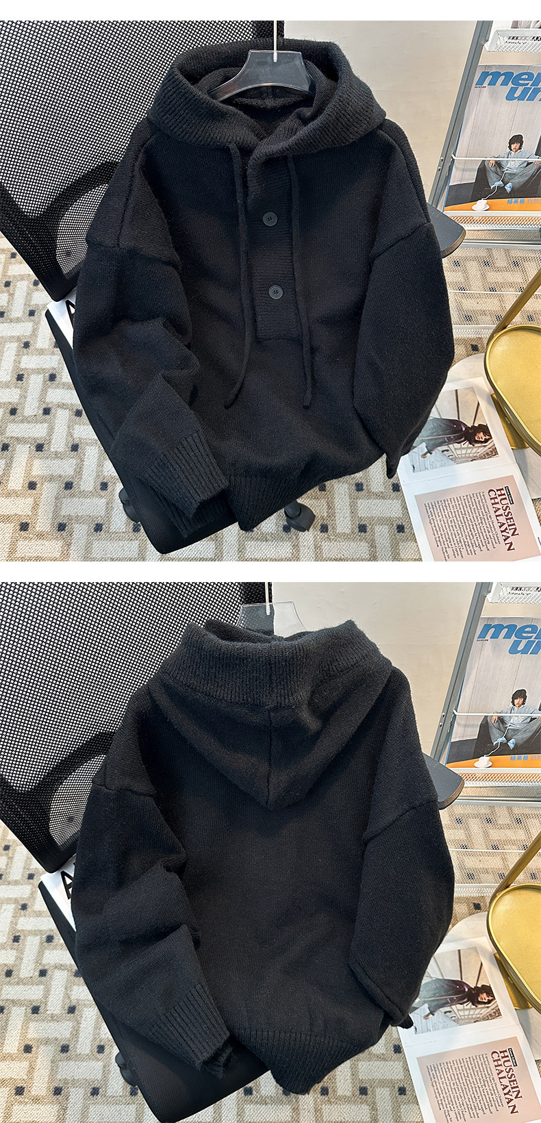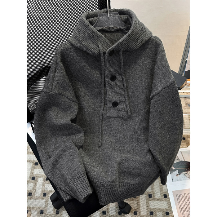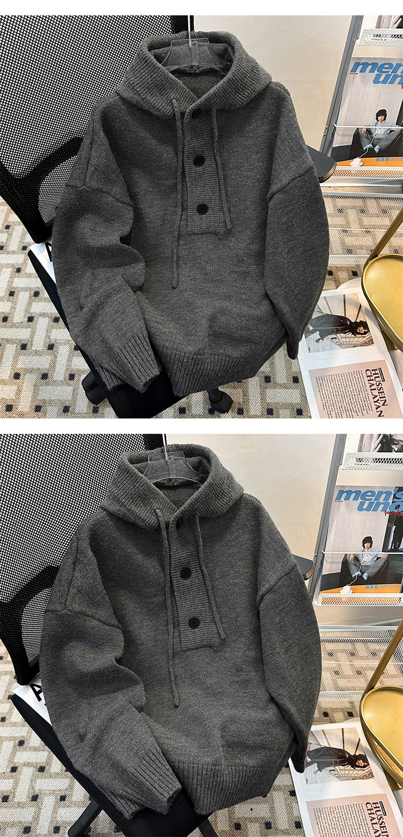 高街純色連帽針織衫男款冬季美式cleanfit保暖高級感紐釦帽衫毛衣
