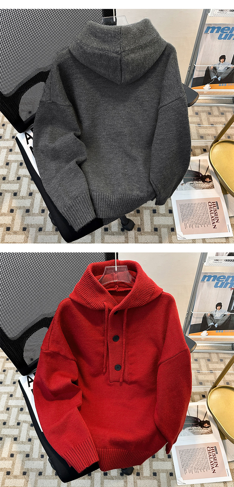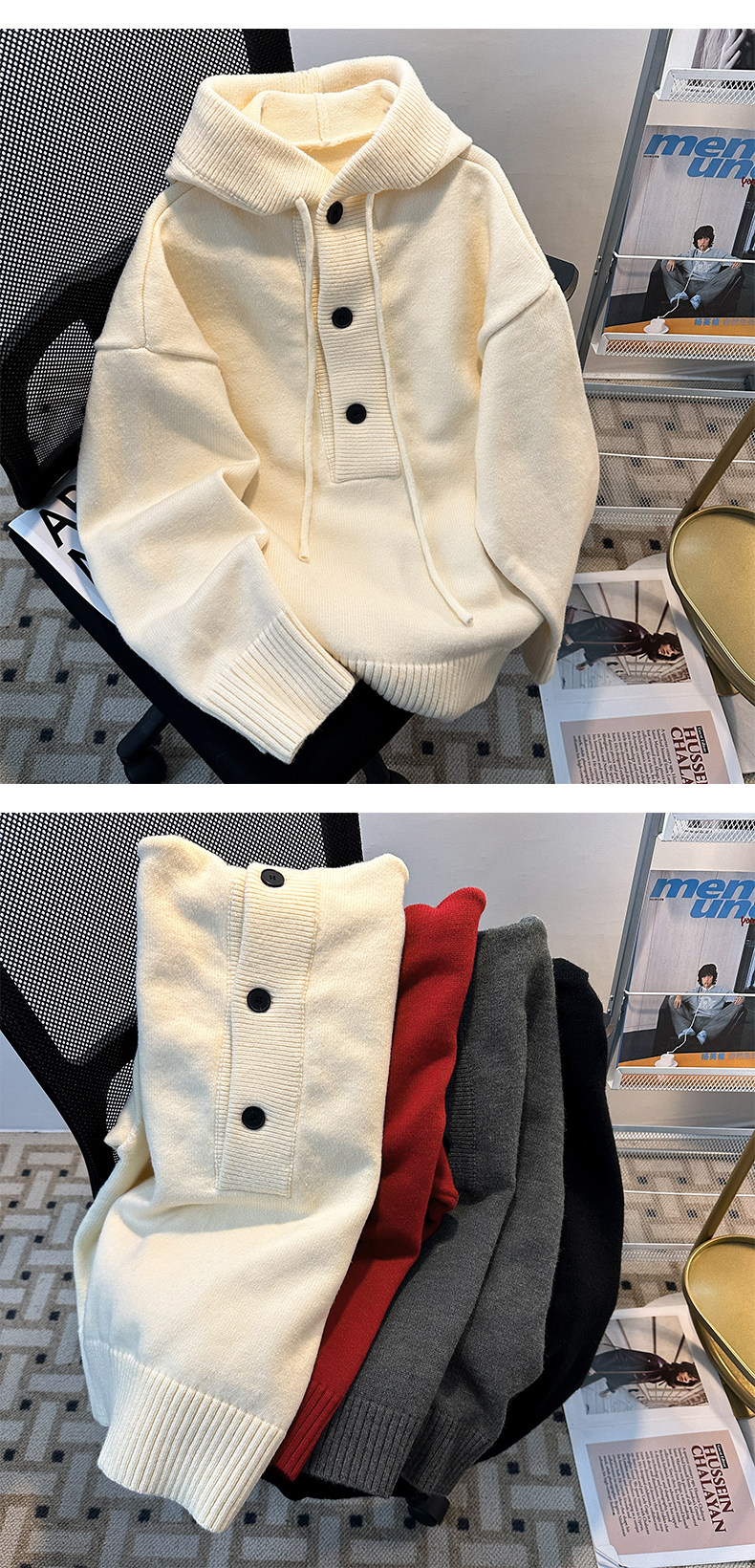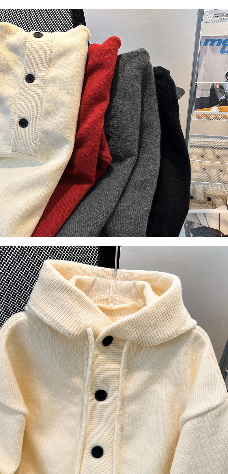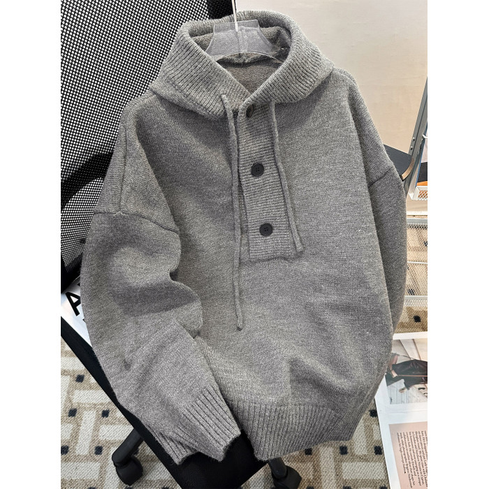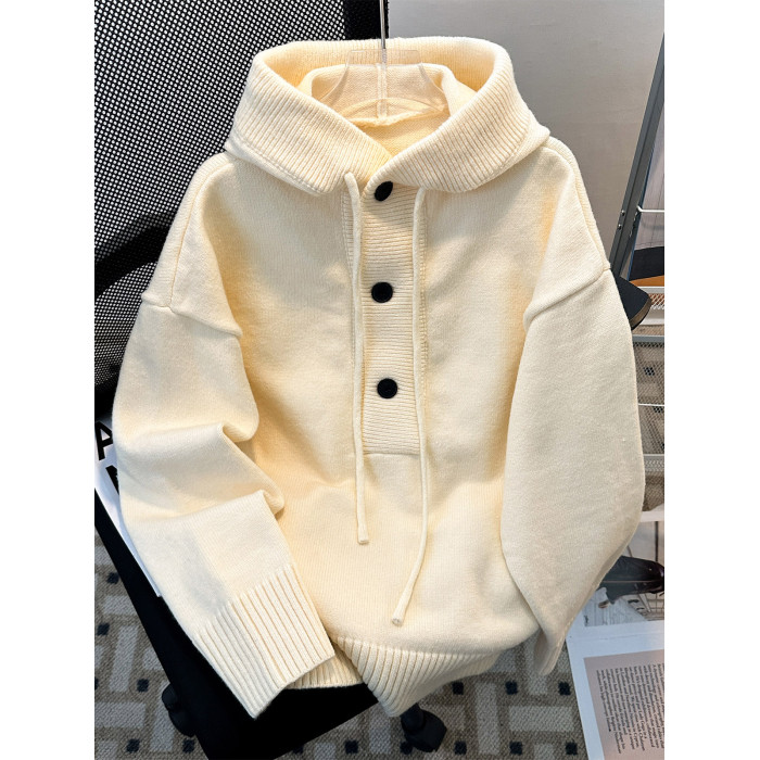高街純色連帽針織衫男款冬季美式cleanfit保暖高級感紐釦帽衫毛衣