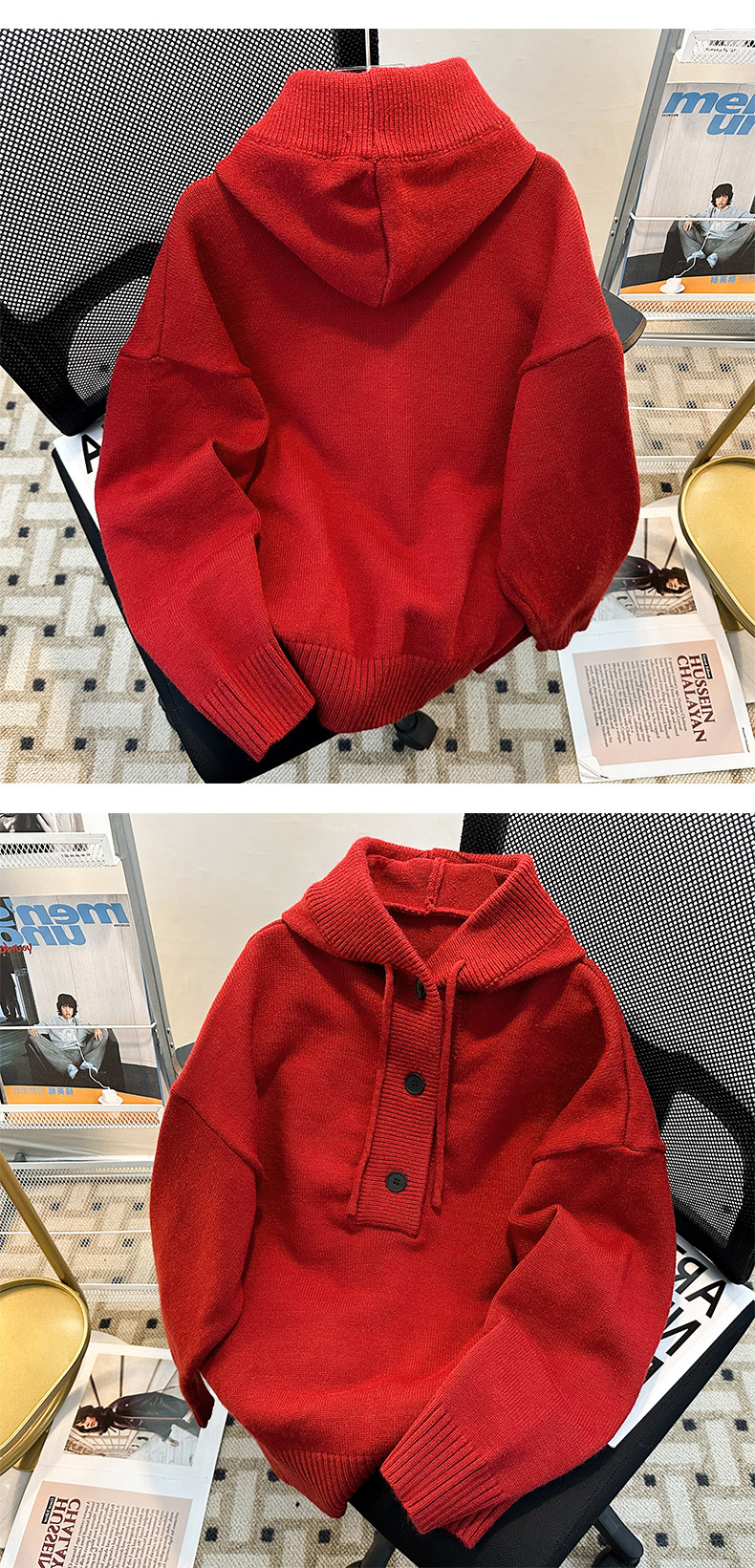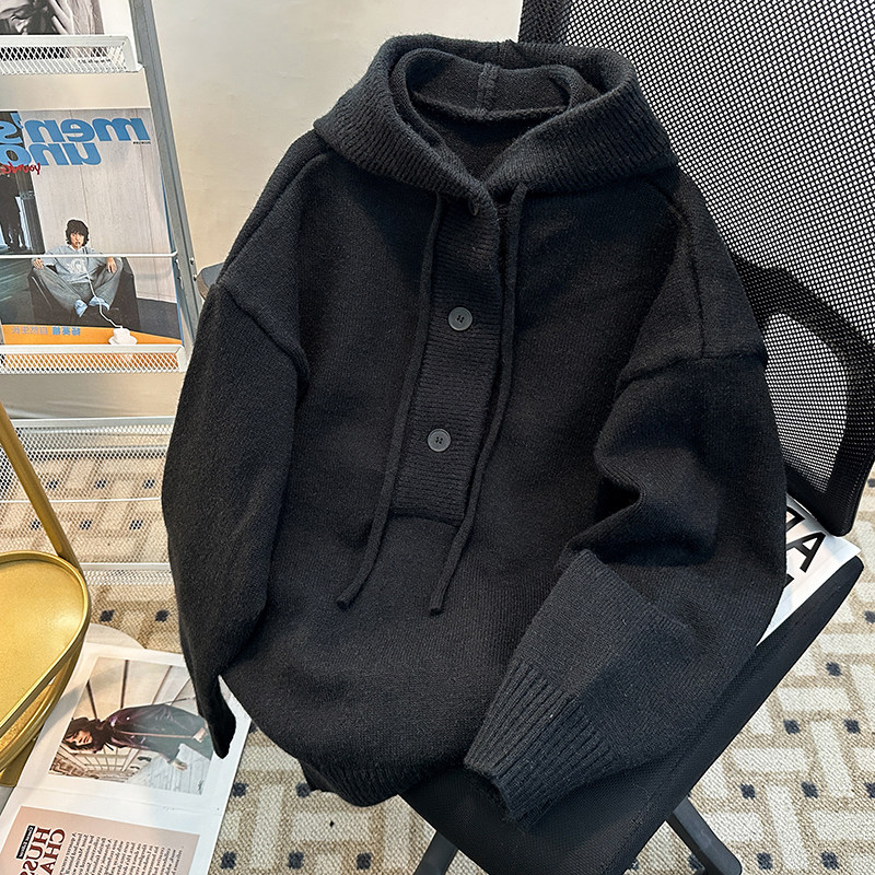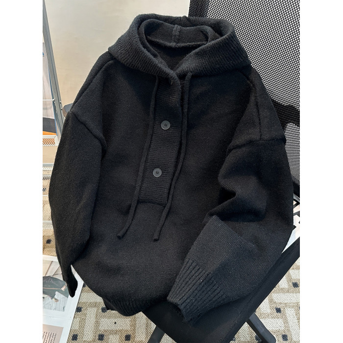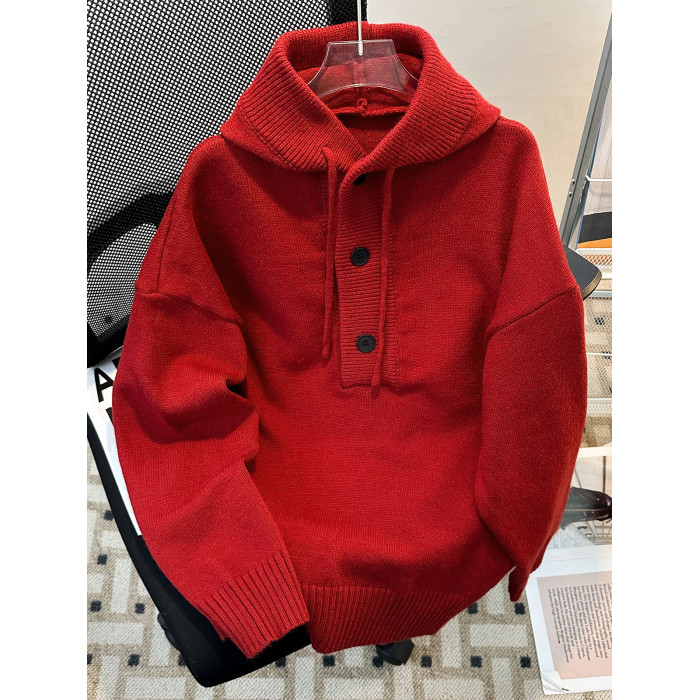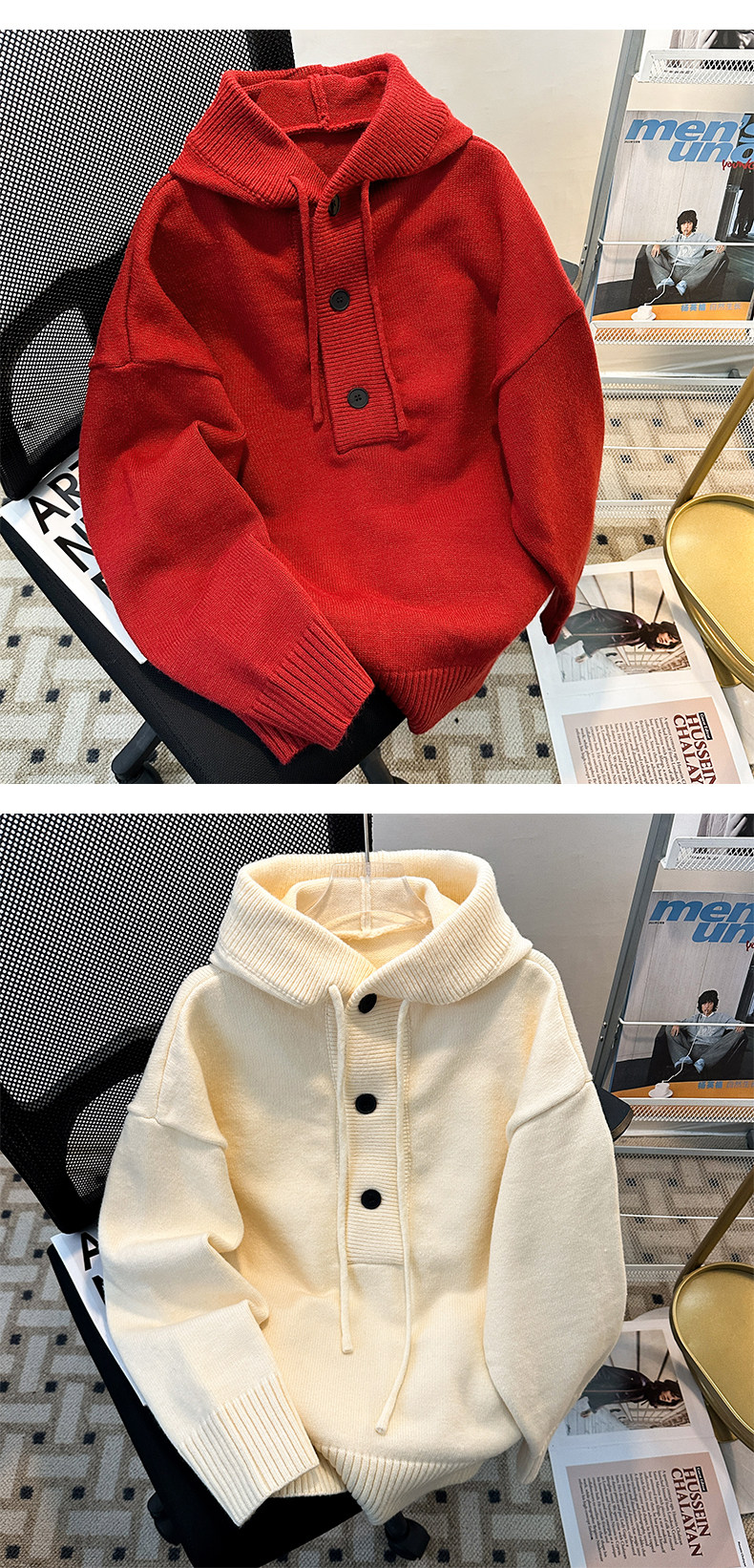 高街純色連帽針織衫男款冬季美式cleanfit保暖高級感紐釦帽衫毛衣