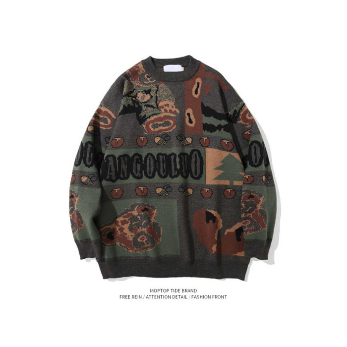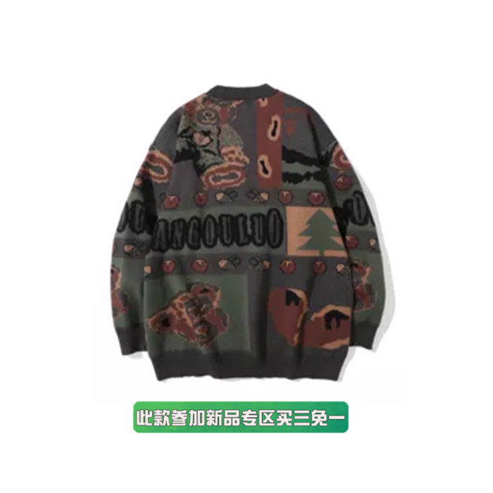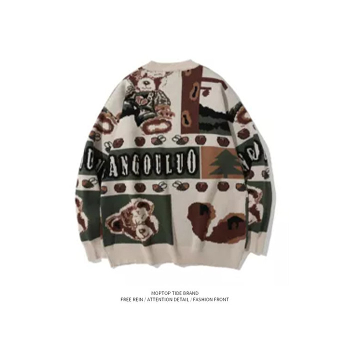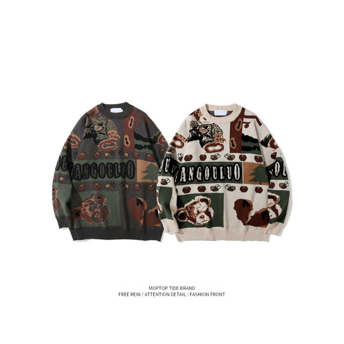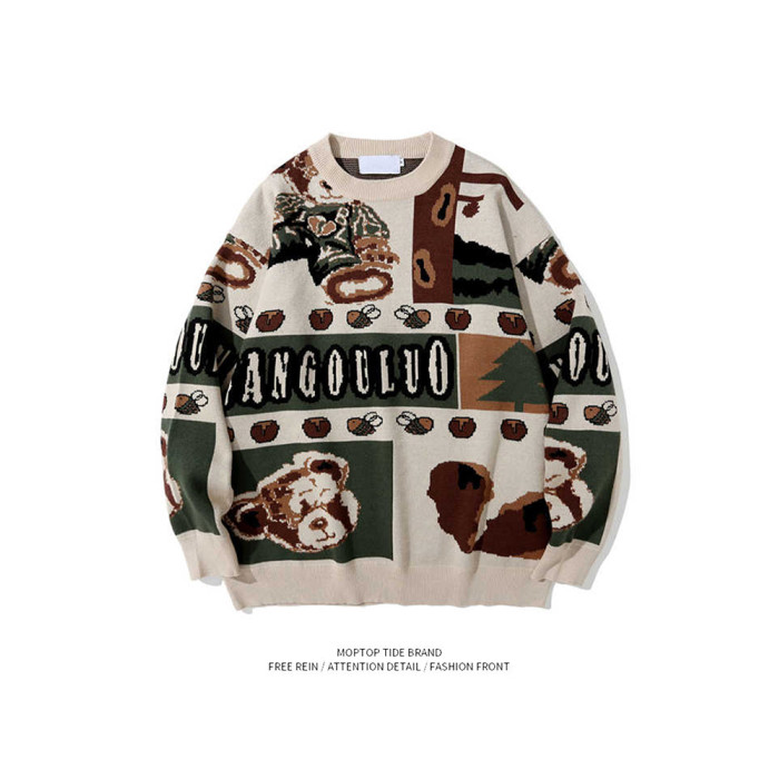 美式復古小熊毛衣男女秋冬季套頭潮牌寬松慵懶風情侶古著感針織衫