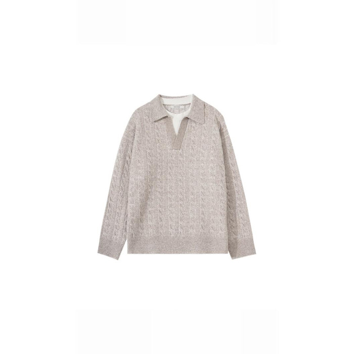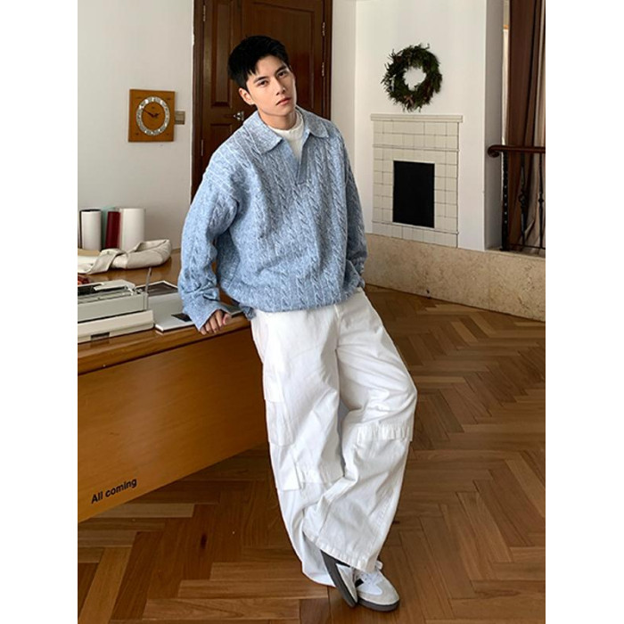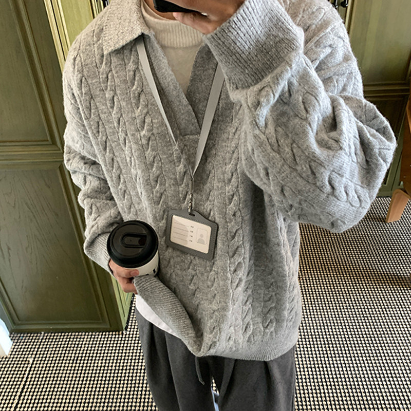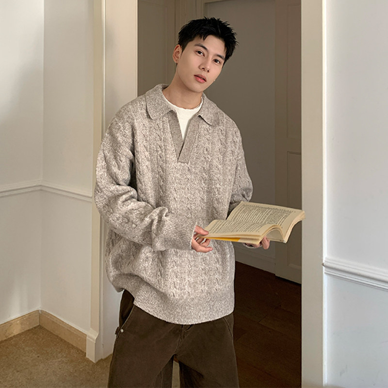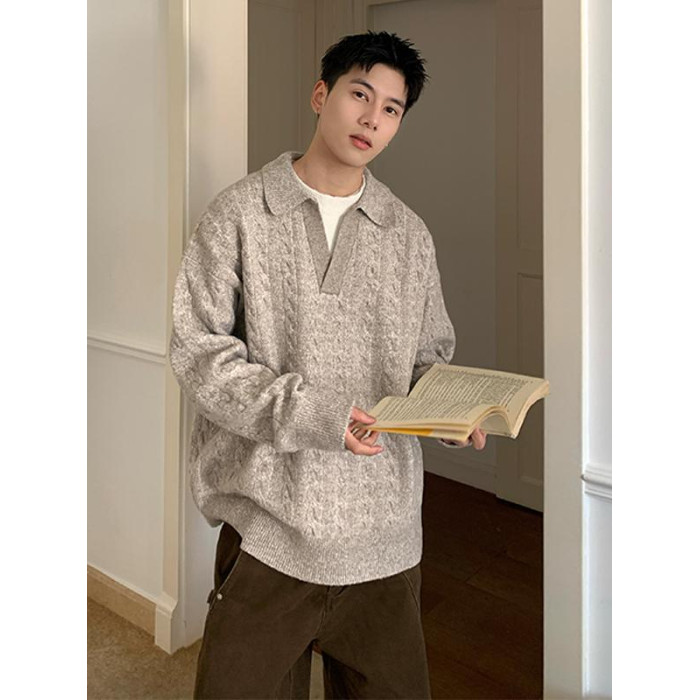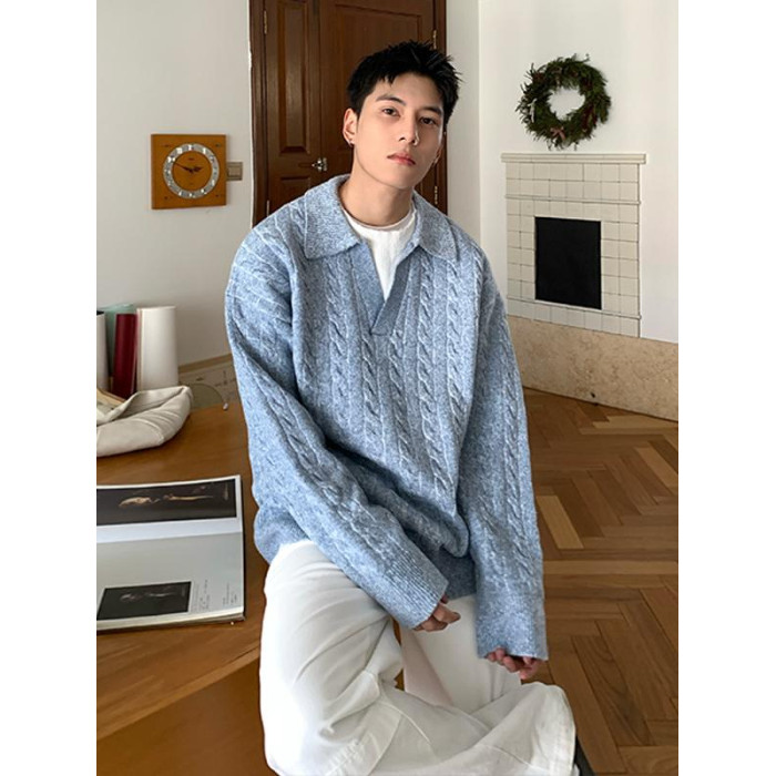 韓版假兩件翻領套頭針織衫長袖男秋季寬松純色休閒毛衣