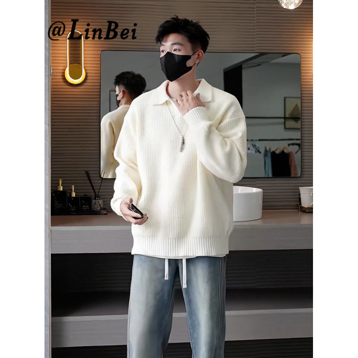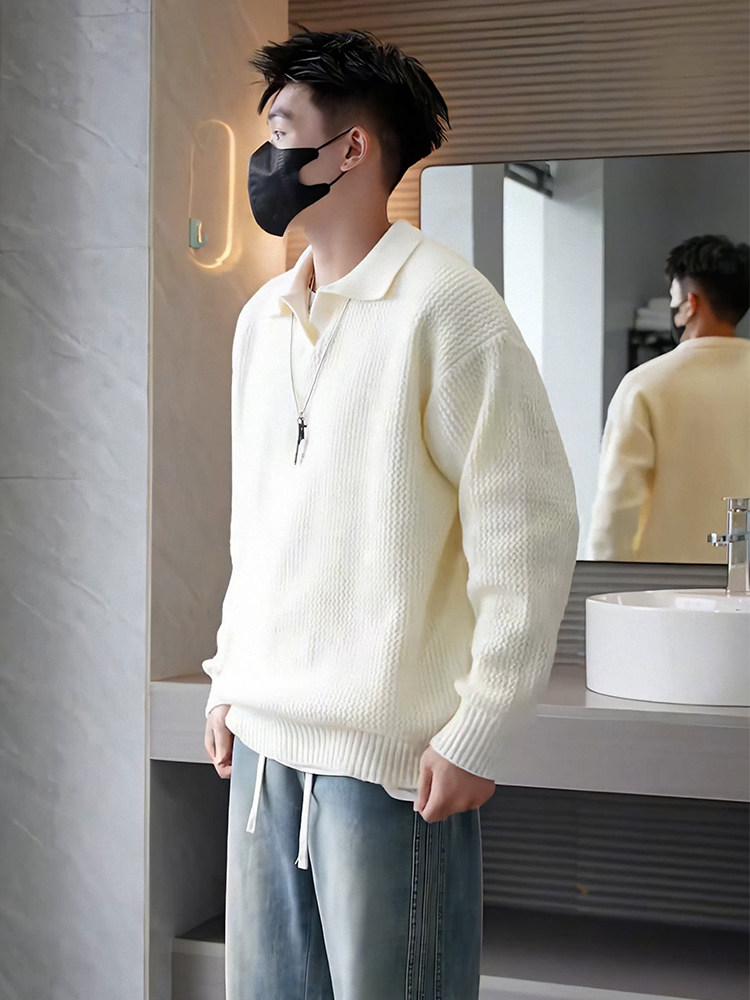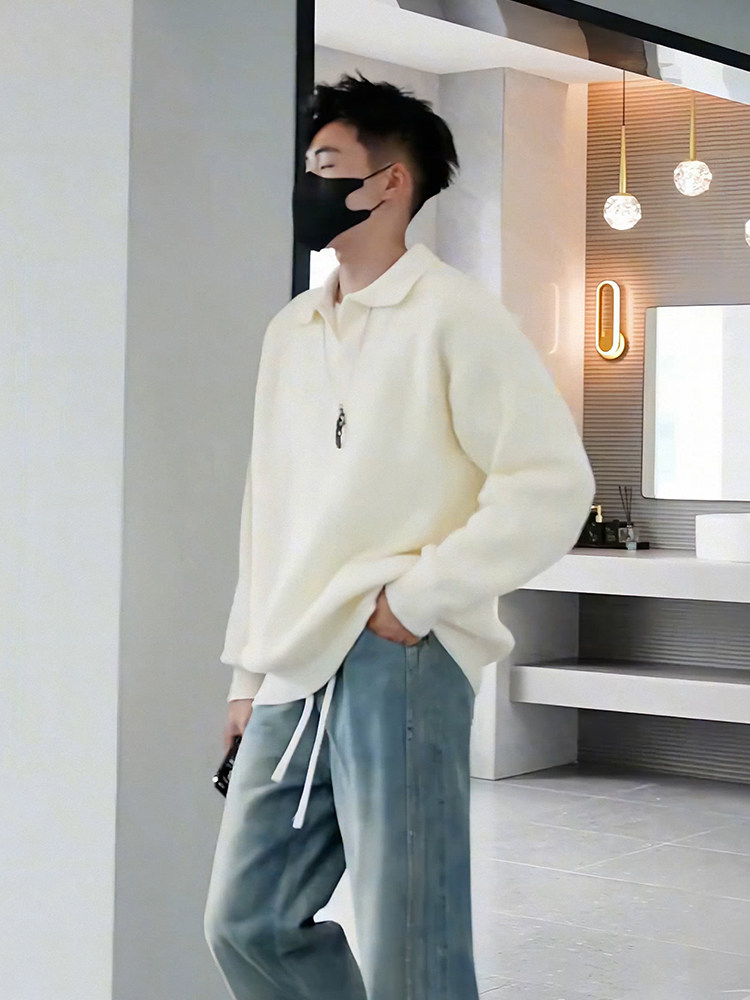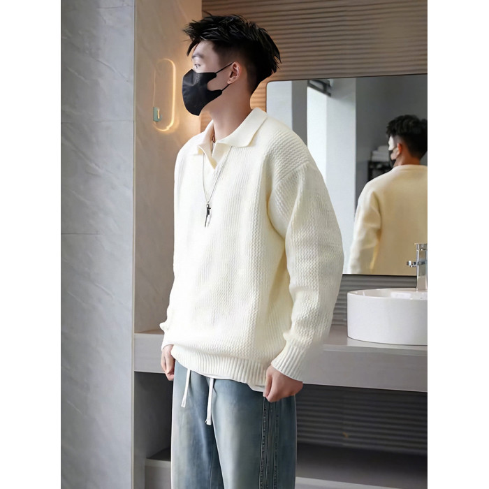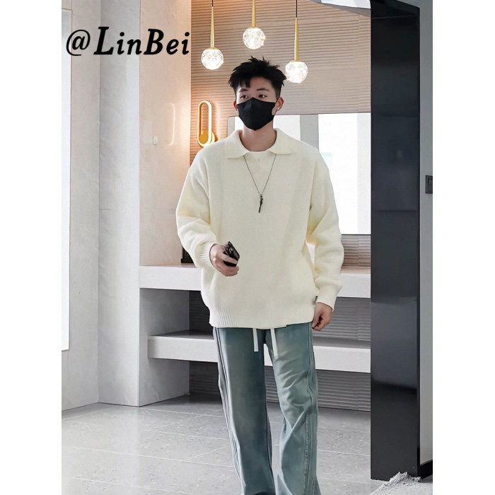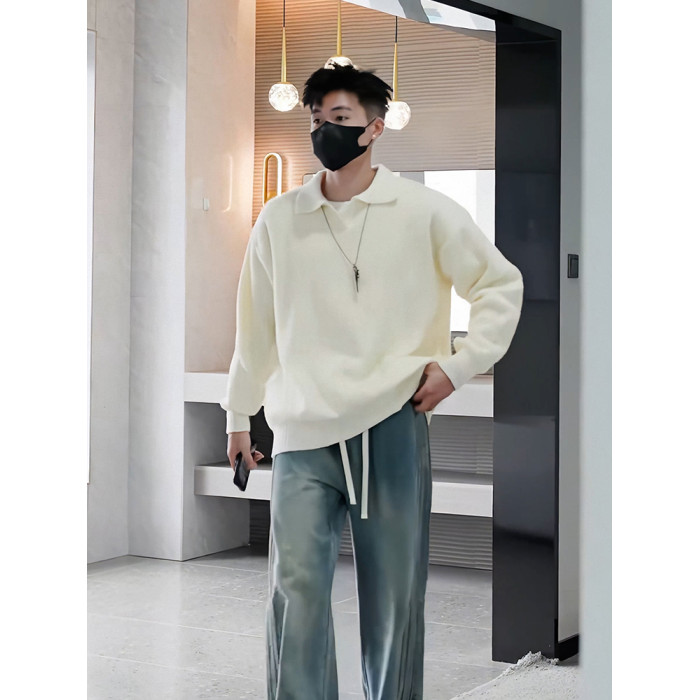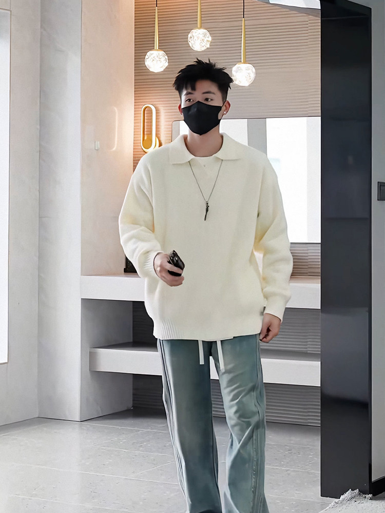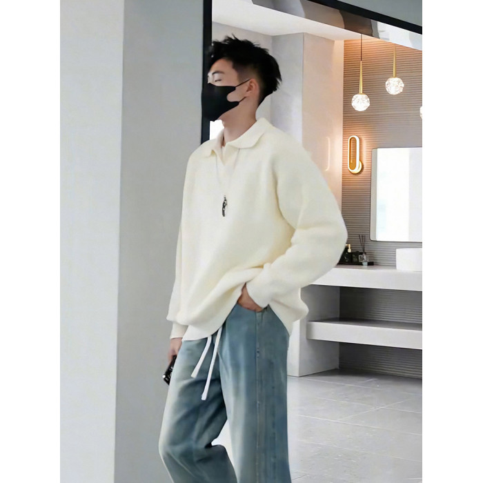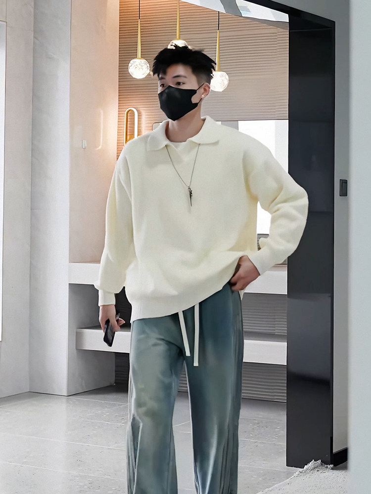 2025春季慵懶高級設計感翻領針織衫上衣男款外套Polo領杏色毛衣男
