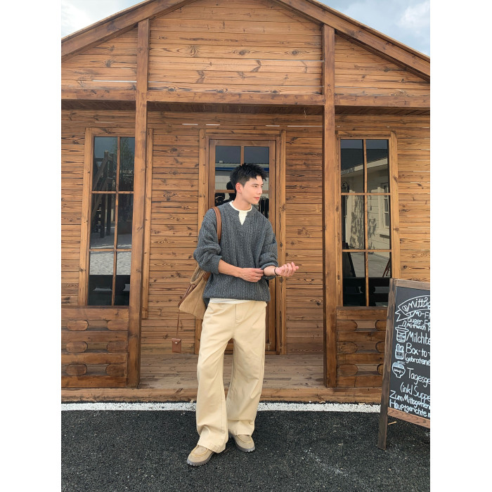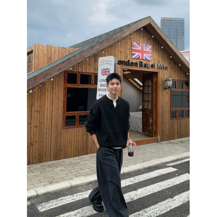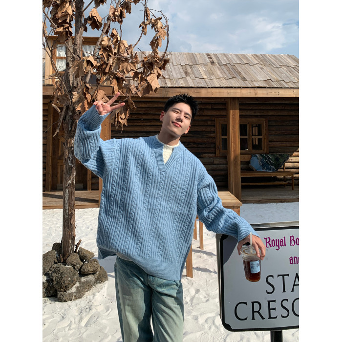 Holocene美式潮牌立體肌理感小V領套頭毛衣男純色簡約寬松針織衫