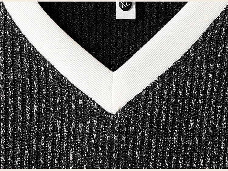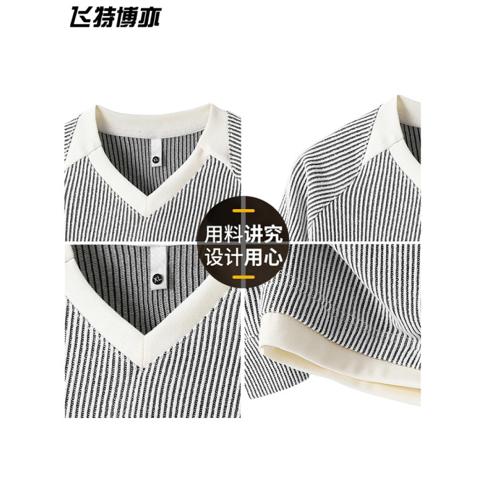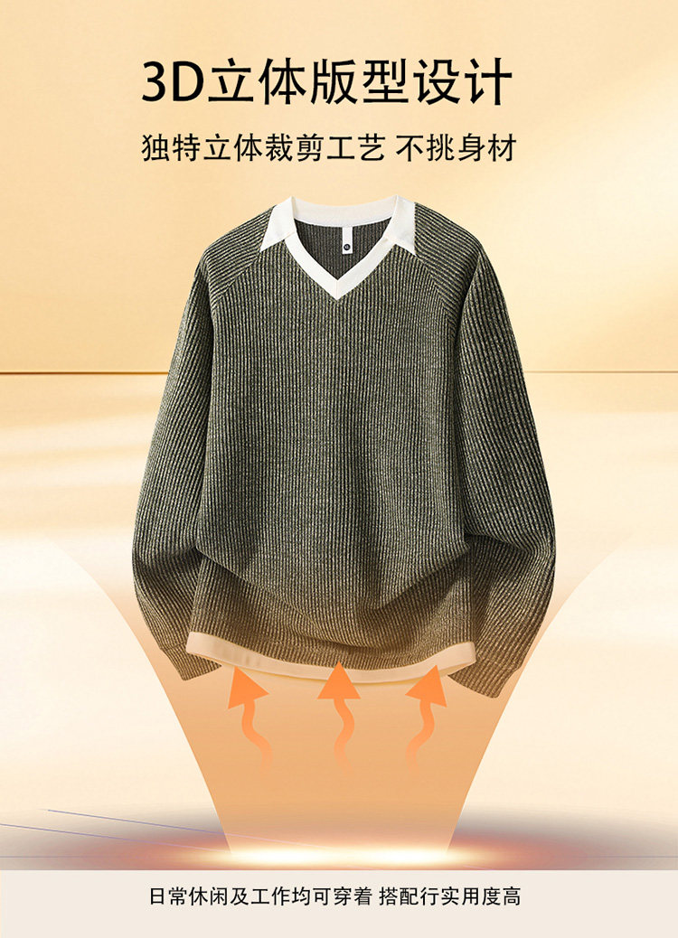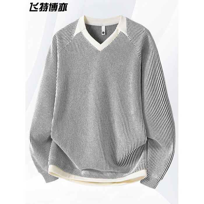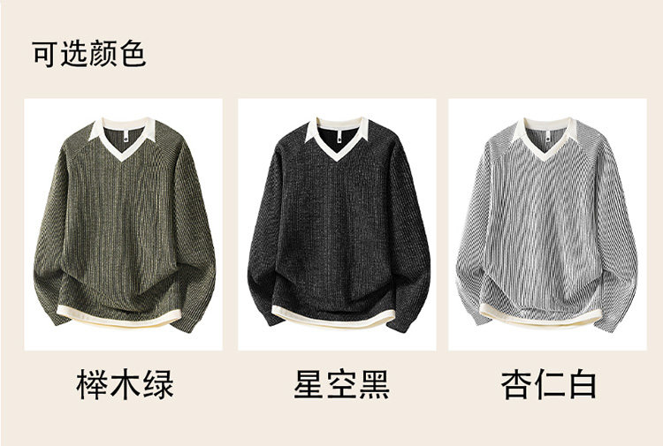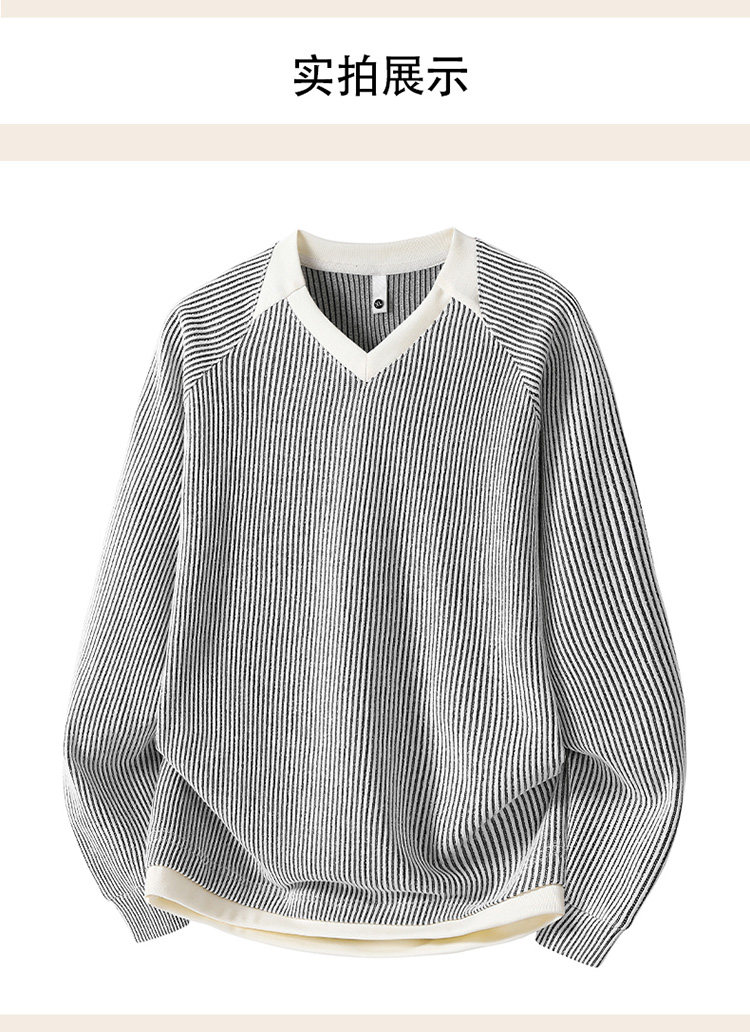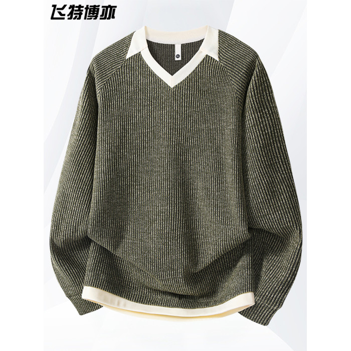 v領毛衣男款秋冬季潮流慵懶風假兩件長袖t恤加肥加大碼男裝針織衫