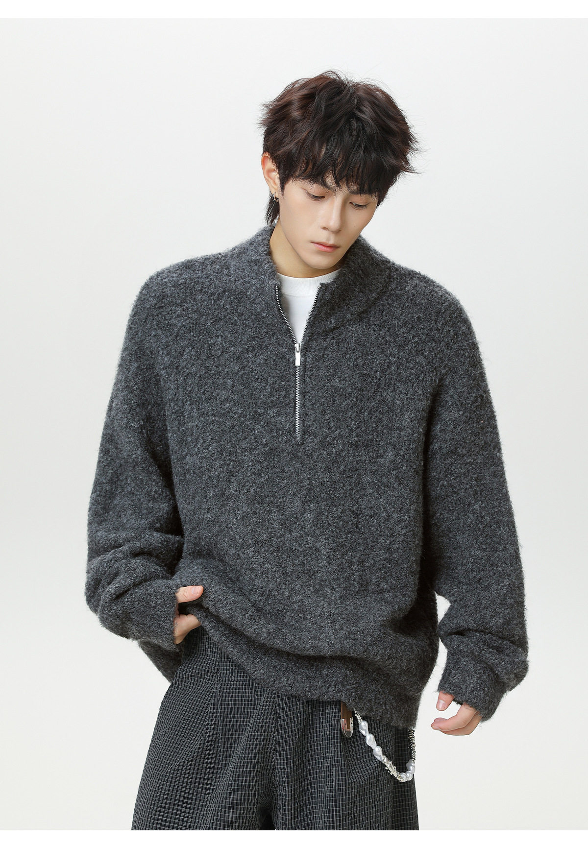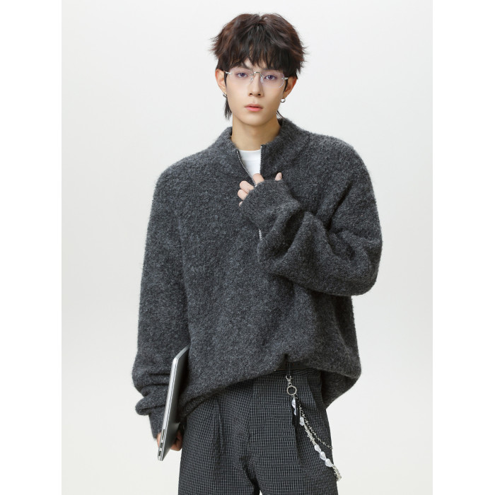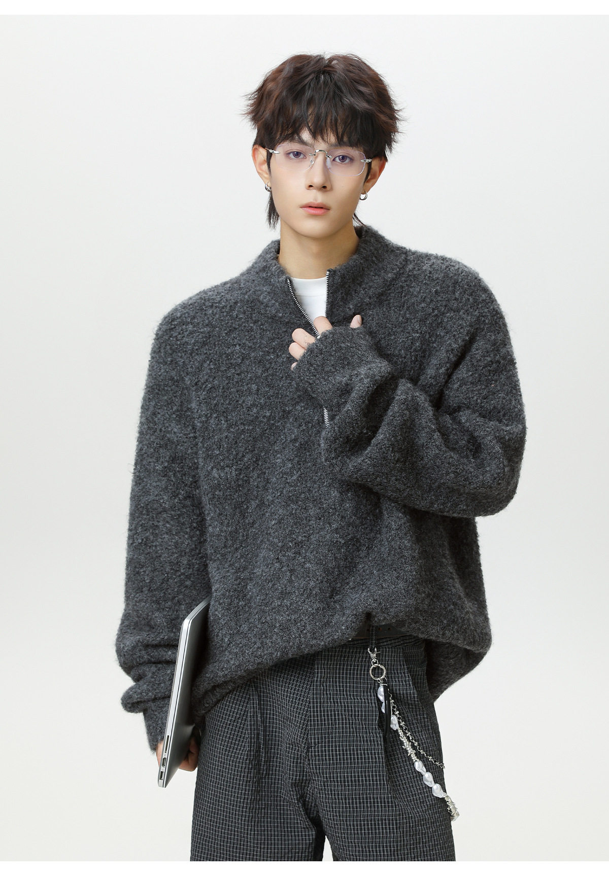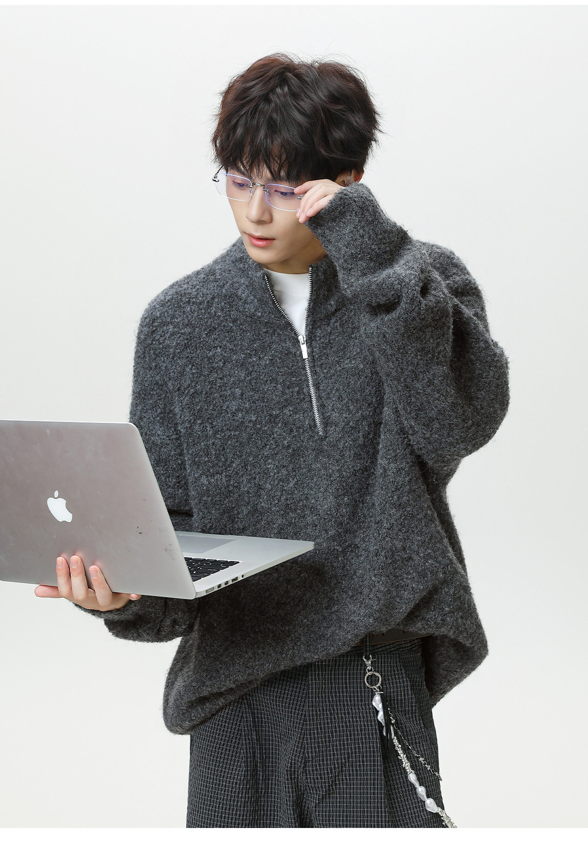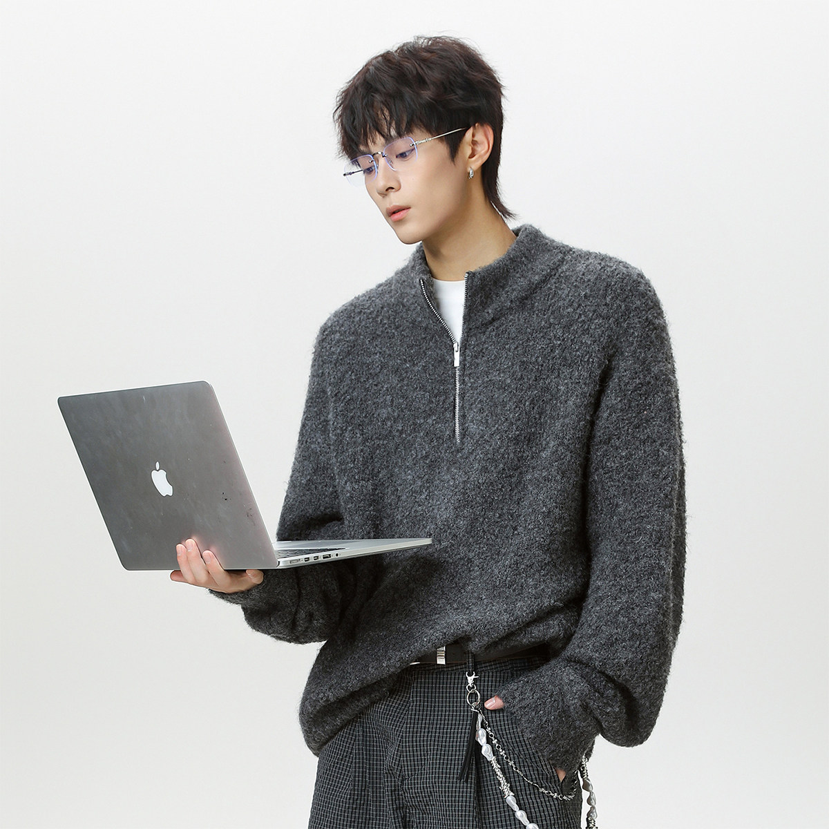 深灰色半拉鍊立領毛衣男款秋冬潮牌新款寬松慵懶風套頭針織衫外套
