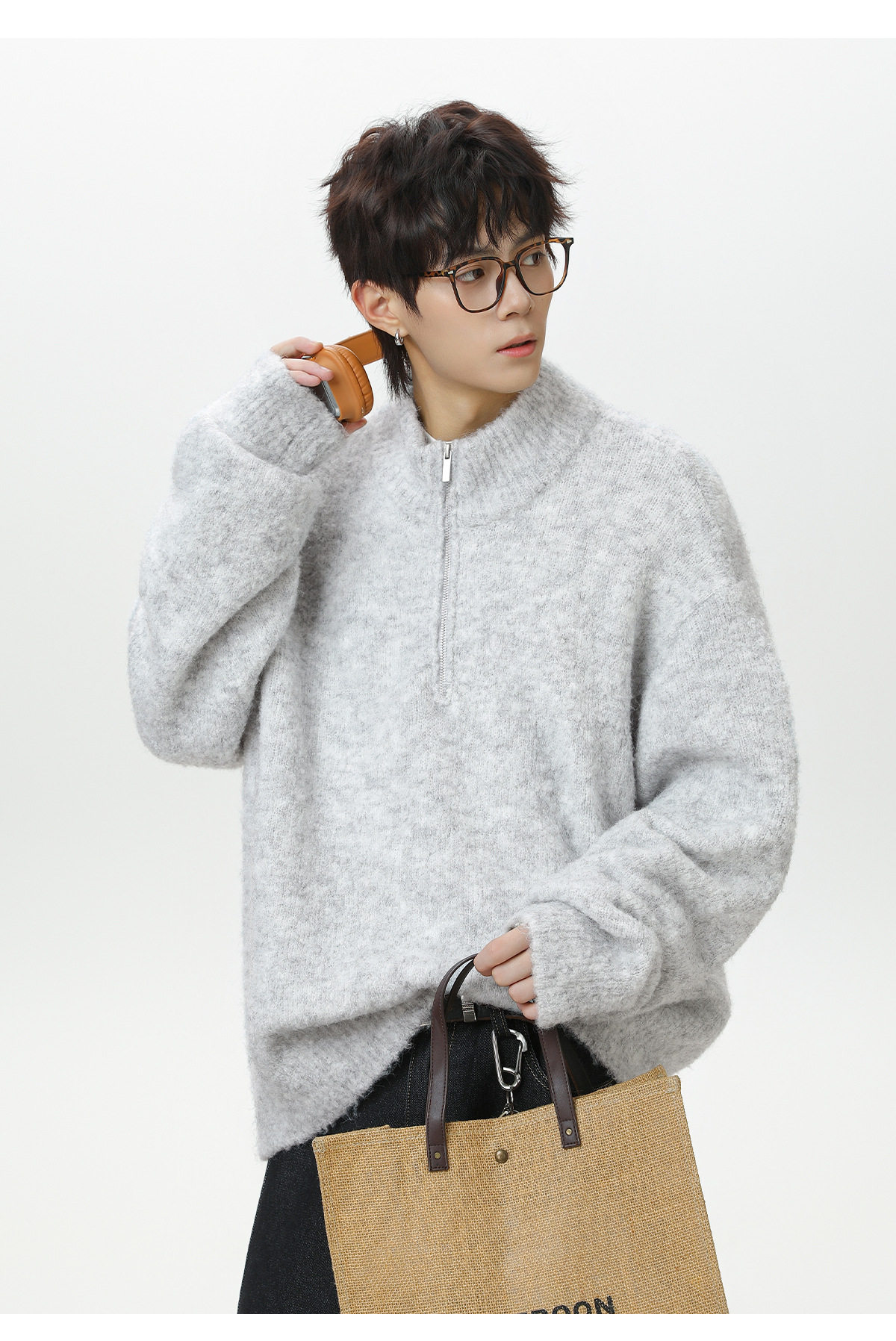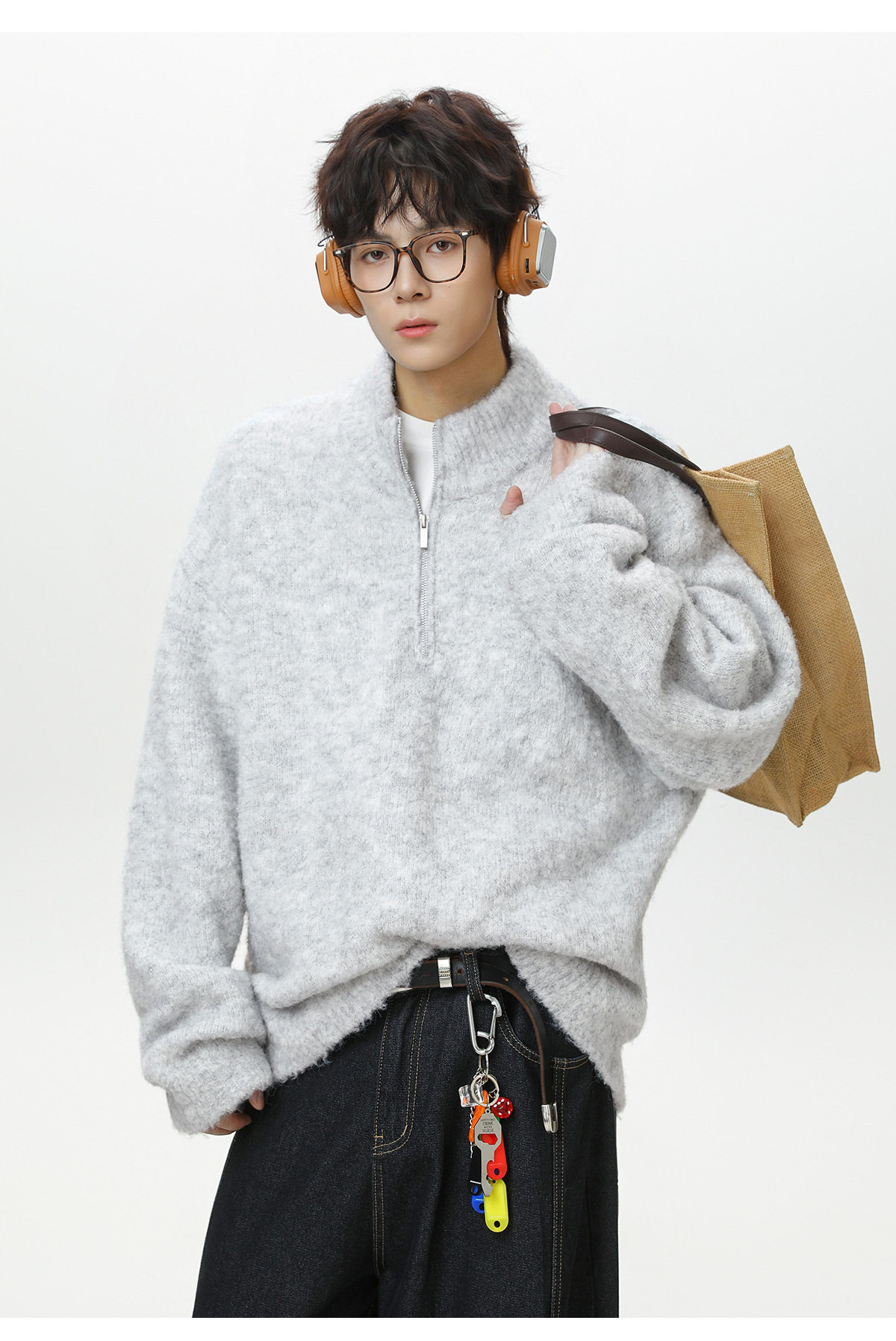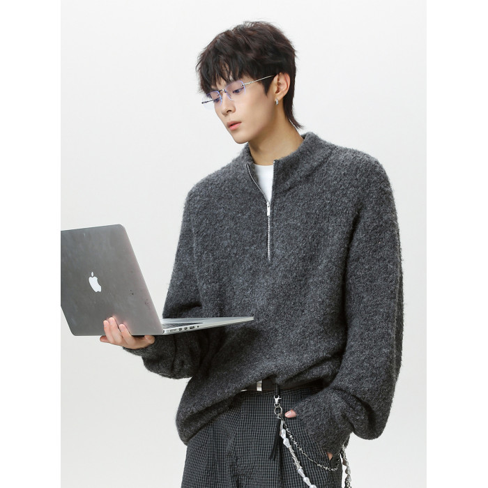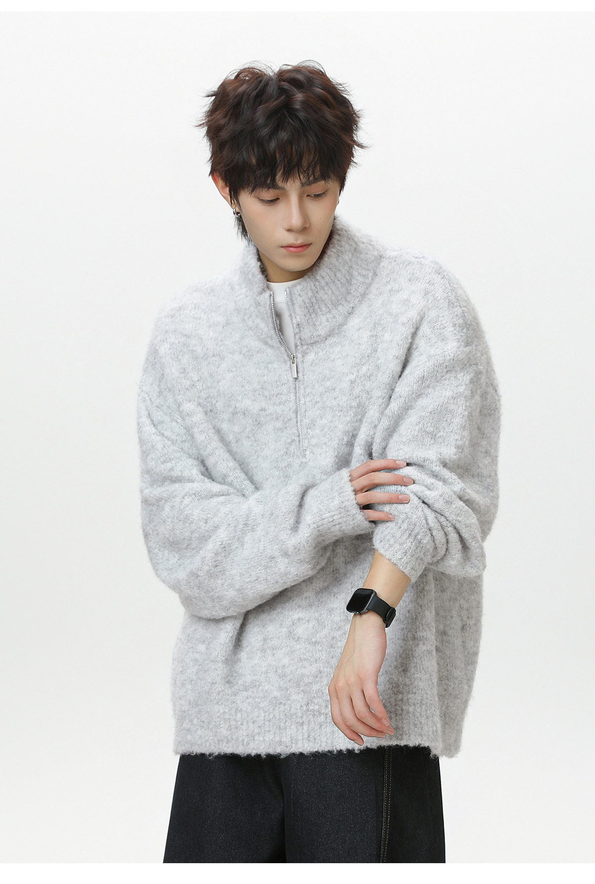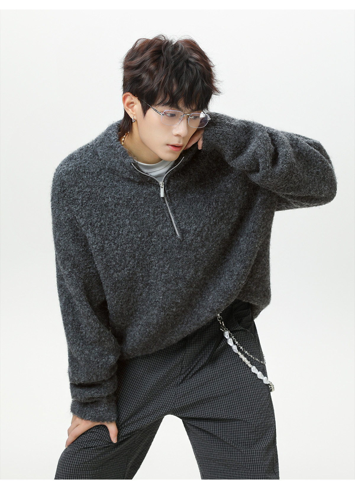 深灰色半拉鍊立領毛衣男款秋冬潮牌新款寬松慵懶風套頭針織衫外套