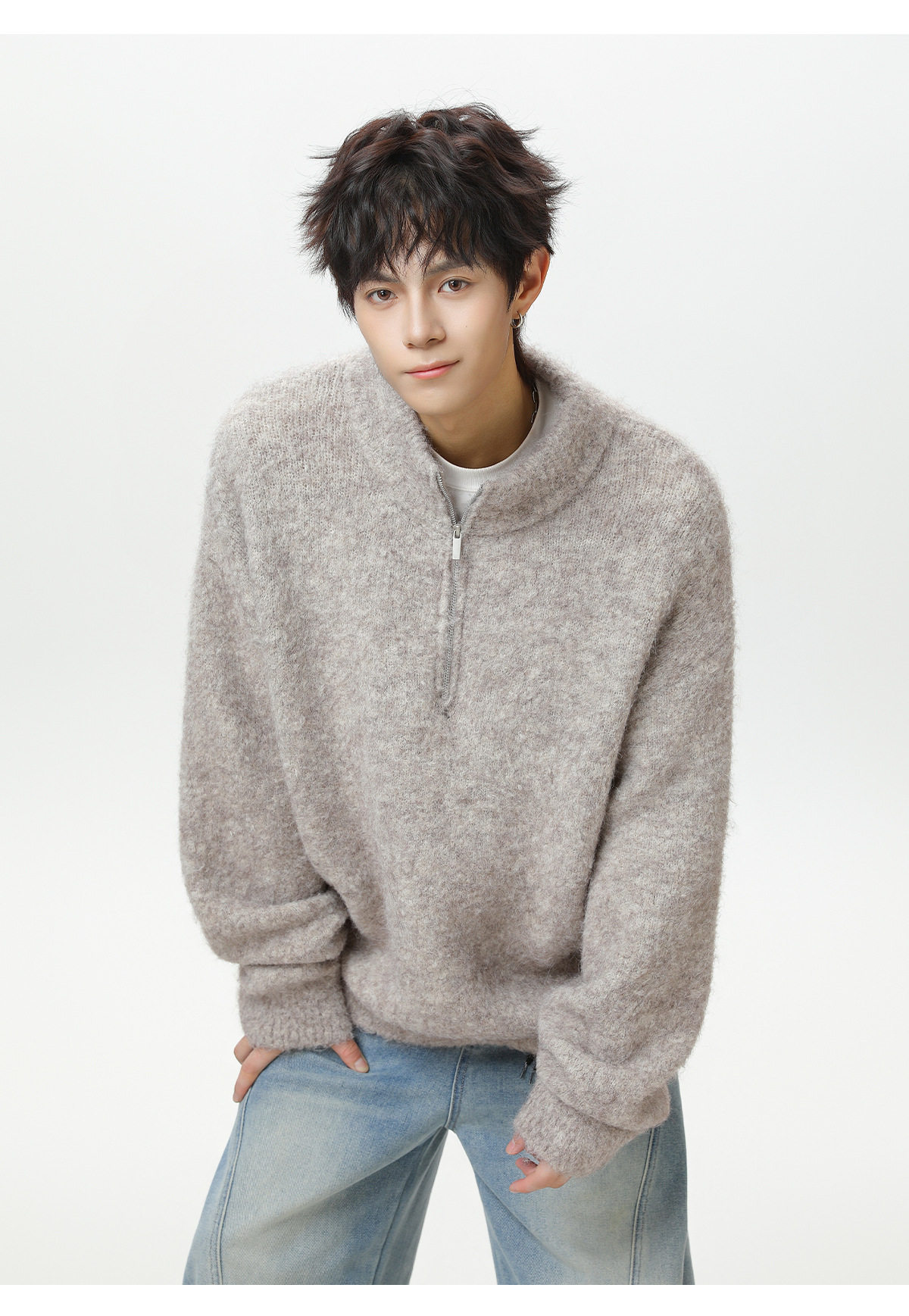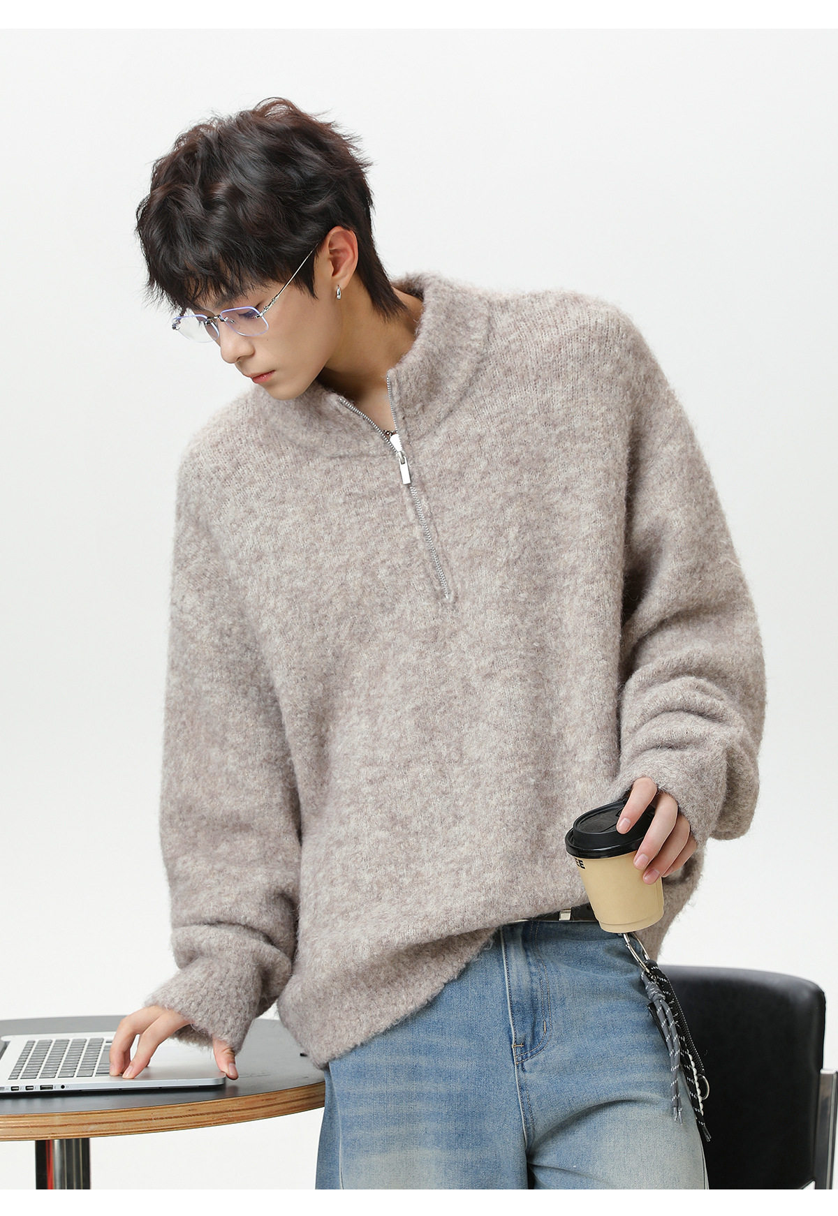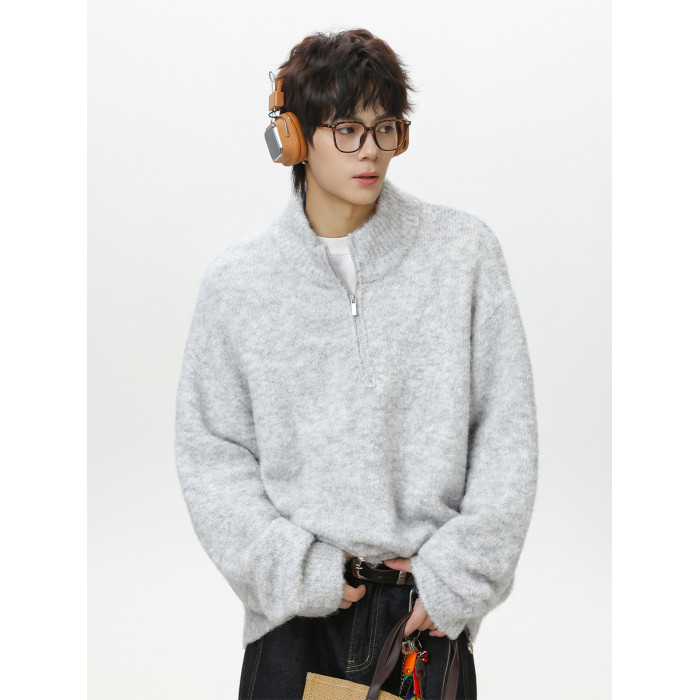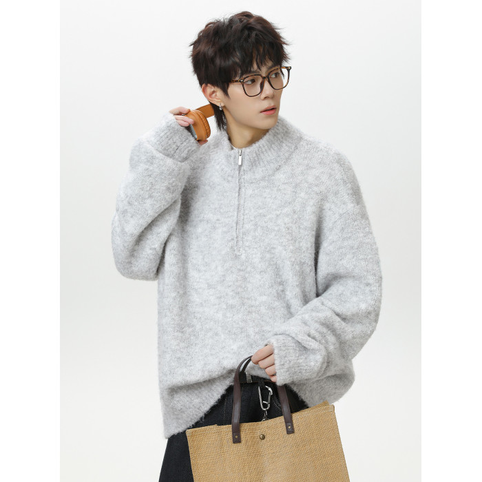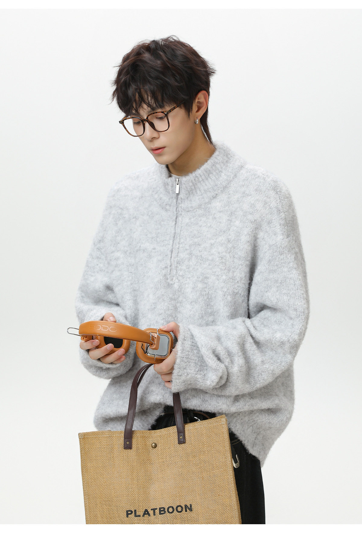 深灰色半拉鍊立領毛衣男款秋冬潮牌新款寬松慵懶風套頭針織衫外套